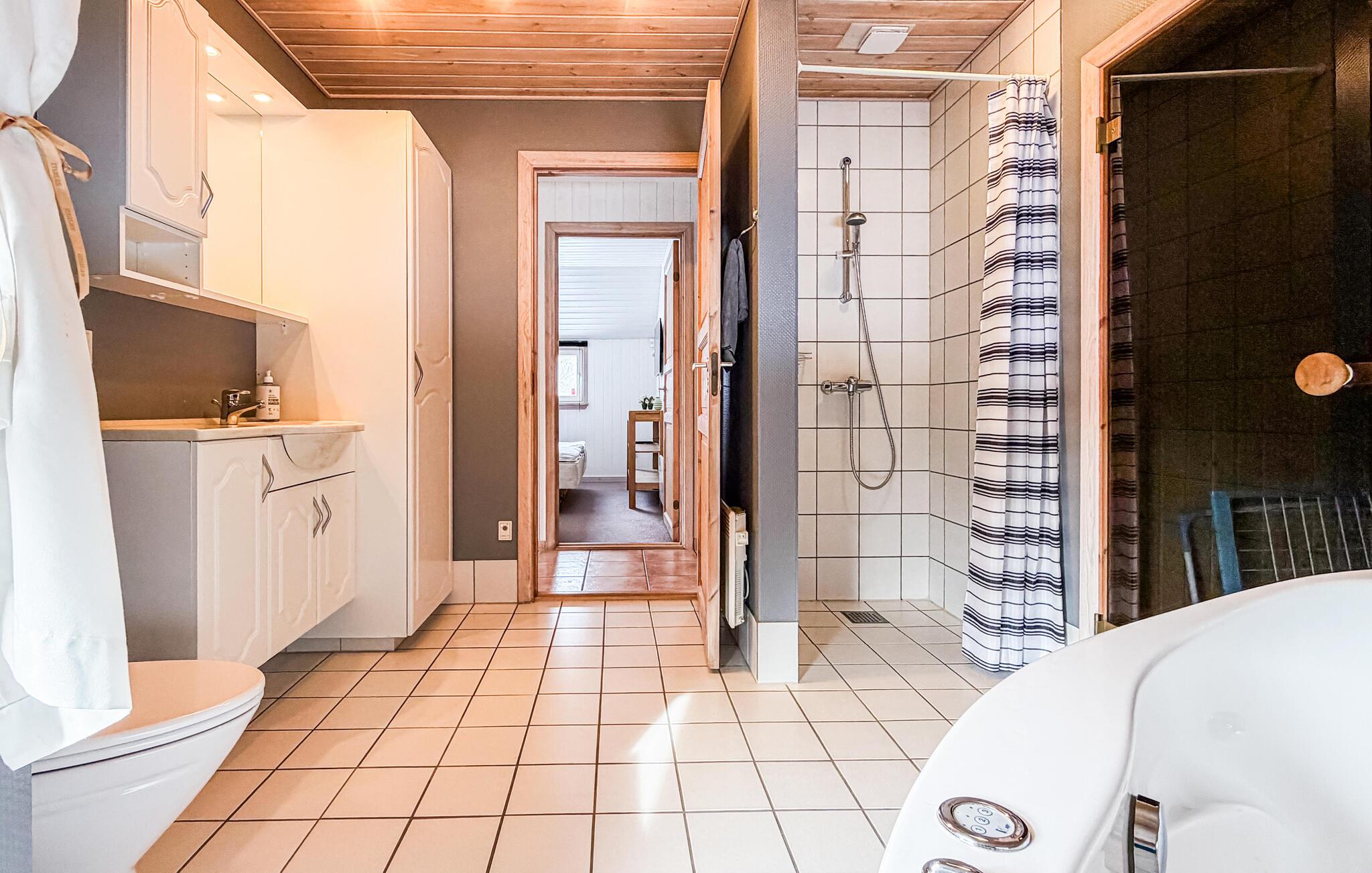 Auf einem großen und sichtgeschützten Grundstück in Jegum Ferieland liegt dieses schöne Ferienhaus. Es ist schön und gemütlich eingerichtet und bietet guten Komfort, u.a. ein großes Badezimmer mit Whirlpool für zwei Personen und Zugang zur Sauna. Badezimmer und Wohnküche sind mit Fußbodenheizung ausgestattet. Vom Wohnraum haben Sie Zugang zur großen, teilweise überdachten Terrasse, die sich vor die Breitseite des Hauses legt. Im Abstellraum am Haus können z.B. Fahrräder aufbewahrt werden, packen Sie sie also zum Urlaubsgepäck. Das Haus ist mit Alarmanlage gesichert. Jegum Ferieland in familienfreundlich, es sind Spielplatz, Minigolf, Tennisplatz, Fußballplatz, Hüpfkissen, Gillhütte, Ziegen zum Streicheln, ein Lebensmittelgeschäft und ein Café vorhanden. Nicht weit entfernt, können Sie in Oksbøl das Panzer- und Feuerwehrmuseum besichtigen. Nicht weit von Ho liegt auch das Tirpitz-Museum.