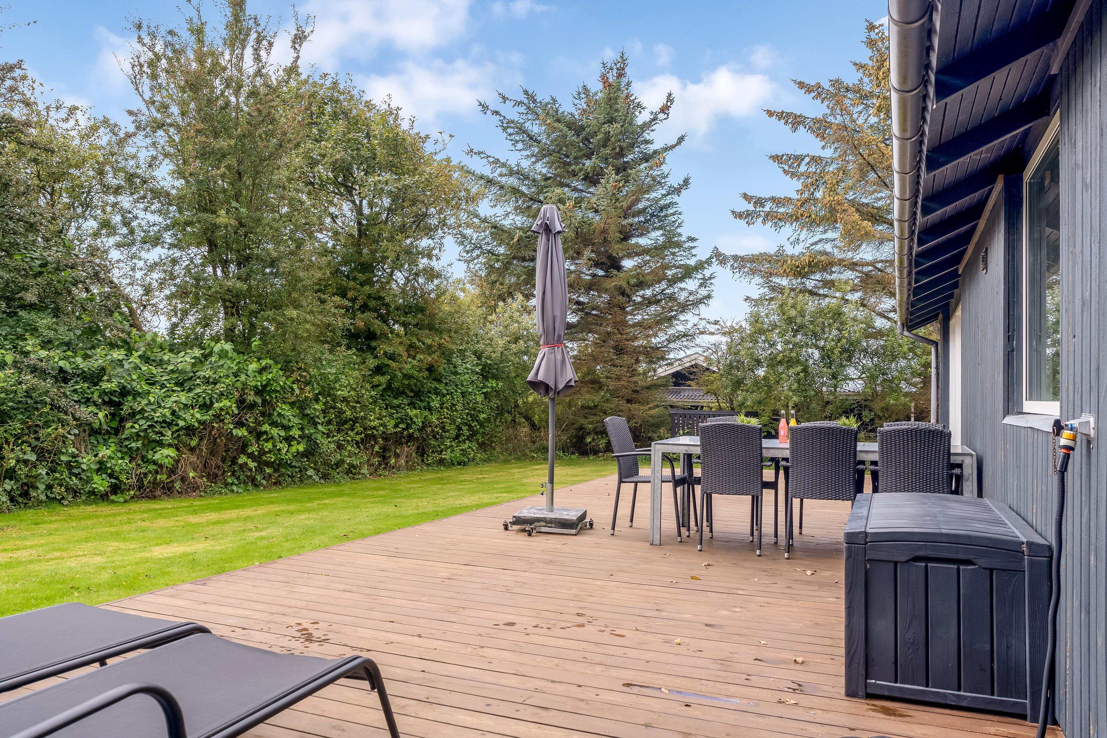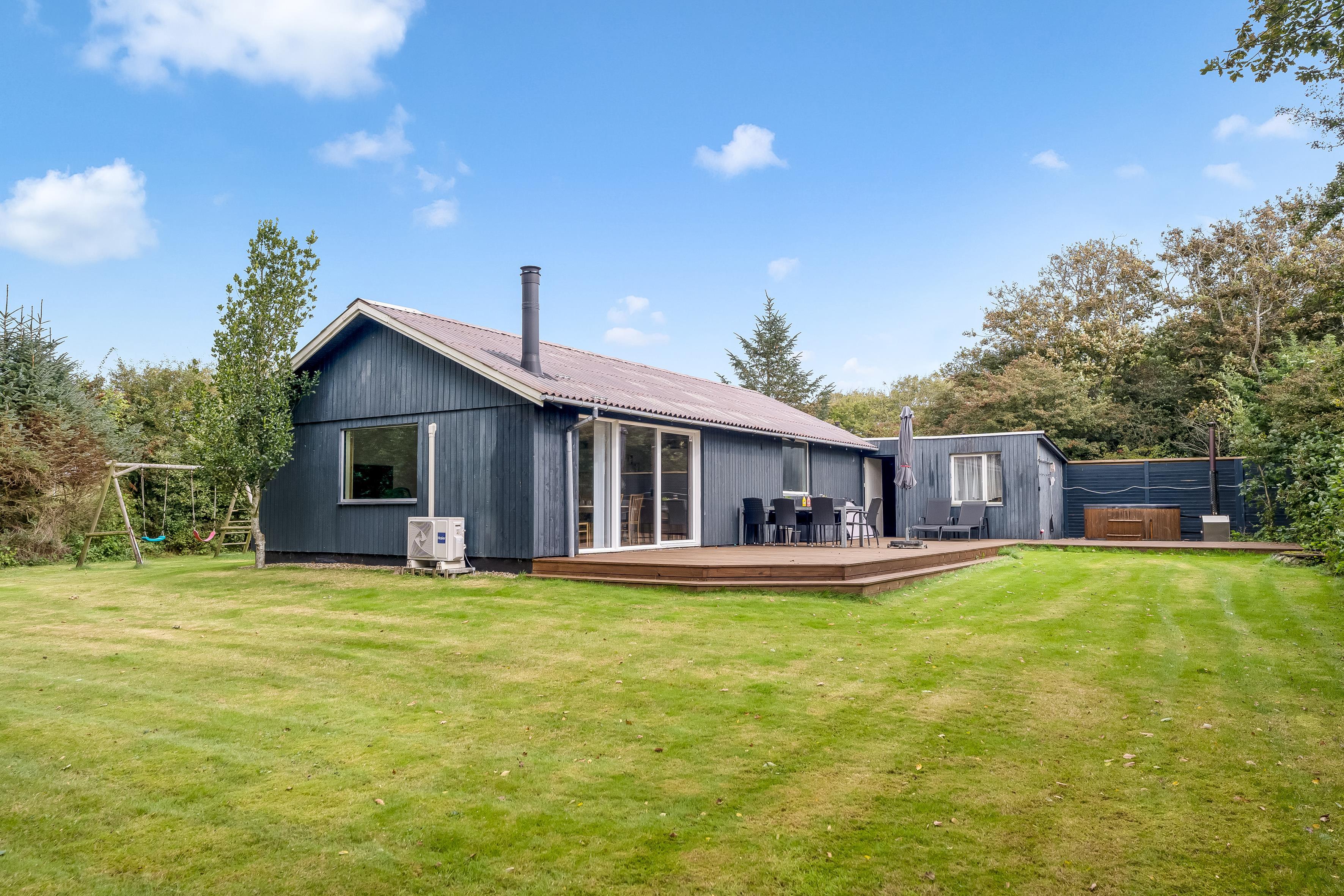 Outside you can enjoy the large terrace, where there is a barbecue for cozy barbecue evenings. For those who want to pamper themselves, there is a wilderness bath that can accommodate up to 5 people - perfect for relaxing under the stars. The nearby beach is only 400 meters away, making it easy to enjoy sun, sand and water activities.