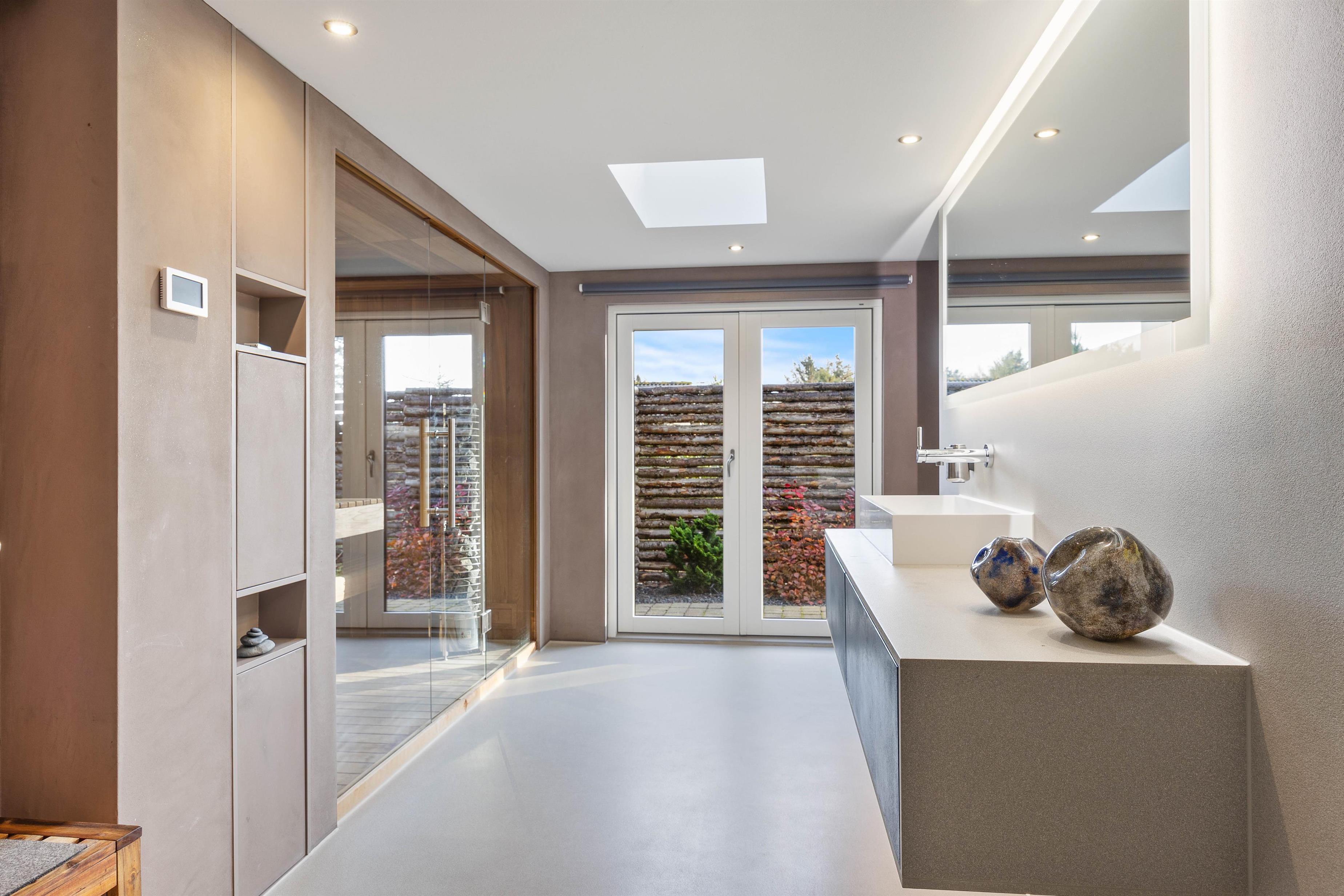 The spacious bathroom is beautifully appointed with a rainfall shower and sauna where you can truly unwind. The sauna features a glass front, creating a bright, spacious feel with views over the natural grounds.