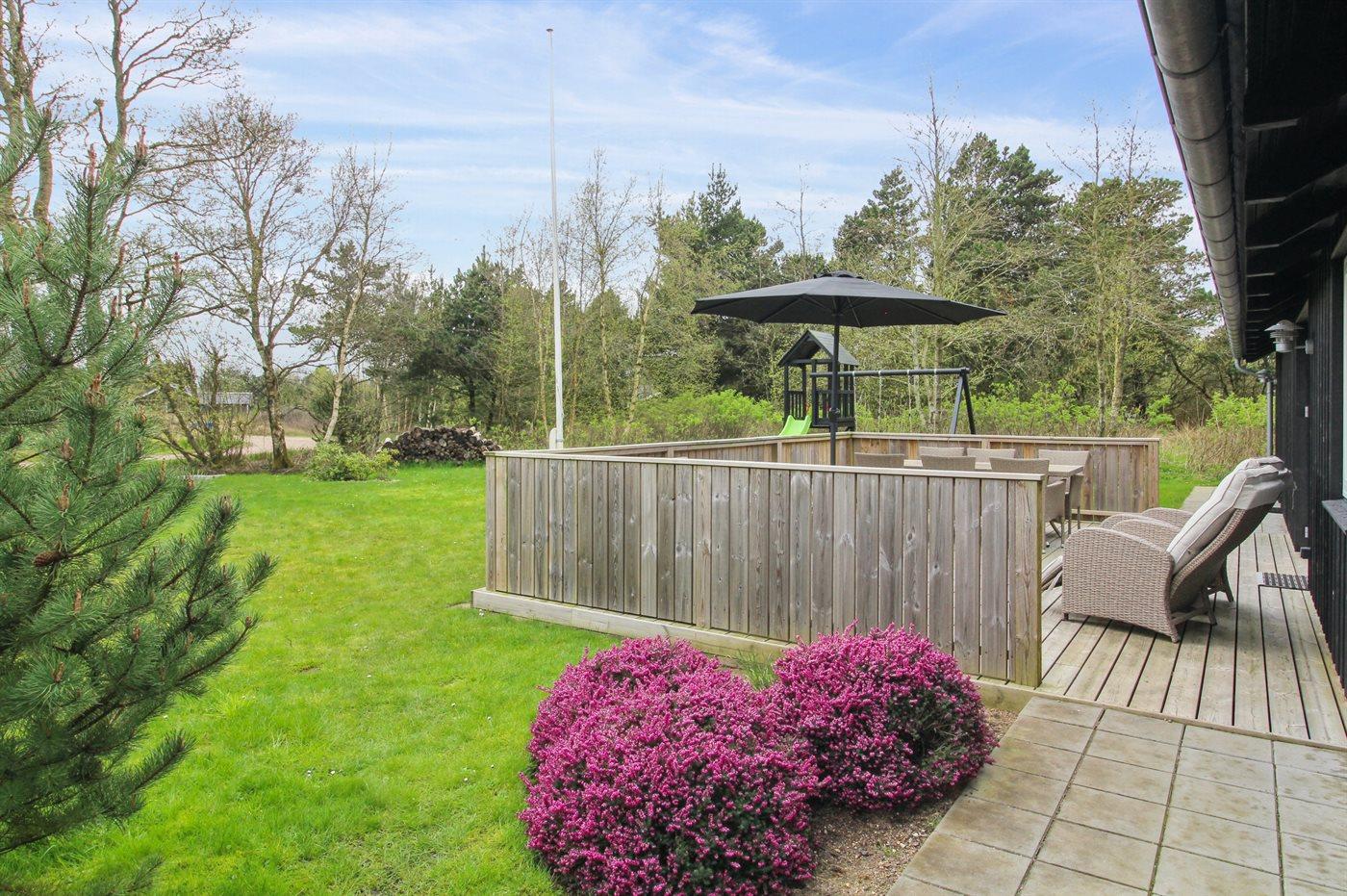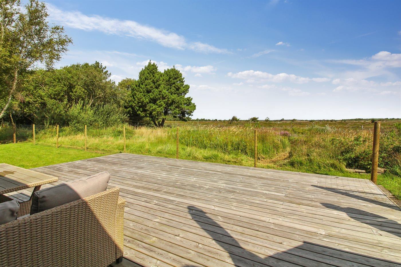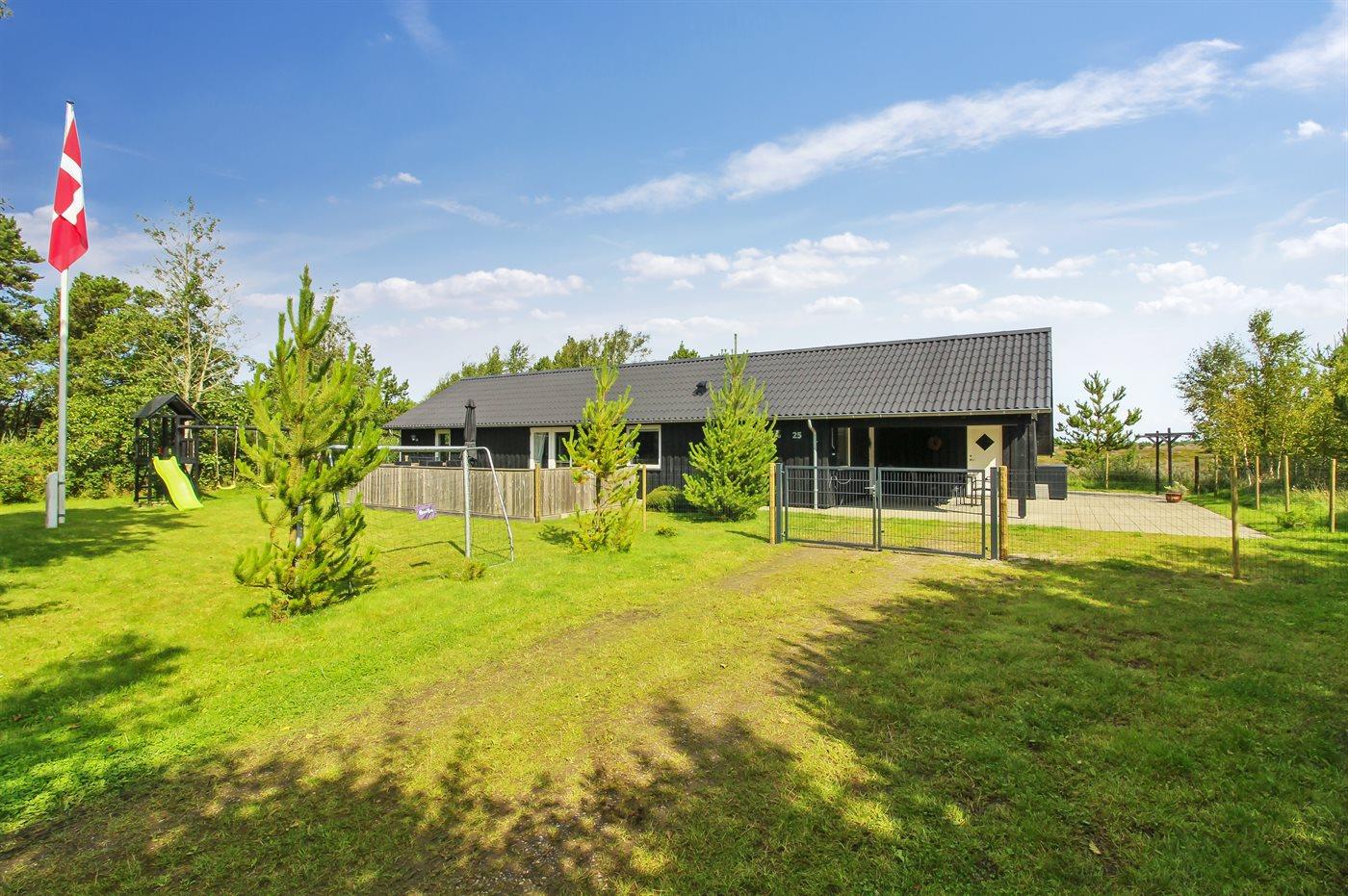 The holiday home is situated on a 2500 m² natural site. Situated 2500 m from the sea. Situated 1500 m from the Wadden Sea. Nearest shop is 4000 m away. You will find a golf course in a distance of 7000 m. A terrace belong to the holiday home. Swing. Sandbox. Play tower. Slide. Football goal. Barbecue at your disposal. Carport is at your disposal. Plug for charging electric car is available. Charging socket type 2. With 11 kW power output. Parking place by the holiday home.