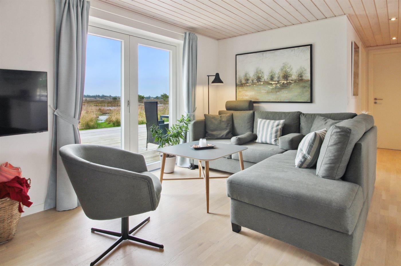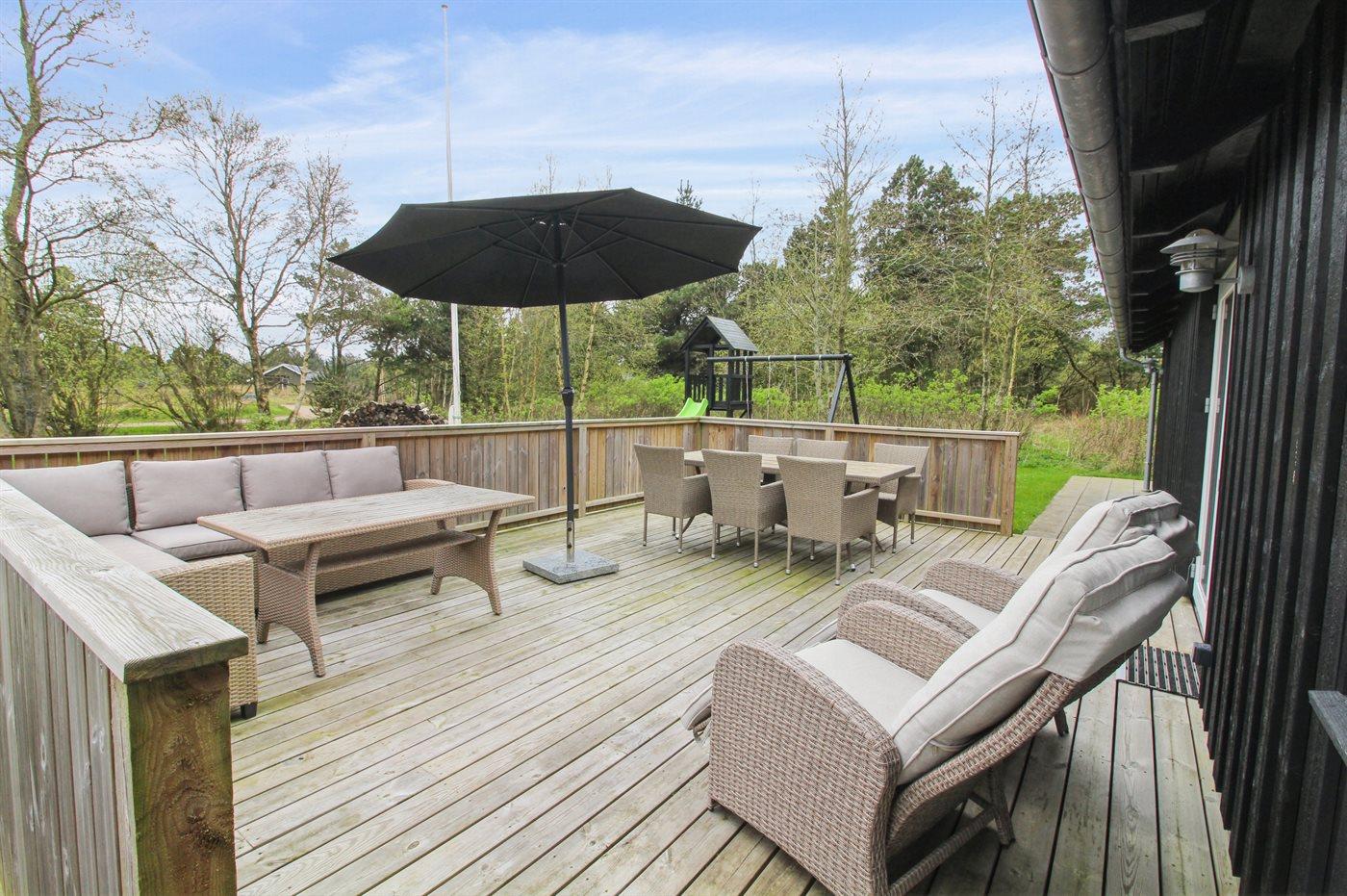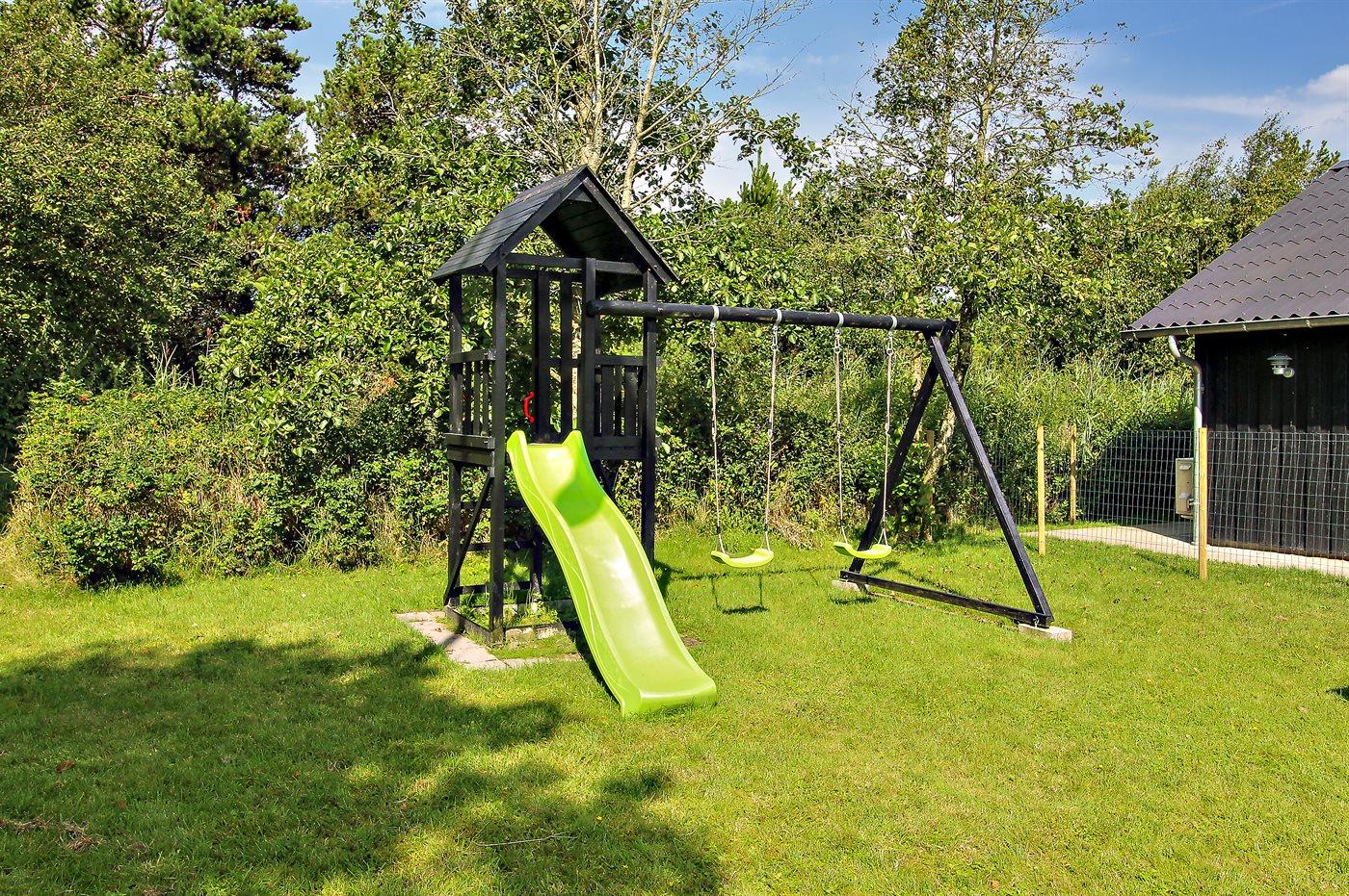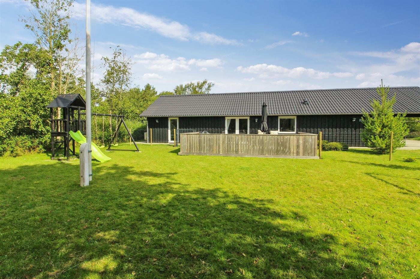 The holiday home is situated on a 2500 m² natural site. Situated 2500 m from the sea. Situated 1500 m from the Wadden Sea. Nearest shop is 4000 m away. You will find a golf course in a distance of 7000 m. A terrace belong to the holiday home. Swing. Sandbox. Play tower. Slide. Football goal. Barbecue at your disposal. Carport is at your disposal. Plug for charging electric car is available. Charging socket type 2. With 11 kW power output. Parking place by the holiday home.