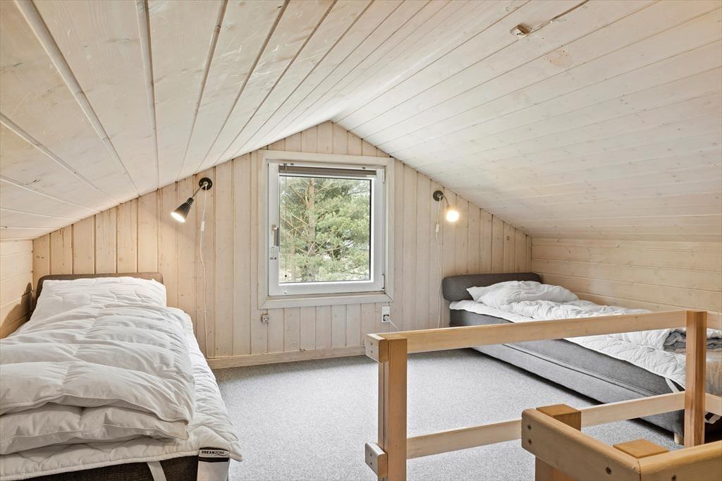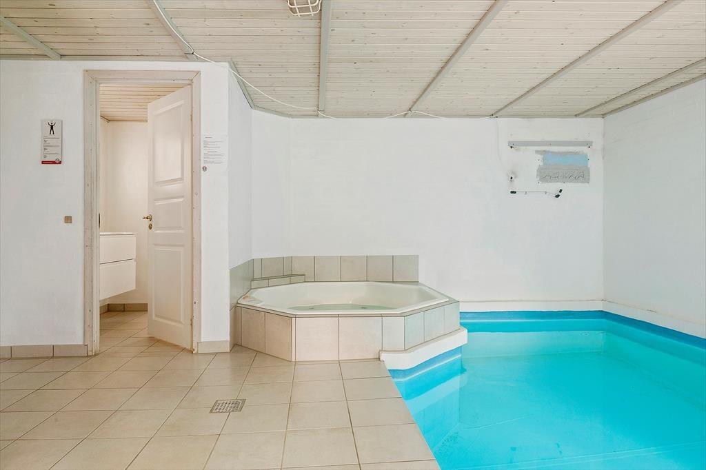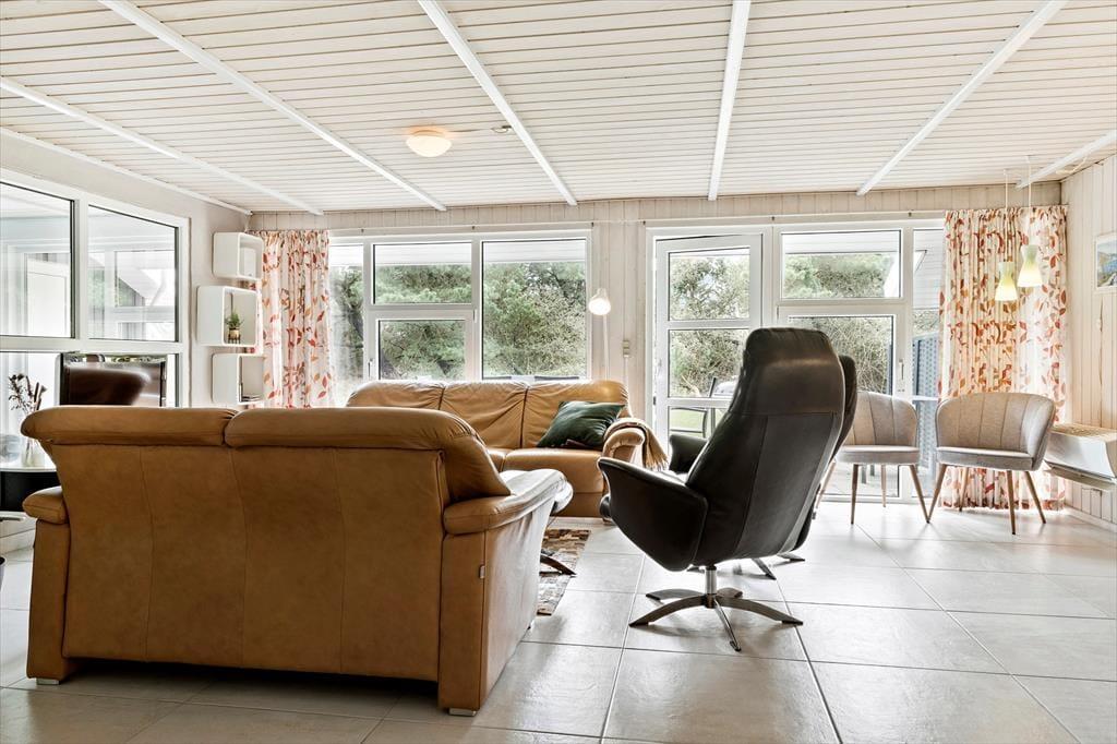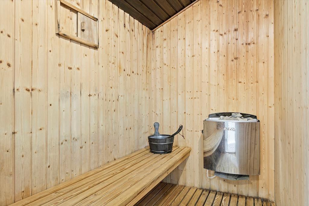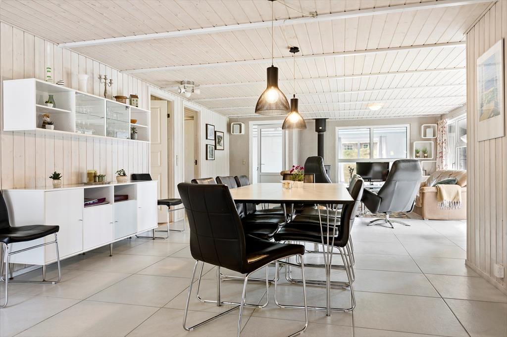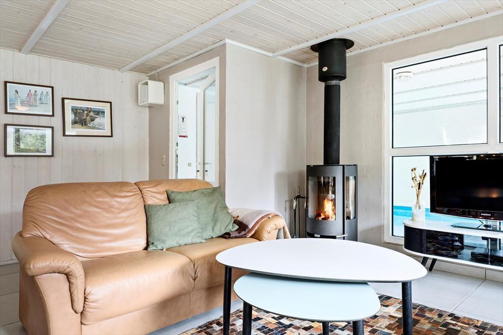 Im Inneren des Ferienhauses gibt es viel Platz zum Spielen und Entspannen, denn es verfügt über ganze 150 m² Wohnfläche. Die Raumaufteilung bietet unter anderem vier gute Schlafzimmer. Darüber hinaus gibt es eine Dachnische mit Matratzen für die jüngsten Urlauber, sodass insgesamt Schlafmöglichkeiten für 10 Personen vorhanden sind. Wenn du mit mehreren Personen Urlaub machst, ist es von Vorteil, dass es im Haus zwei Badezimmer gibt. Das eine ist mit einer Waschmaschine ausgestattet, während sich das andere im Poolbereich des Hauses befindet und über eine Sauna sowie einen schönen Whirlpool für 5 Personen verfügt. Wenn du im Pool planschst, kannst du durch das große Fenster den Blick auf den grünen Garten genießen. Vom Poolbereich aus gibt es auch ein Fenster ins Wohnzimmer – wenn also nur die Kinder Lust auf das nasse Element haben, können die Erwachsenen sie vom Sofabereich aus im Auge behalten. Das Wohnzimmer ist geschmackvoll mit schönen Ledermöbeln, Esstisch und Flachbildfernseher eingerichtet, und für die kühlen Tage gibt es sowohl einen Brennofen als auch eine Wärmepumpe. Vom Wohnzimmer aus besteht zudem eine offene Verbindung zur gut ausgestatteten Küche, die 2019 erweitert und komplett renoviert wurde.