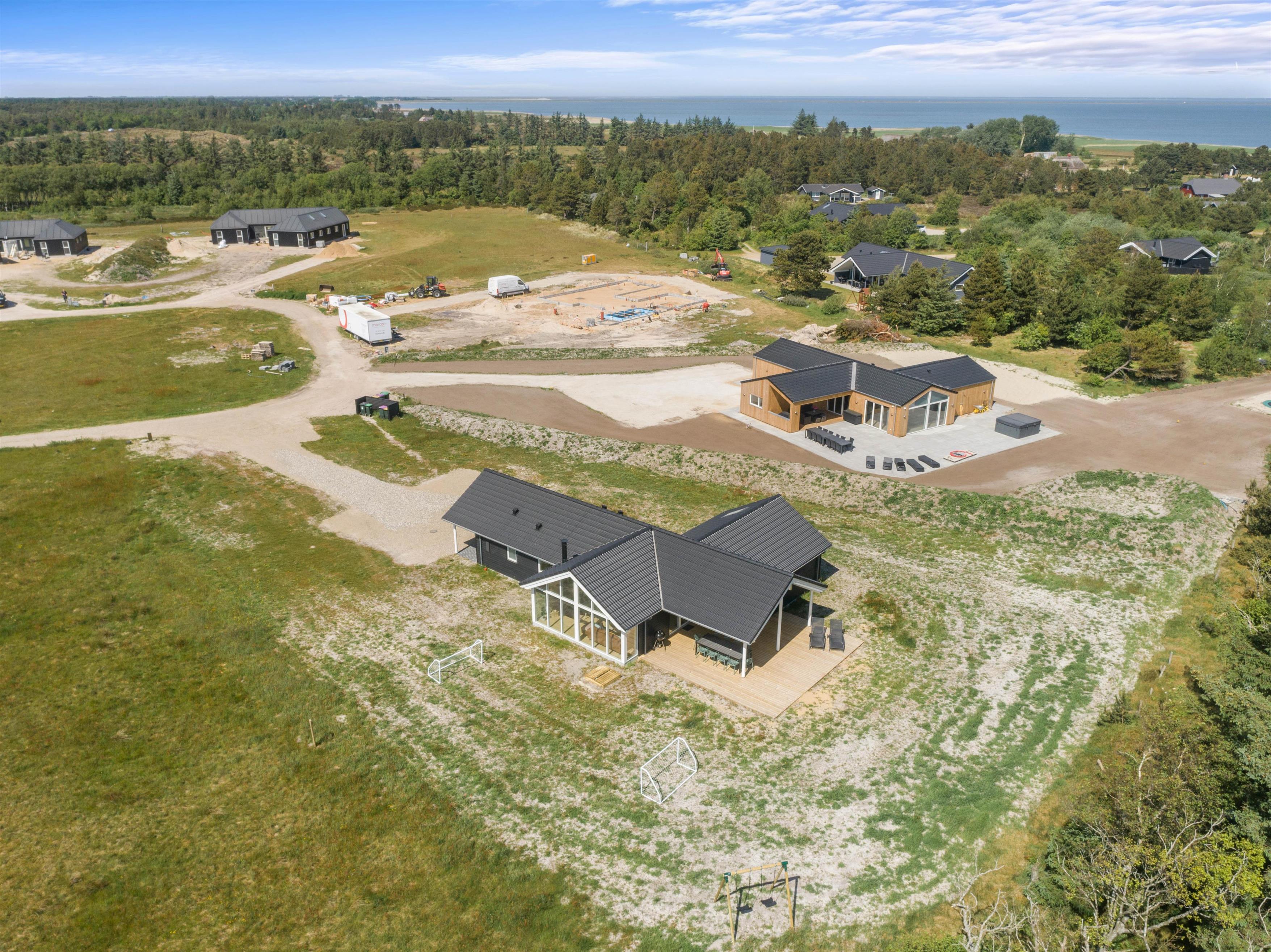 Thanks to the energy-efficient heat pump, the holiday home warms up quickly. Both bathrooms also feature underfloor heating for added comfort. A washing machine and tumble dryer ensure fresh laundry throughout your stay. Four bedrooms with double and single beds, plus an additional mezzanine sleeping area with four mattresses, provide comfortable sleeping arrangements for all guests.