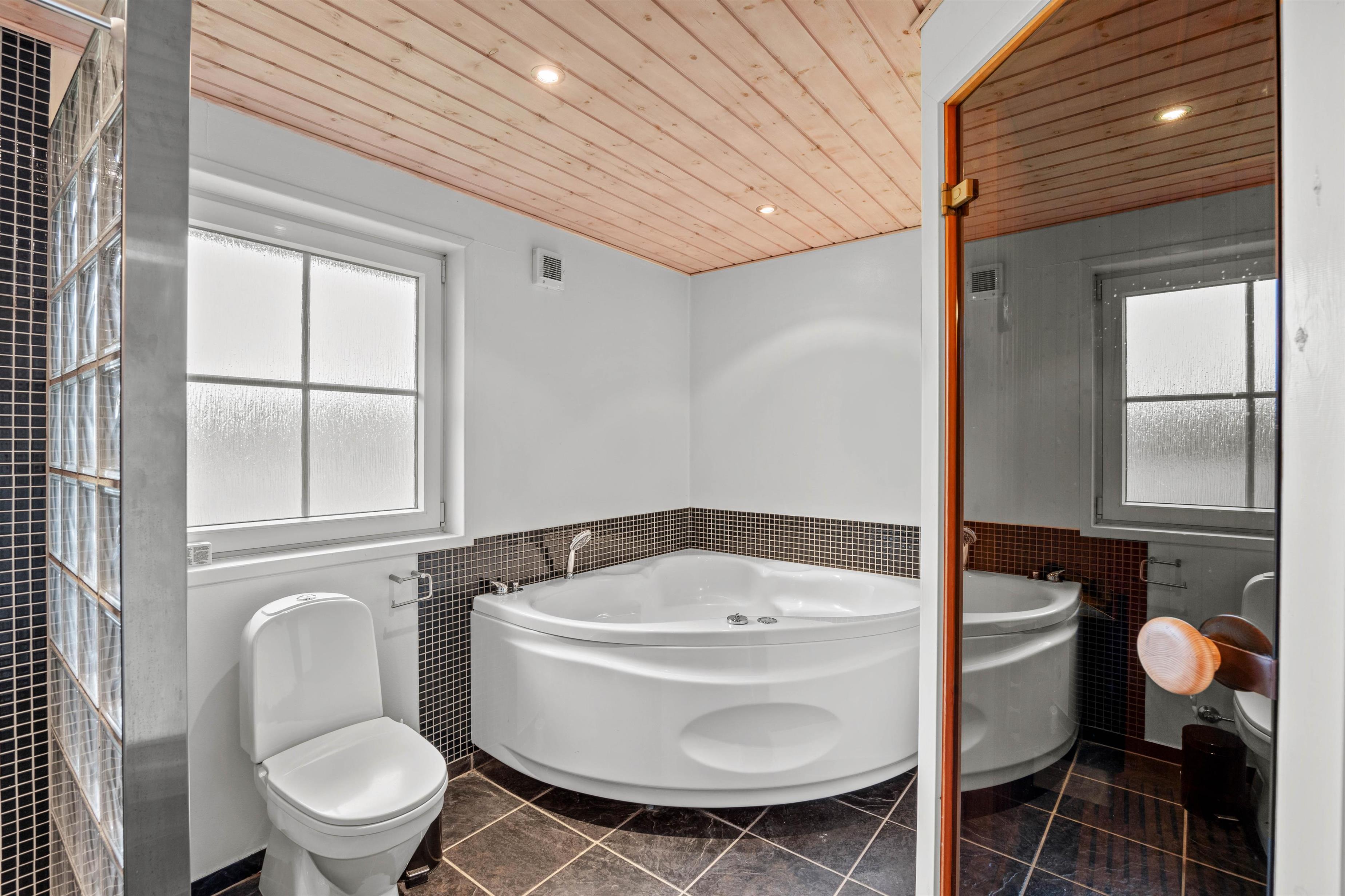 A sauna and indoor whirlpool invite relaxation, while underfloor heating in the bathroom and living areas provides additional comfort.