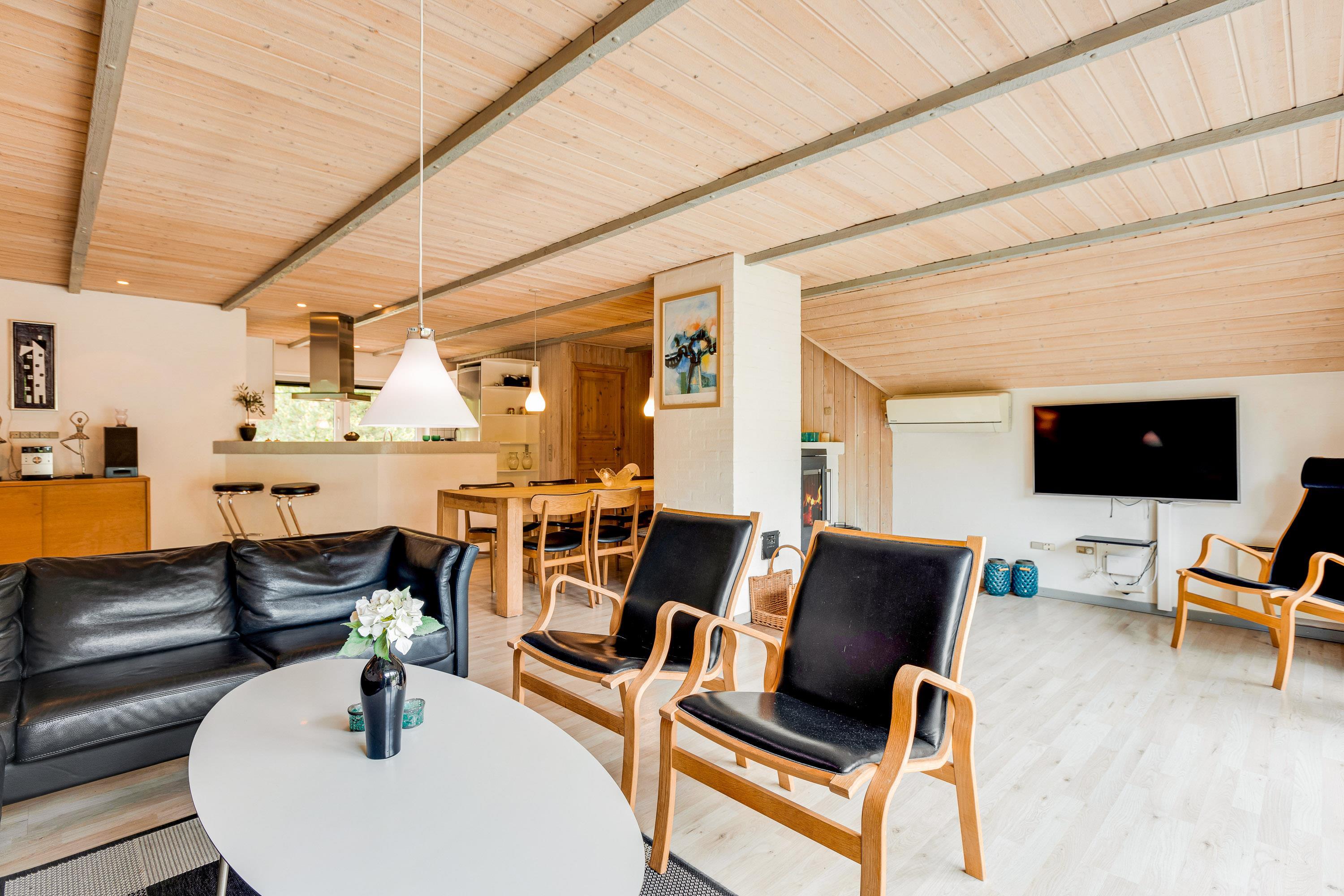 The beautiful living area, featuring a corner sofa and comfortable armchairs, is perfect for social film evenings by the crackling wood-burning stove. The adjacent dining area is ideal for starting the day with a leisurely family breakfast. The open-plan kitchen is perfect for communal cooking evenings - why not try preparing some Scandinavian dishes?