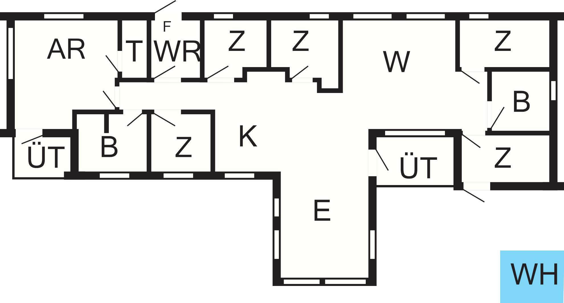 5 Schlafz.: (1DB)+(1DB)+(1DB)+(2B)+(2B), Kinderbett