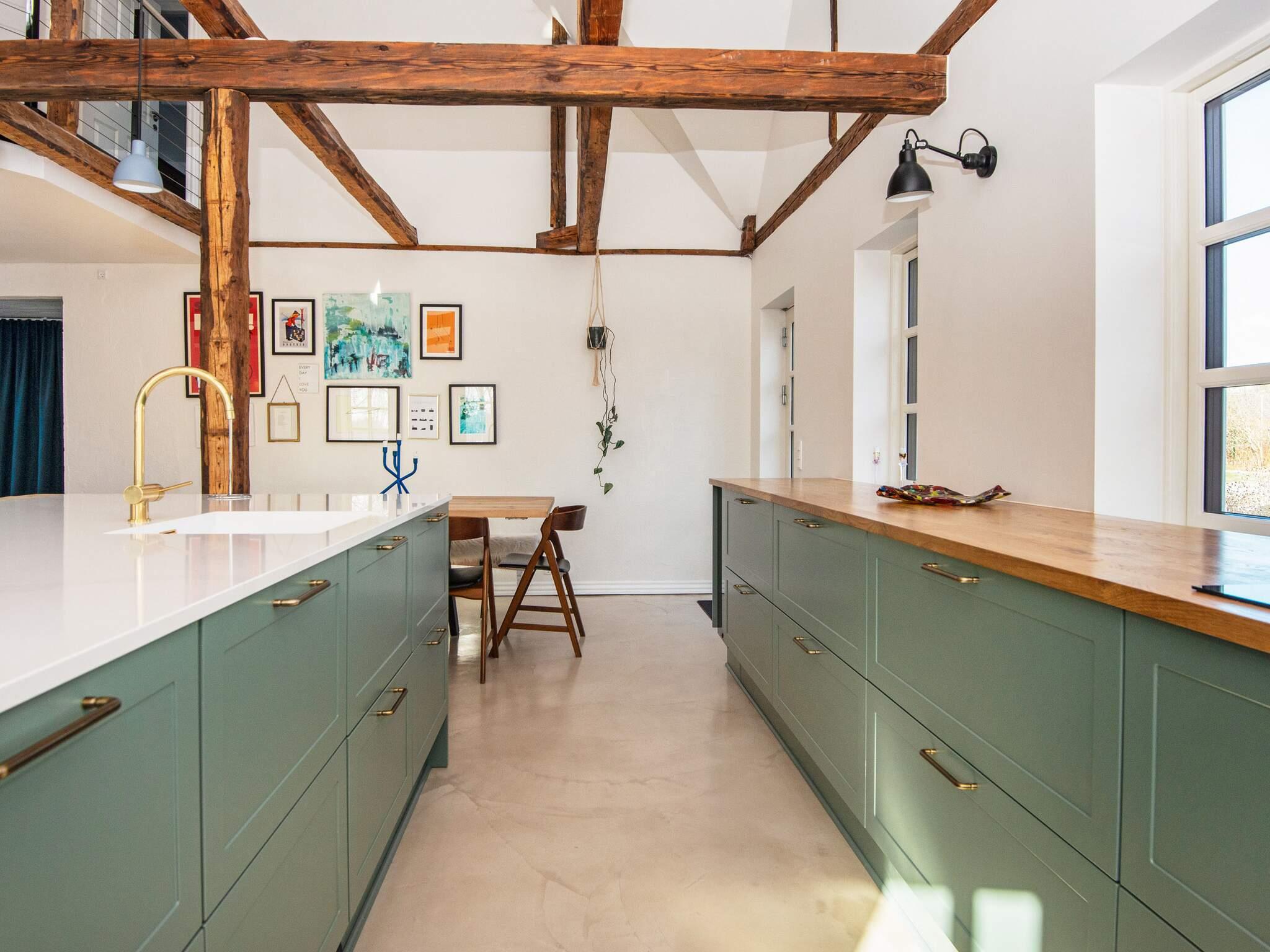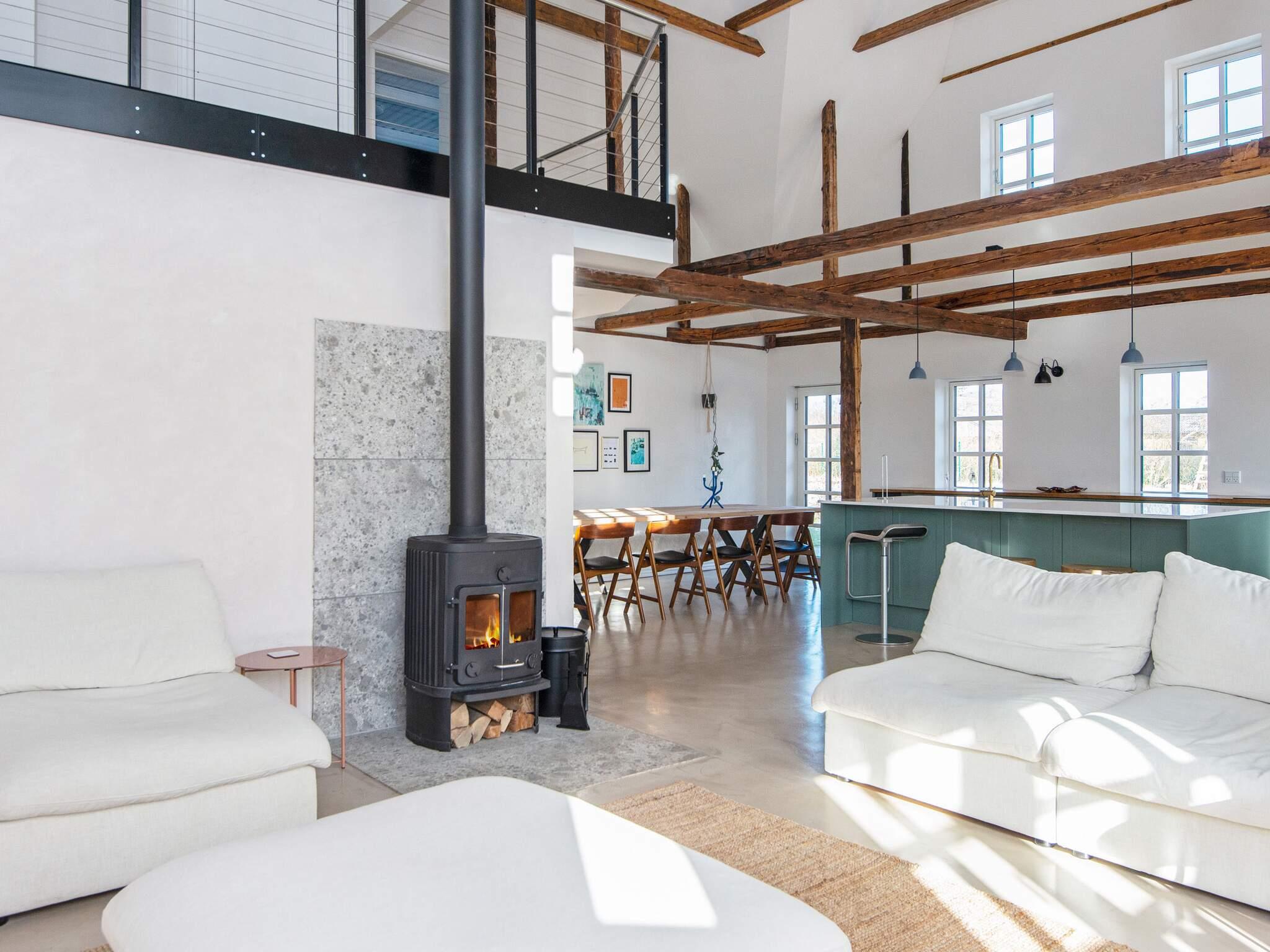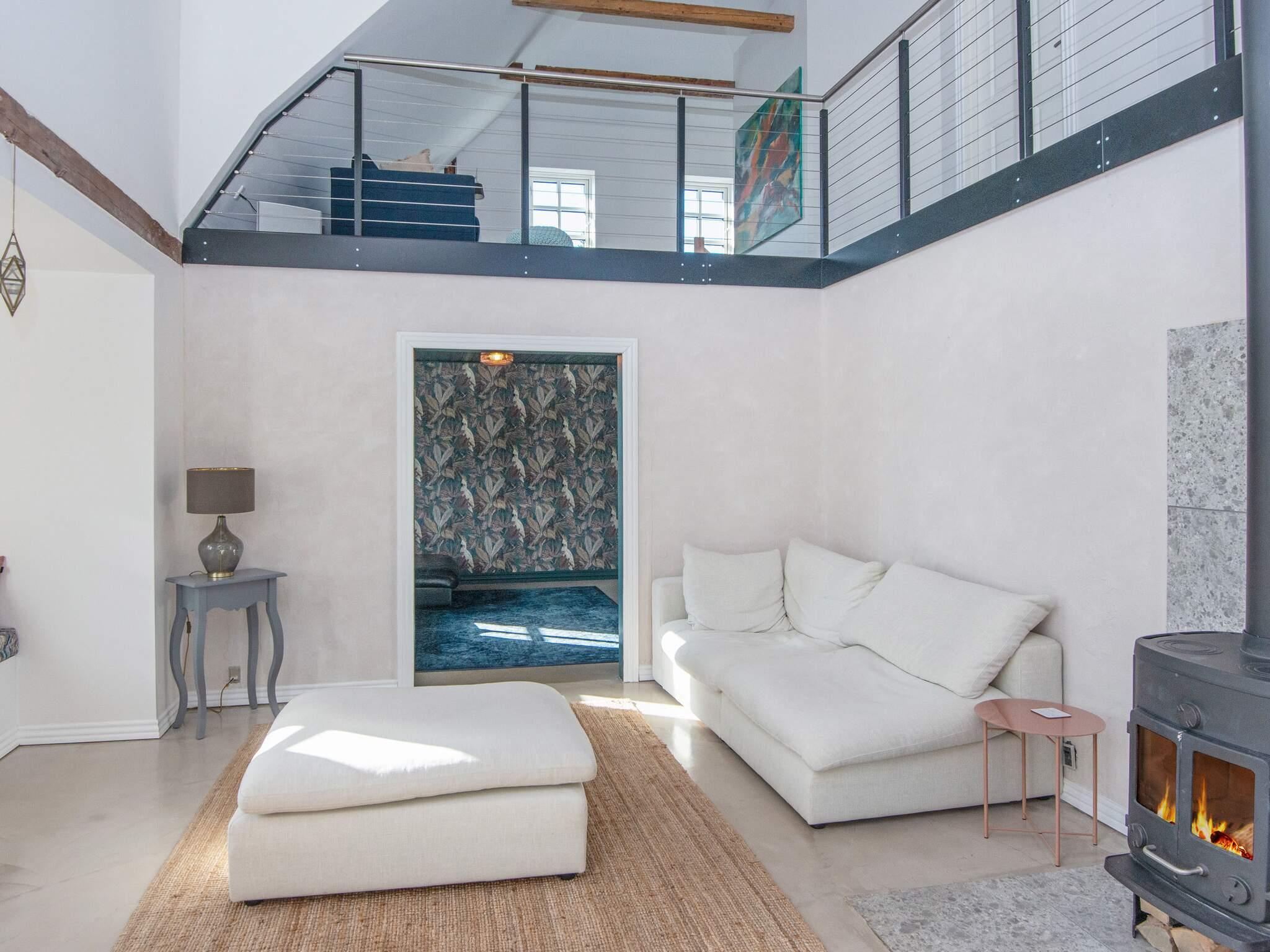 Das Haus erstreckt sich über zwei Ebenen, jeweils mit einem Badezimmer mit Dusche. Im Erdgeschoss befinden sich drei Schlafzimmer, ein Badezimmer und ein heller, offener Küchen- und Wohnbereich, der ideal für das Familienleben ist. Der Wohnbereich bietet eine gemütliche Sitzecke zum Entspannen und Unterhalten. Im Obergeschoss befinden sich ein Doppelschlafsofa, ein zusätzliches Badezimmer und ein Schlafzimmer mit Doppelbett – flexible Schlafmöglichkeiten für größere Gruppen.