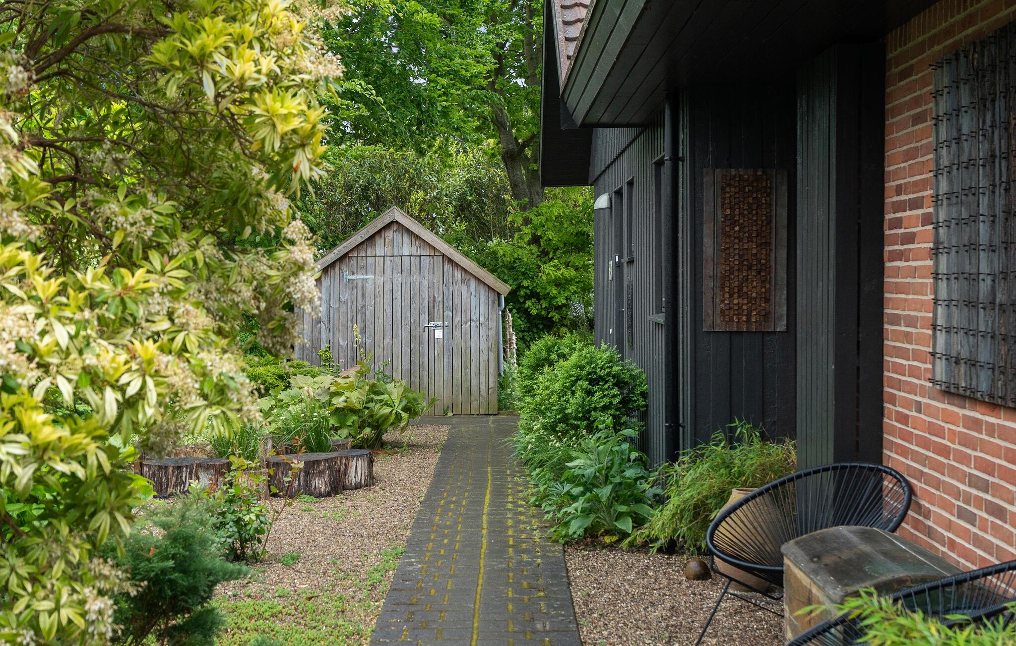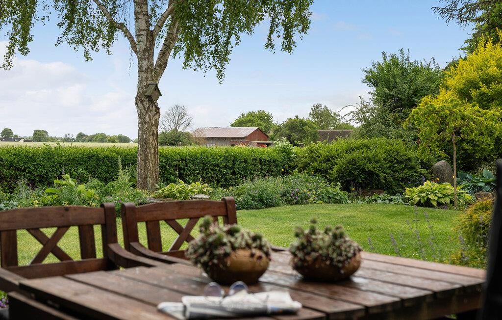 Treten Sie hinaus auf die überdachte Terrasse und genießen Sie den Blick über den gepflegten Garten mit blühenden Sträuchern und Hecken. Nehmen Sie Platz an der Sitzgruppe, genießen Sie Ihre Mahlzeiten im Freien oder lehnen Sie sich in einem der bequemen Stühle zurück.