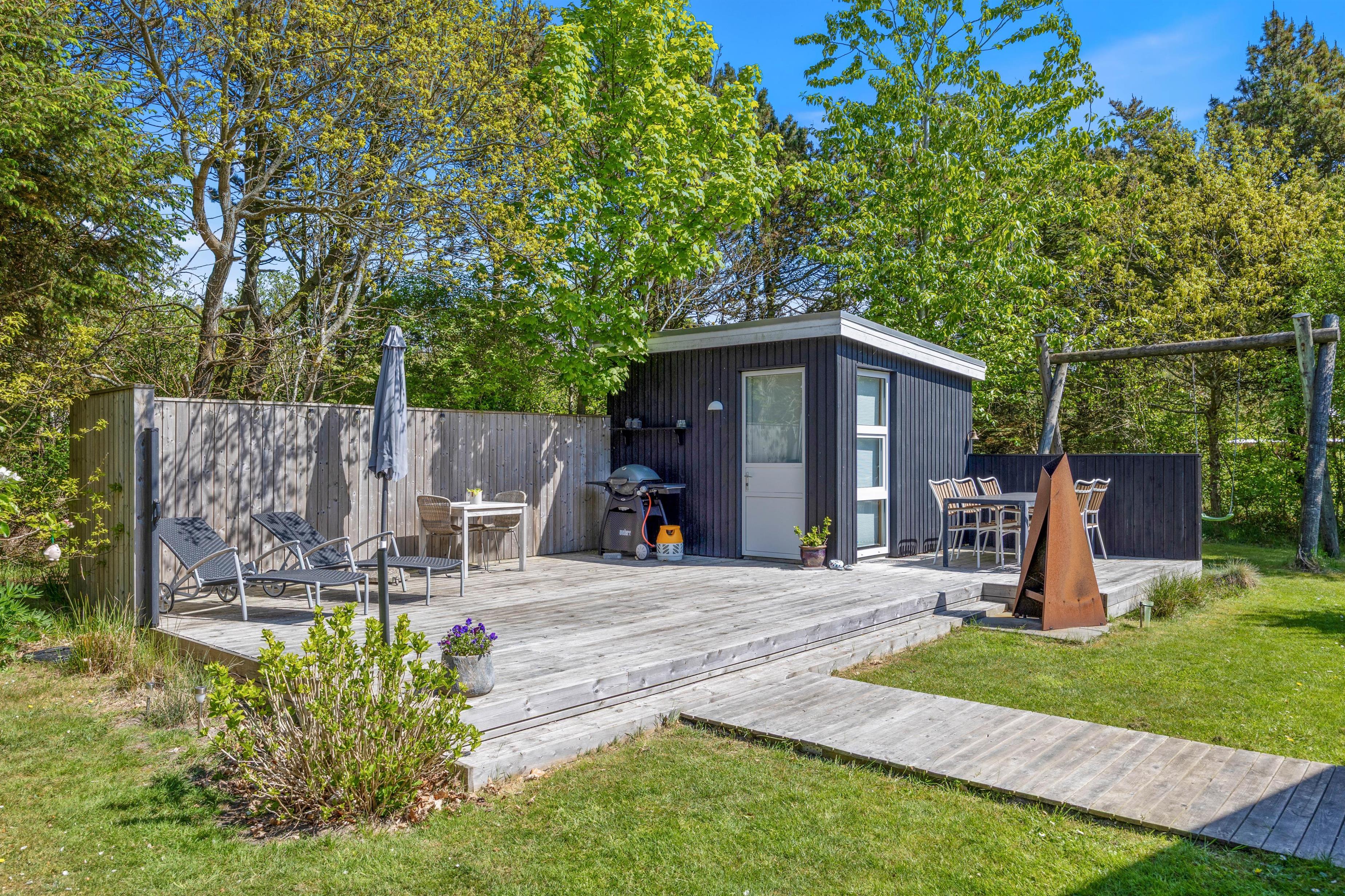 Die abgeschirmte Terrasse ist ideal für sonnige Tage, an denen ihr es euch mit einem guten Buch gemütlich machen könnt oder einfach auf den vorhandenen Gartenmöbeln die Seele baumeln lassen könnt. Für die kleinen Gäste gibt es auf der 2260 m2 großen Rasenfläche eine Schaukel, die zum Spielen und Entdecken einlädt. Macht am Abend den Grill an und lasst so einen schönen Urlaubstag zu Ende gehen.