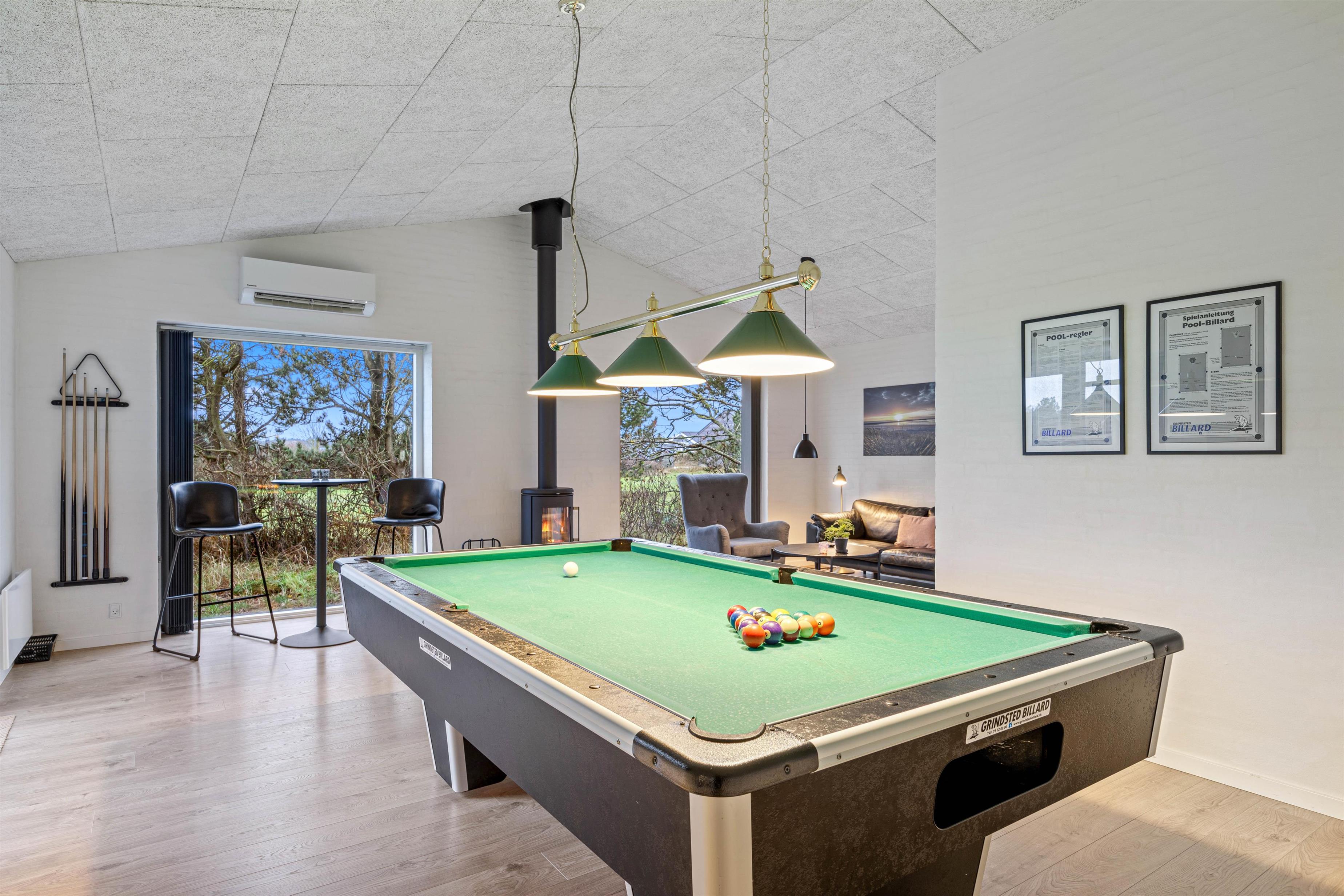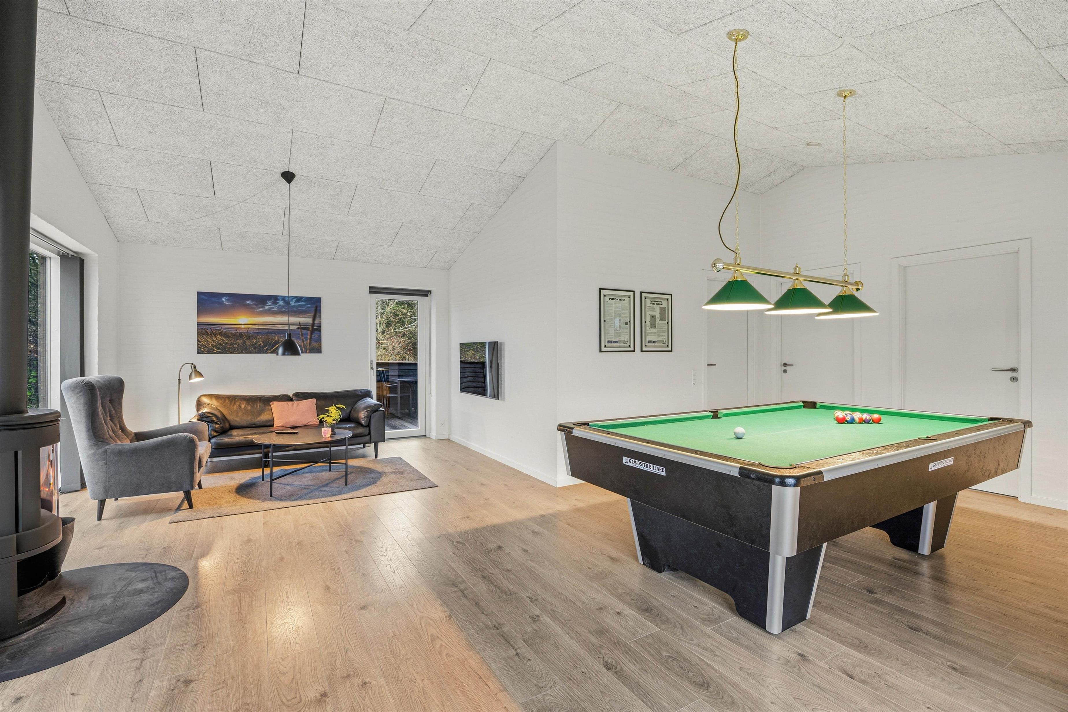 The spacious, modern kitchen with integrated dining area is perfect for cooking together and meets every need - making it ideal for evening games nights. The adjoining games room, equipped with a pool table among other features, ensures there's never a dull moment. On cooler evenings, enjoy the cosy warmth from the wood-burning stove while relaxing on the sofa with a good book or watching television. Alternatively, there's a modern, energy-efficient heat pump available.