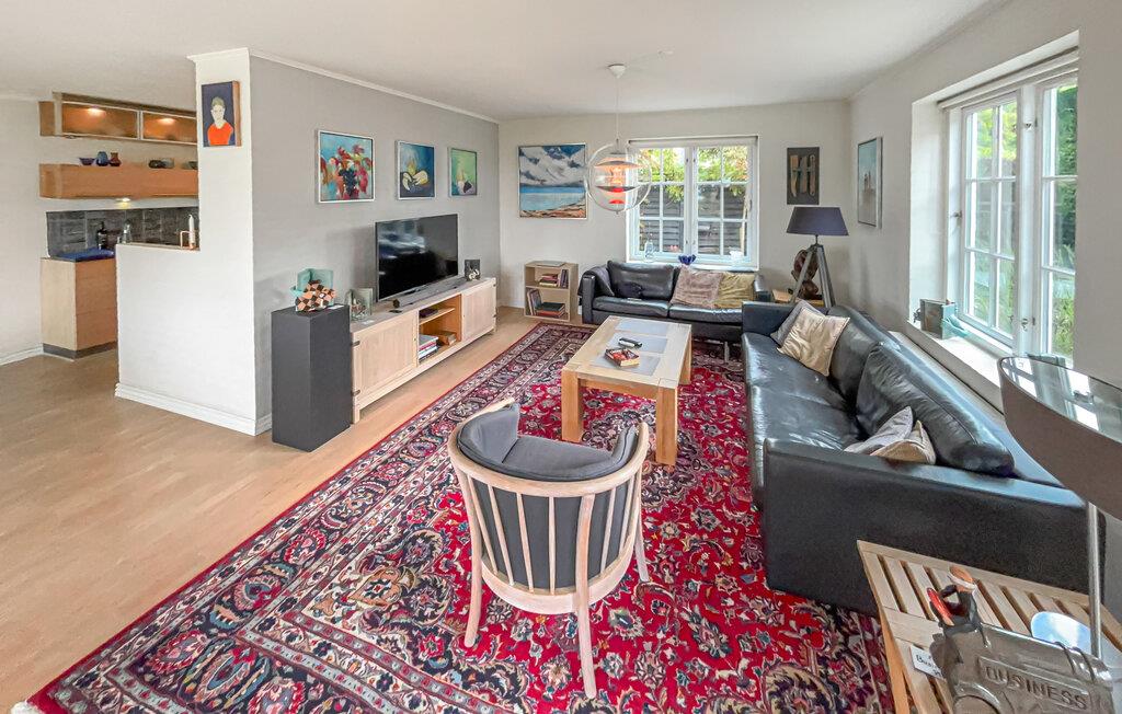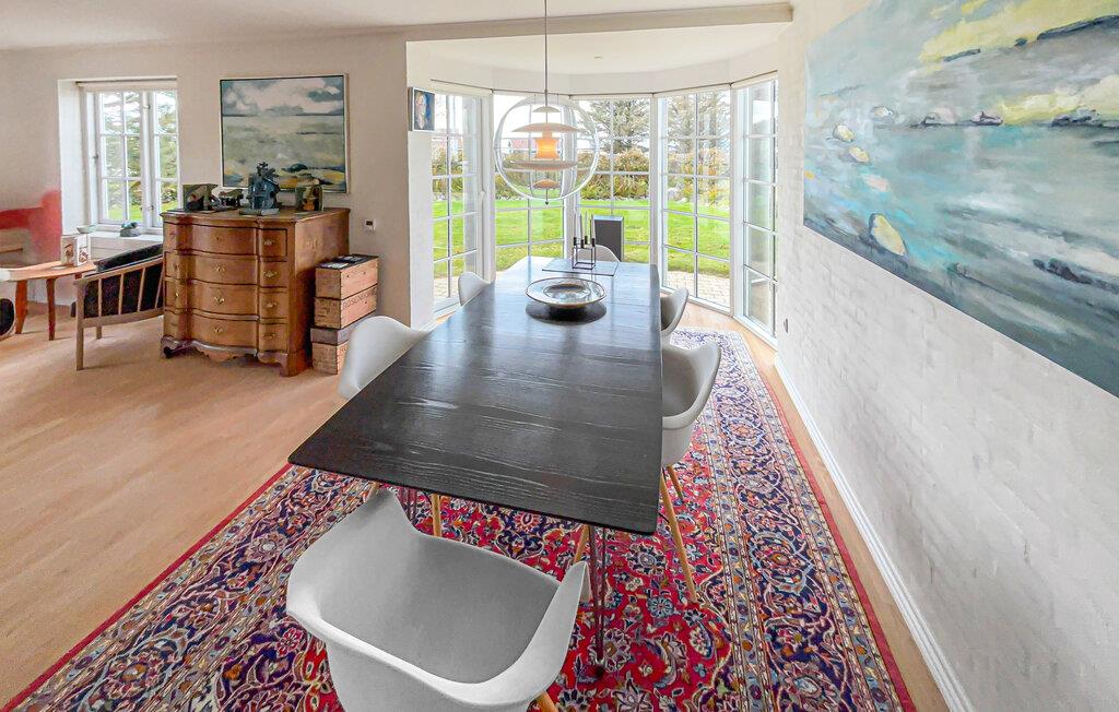 Im Inneren Ihres Hauses empfängt Sie ein helles, großzügiges Wohnzimmer mit schönen Möbeln und kunstvollen Details. Geschmackvolle Teppiche, dezente Farben und ausgesuchte Kunstwerke verleihen dem Haus eine persönliche Note. Machen Sie es sich auf den Sofas bequem, lesen Sie ein Buch oder schauen Sie fern. Große Fenster lassen viel Licht herein und schaffen eine angenehme Atmosphäre. Der Essbereich mit einem langen Tisch und stilvollen Stühlen ist ideal für gemeinsame Mahlzeiten. Die Küche ist modern ausgestattet, sodass Sie hier bequem kochen können.