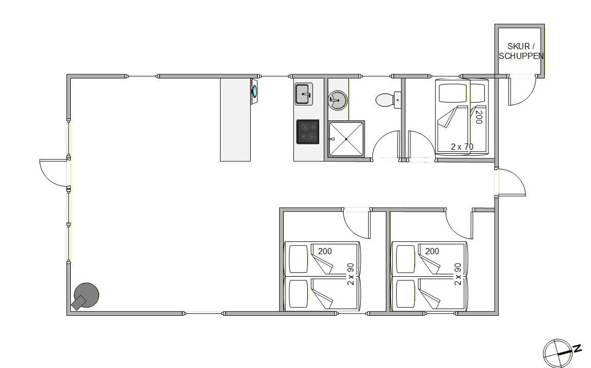 Im Wohnzimmer sorgt der Kaminofen an kühlen Abenden für das gewisse Extra an Ferienstimmung. Dank einer modernen Luft-Luft-Wärmepumpe ist die Temperatur im Ferienhaus immer angenehm und euren Bedürfnissen angepasst. Die Küche ist vollständig ausgestattet und bietet alles, was ihr für die Zubereitung leckerer, hausgemachter Mahlzeiten benötigt – einschließlich Geschirrspüler. Das Badezimmer verfügt über eine Fußbodenheizung, und die 3 Schlafzimmer verteilen sich auf 2 Zimmer mit Doppelbetten und 1 Zimmer mit Etagenbett, das besonders bei Kindern beliebt ist.