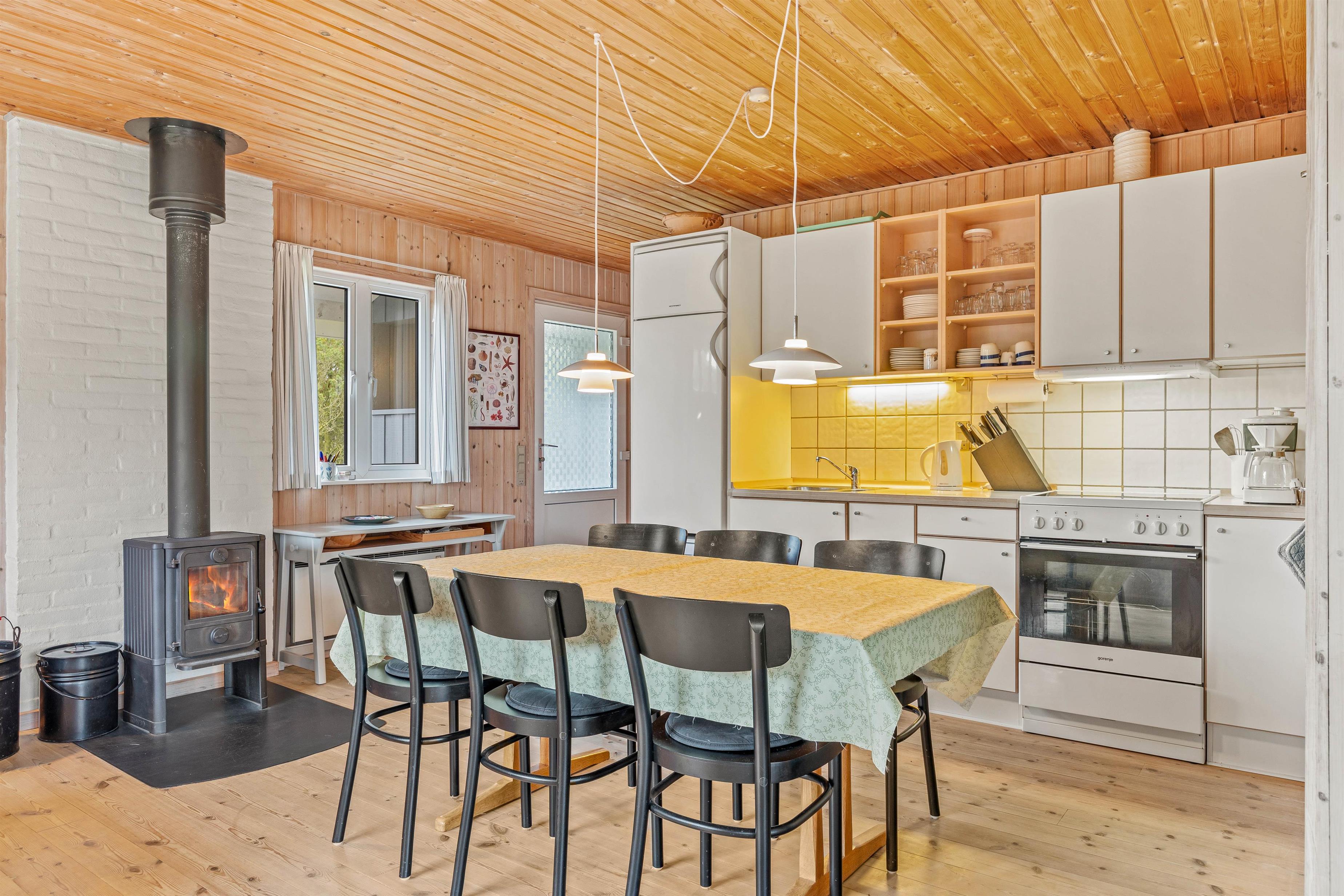 The heart of the holiday home features an open-plan living area with dining space and kitchen. It's the perfect setting for socialising and cosy moments together. The well-equipped kitchen includes a dishwasher, giving you more quality time with each other. Next to the sofa, you'll find the wood-burning stove, providing warmth and creating a particularly cosy holiday atmosphere on cooler days.
