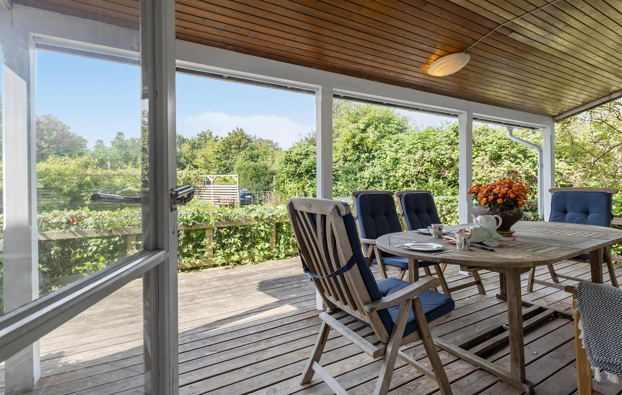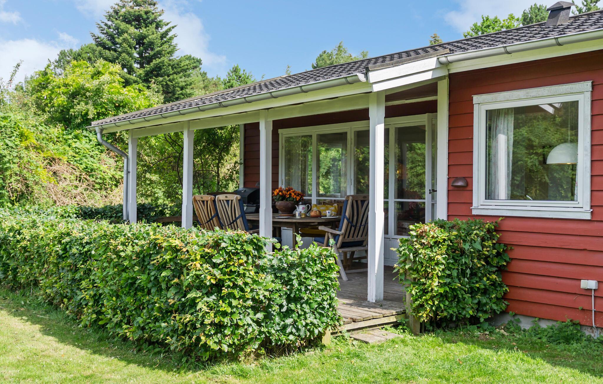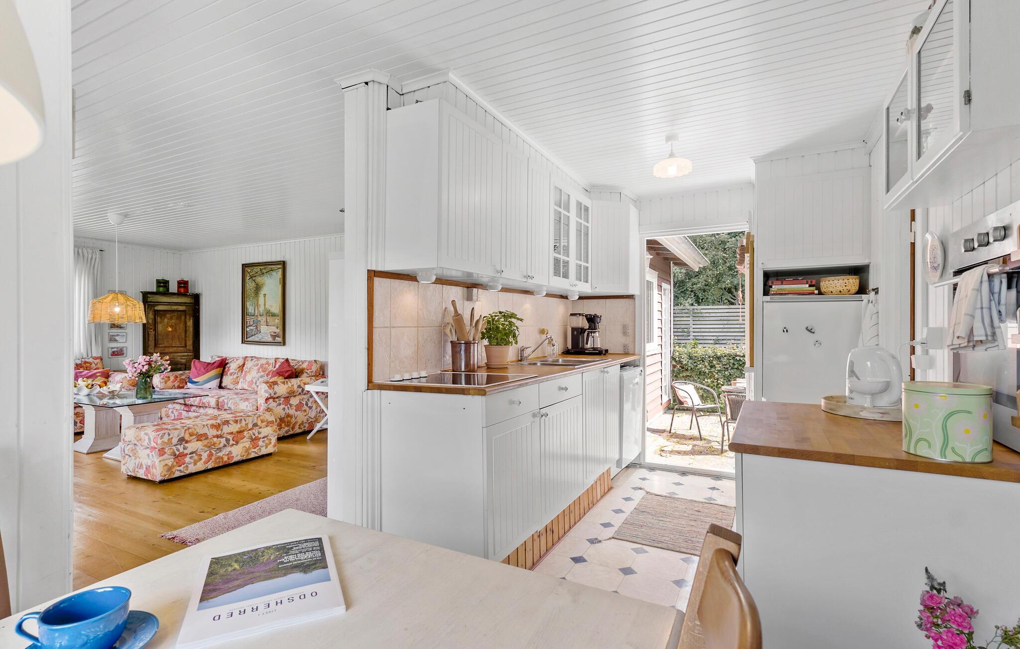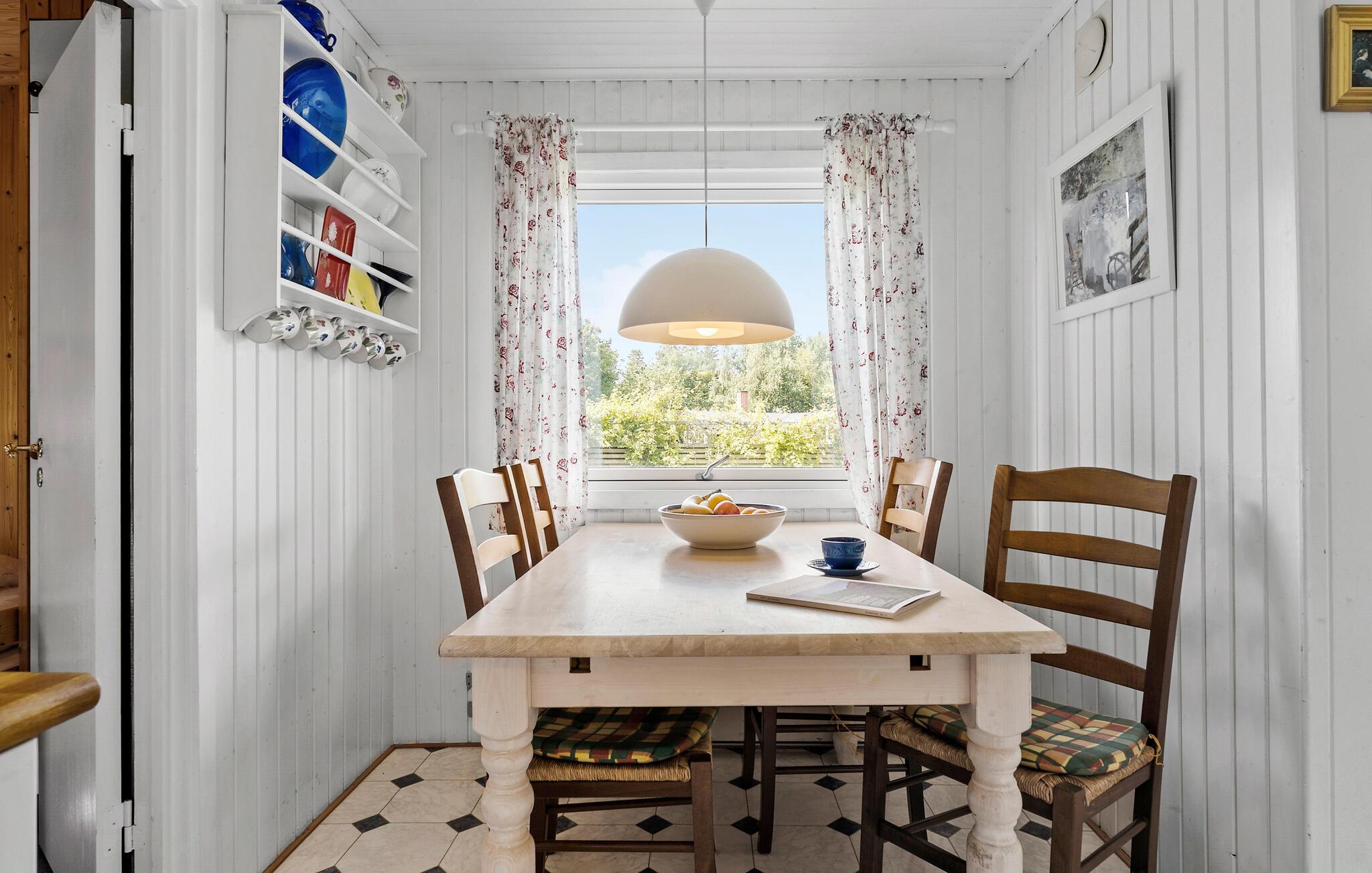 Ihr gemütliches Ferienhaus begrüßt Sie nahe dem Tengslemark Strand. In diesem charmanten Holzhaus können Sie entspannte Stunden auf der überdachten Terrasse verbringen, die mit schönen Holzmöbeln ausgestattet ist. Genießen Sie hier Ihre Mahlzeiten oder entspannen Sie bei einem Buch, während die frische Luft um Sie weht. Der Wohnbereich des Hauses lädt zum Verweilen ein. Machen Sie es sich auf den kuscheligen Sofas bequem und genießen Sie die helle, freundliche Atmosphäre des Raumes. Die große Fensterfront lässt viel Licht herein und bietet einen herrlichen Blick auf den Garten. Starten Sie Ihren Tag mit einem Kaffee am Esstisch, der direkt an die Küche angrenzt, und planen Sie Ihre Aktivitäten.