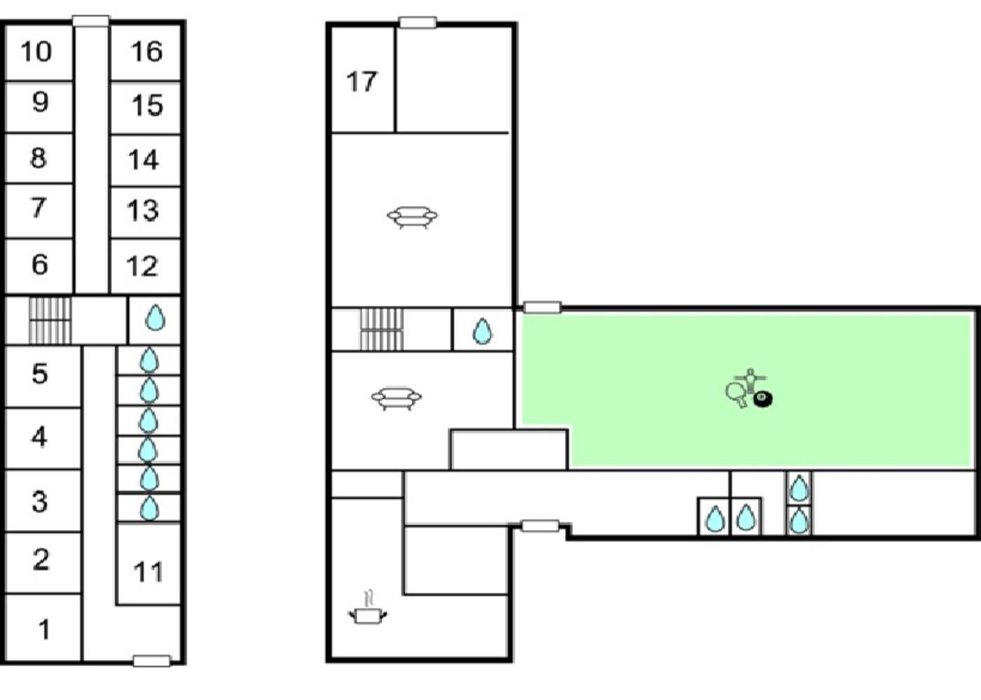 Der ideale Ort für einen Aktivurlaub mit der Großfamilie oder dem Sportverein. Das Haus ist eine ehemalige Schule, die mit einer Großküche, einem Speisesaal und einem großen Aufenthaltsraum ausgestattet ist. Insgesamt gibt es 16 Schlafzimmer, von denen eines behindertengerecht eingerichtet ist. Das Haus verfügt über eine große Turnhalle, die zahlreiche Möglichkeiten für Aktivitäten wie Ballspiele, Tischtennis und Hockey bietet – sowie vieles mehr. In der Halle können Feiern für bis zu 150 Personen ausgerichtet werden, mit der Möglichkeit, Catering zu bestellen.