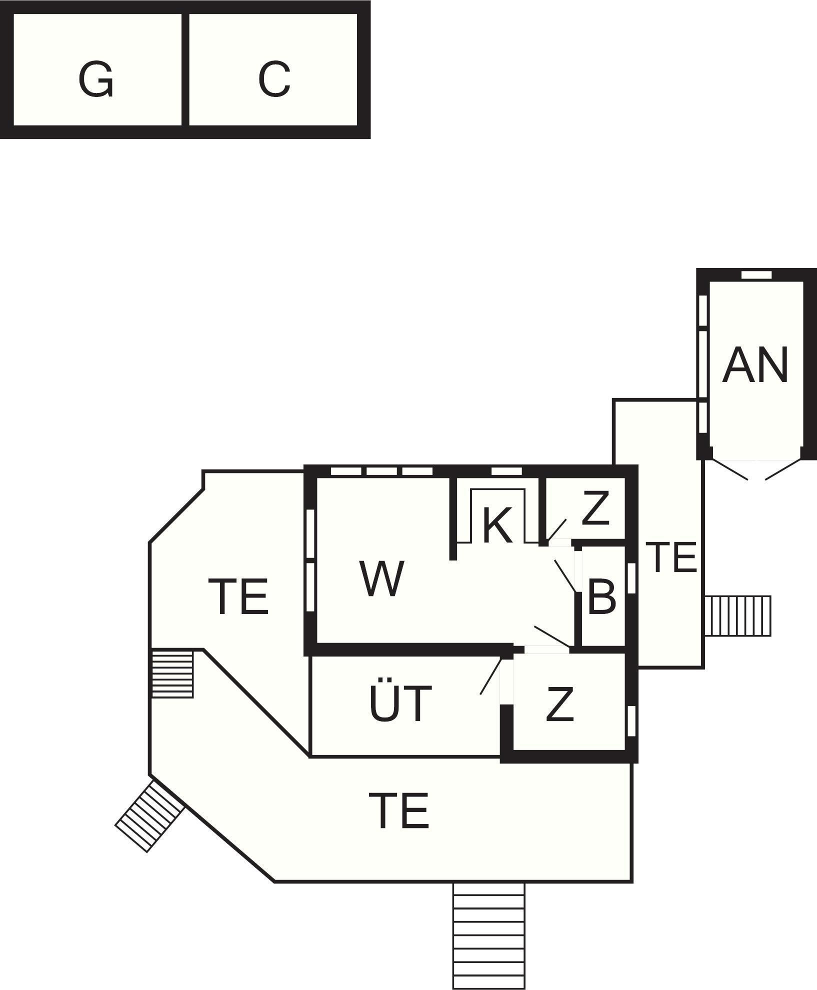 Das Ferienhaus ist hell und einladend und praktisch eingerichtet und verfügt über eine kombinierte Wohnküche. Sowohl das Ferienhaus als auch das Nebengebäude sind energieeffizient und verfügen über Wärmepumpen, wodurch der Verbrauch reduziert wird. Zusätzlich verfügt das Ferienhaus über Solarzellen.
