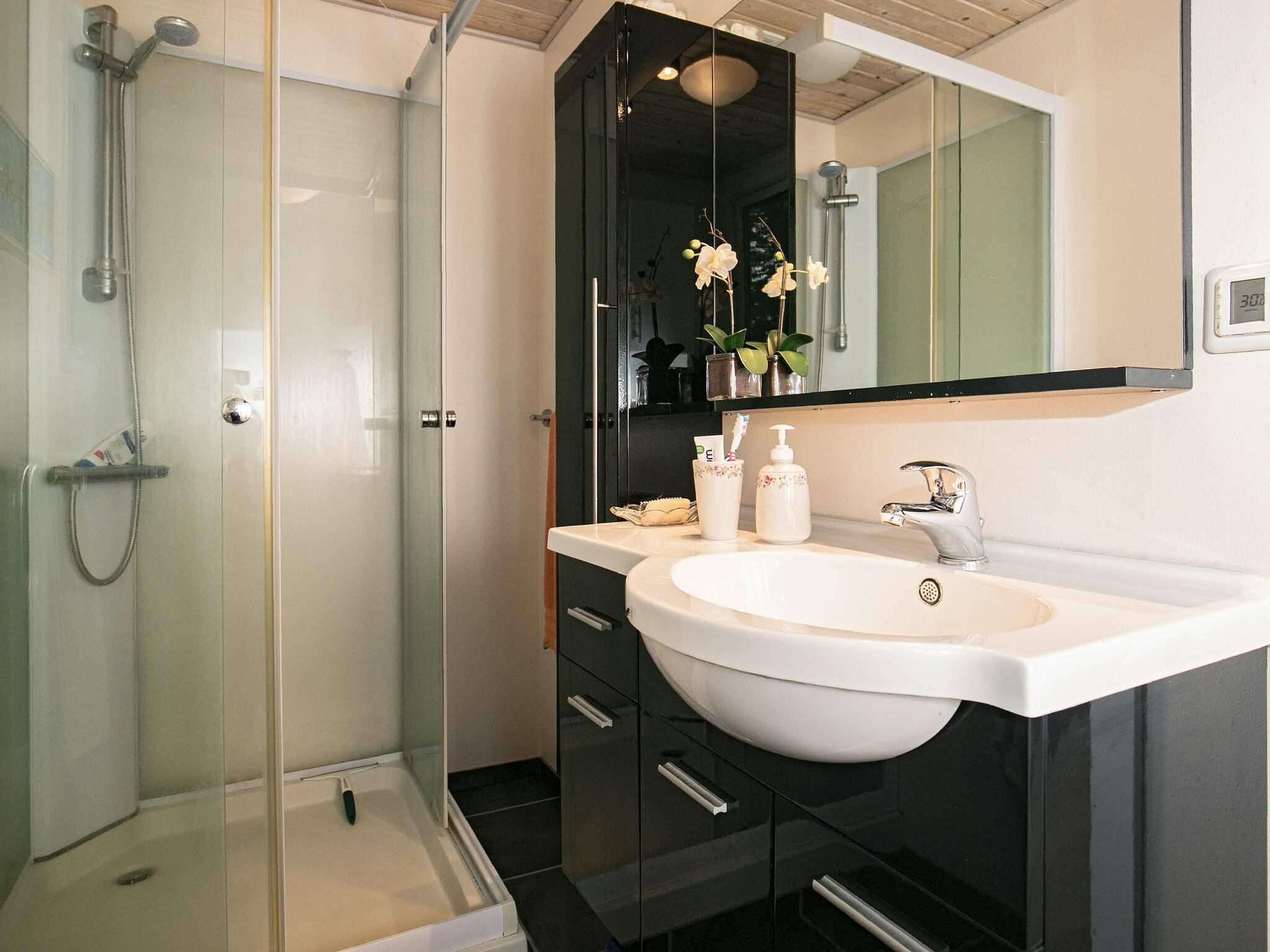 Das Badezimmer verfügt über eine Badewanne und eine Dusche. Waschmaschine und Trockner sind ebenfalls vorhanden. Für die Kleinen gibt es ein Babybett.