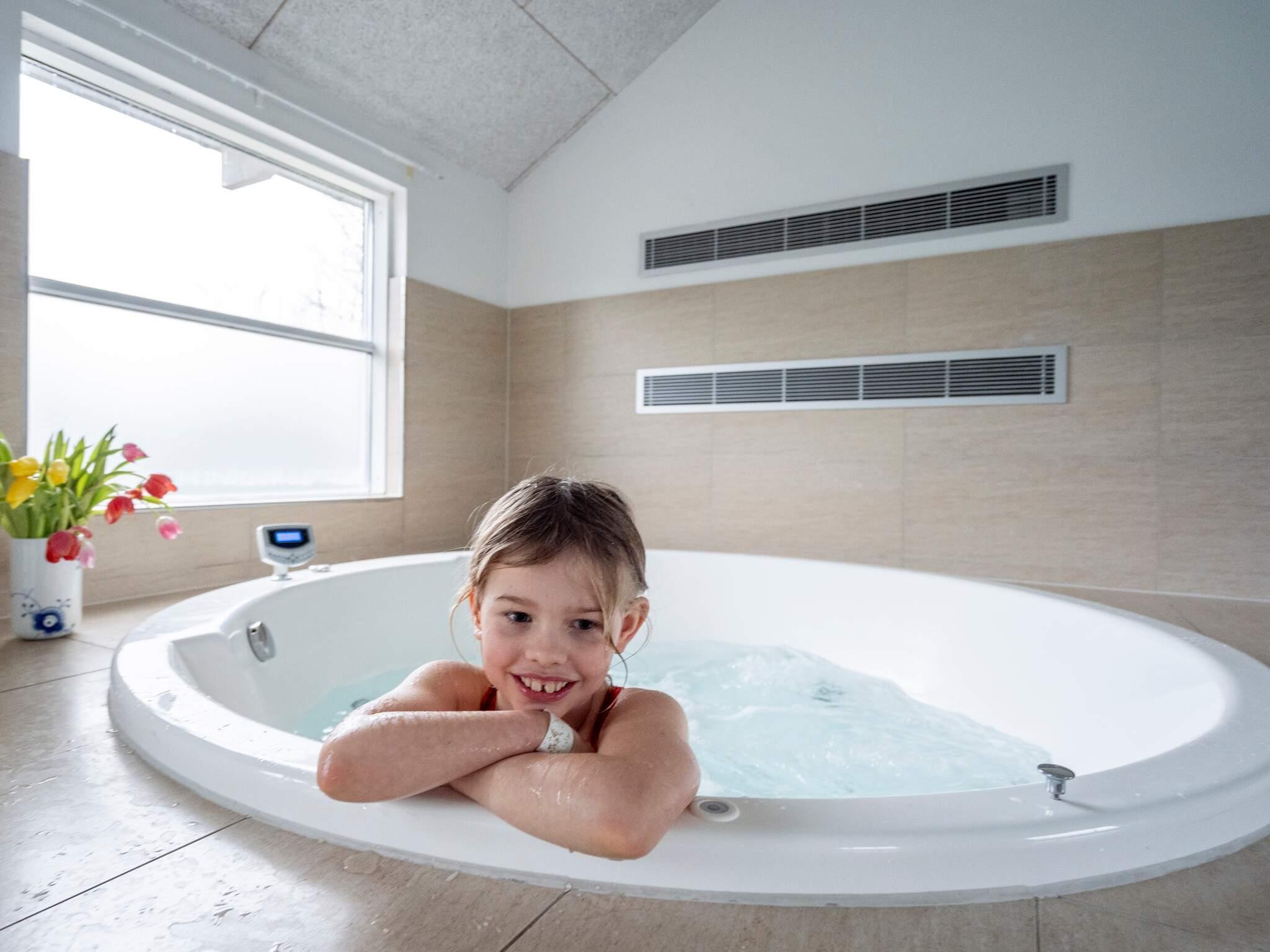 Swimmingpool mit Wasserrutsche, einen großen, eingebauten Whirlpool und eine Sauna mit Platz für 4-6 Personen.