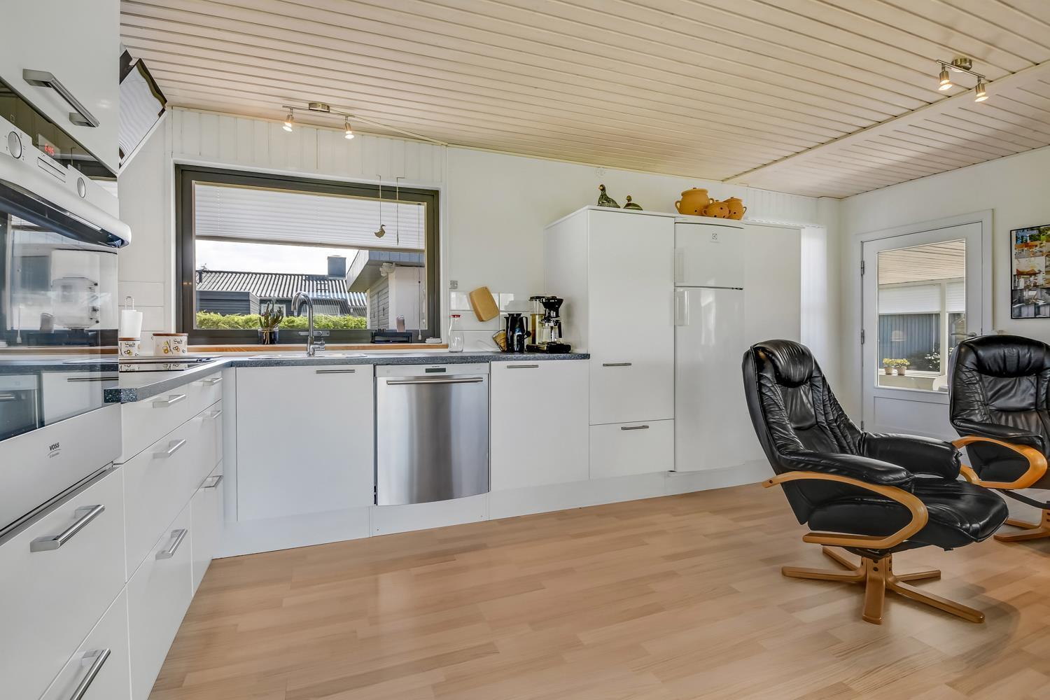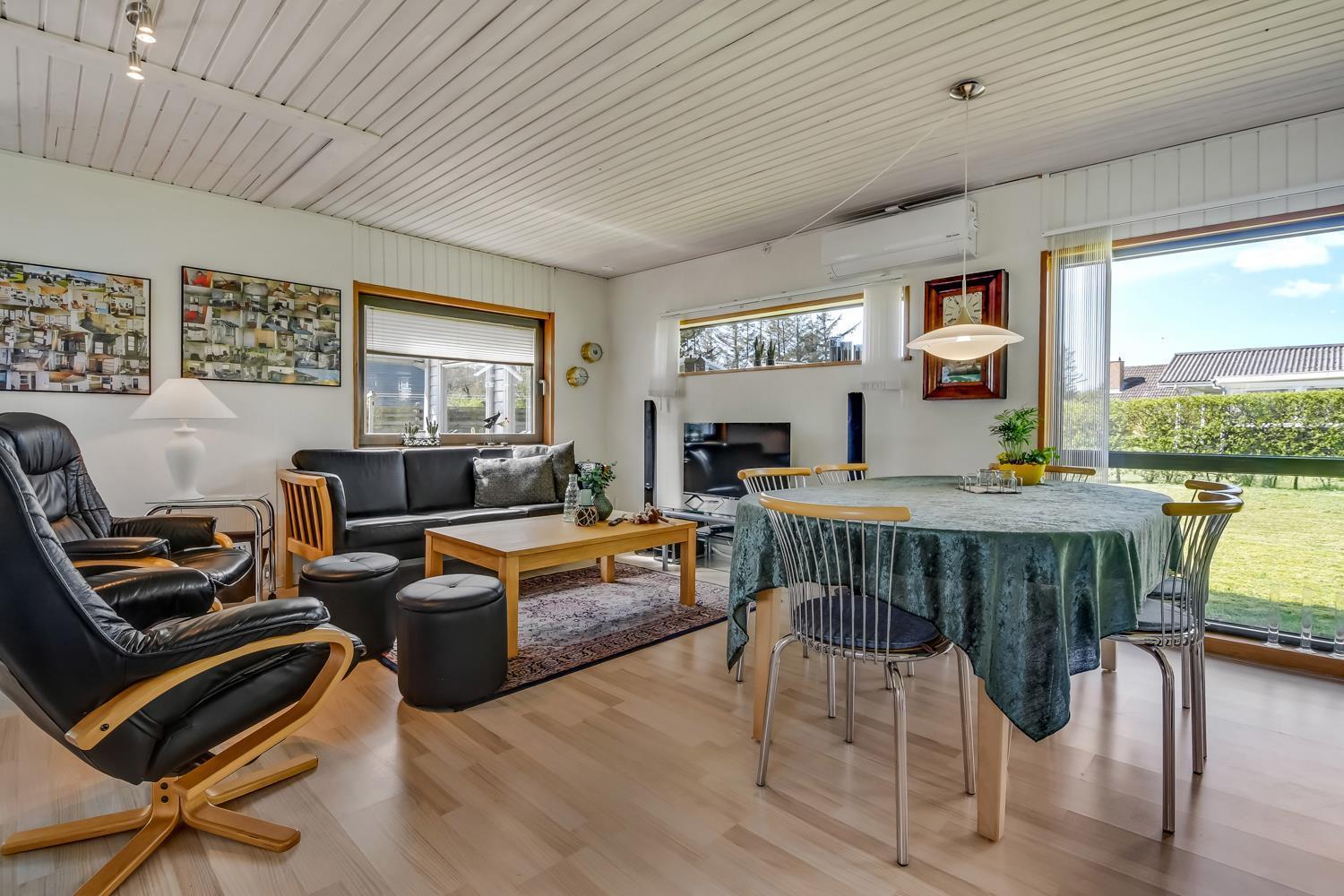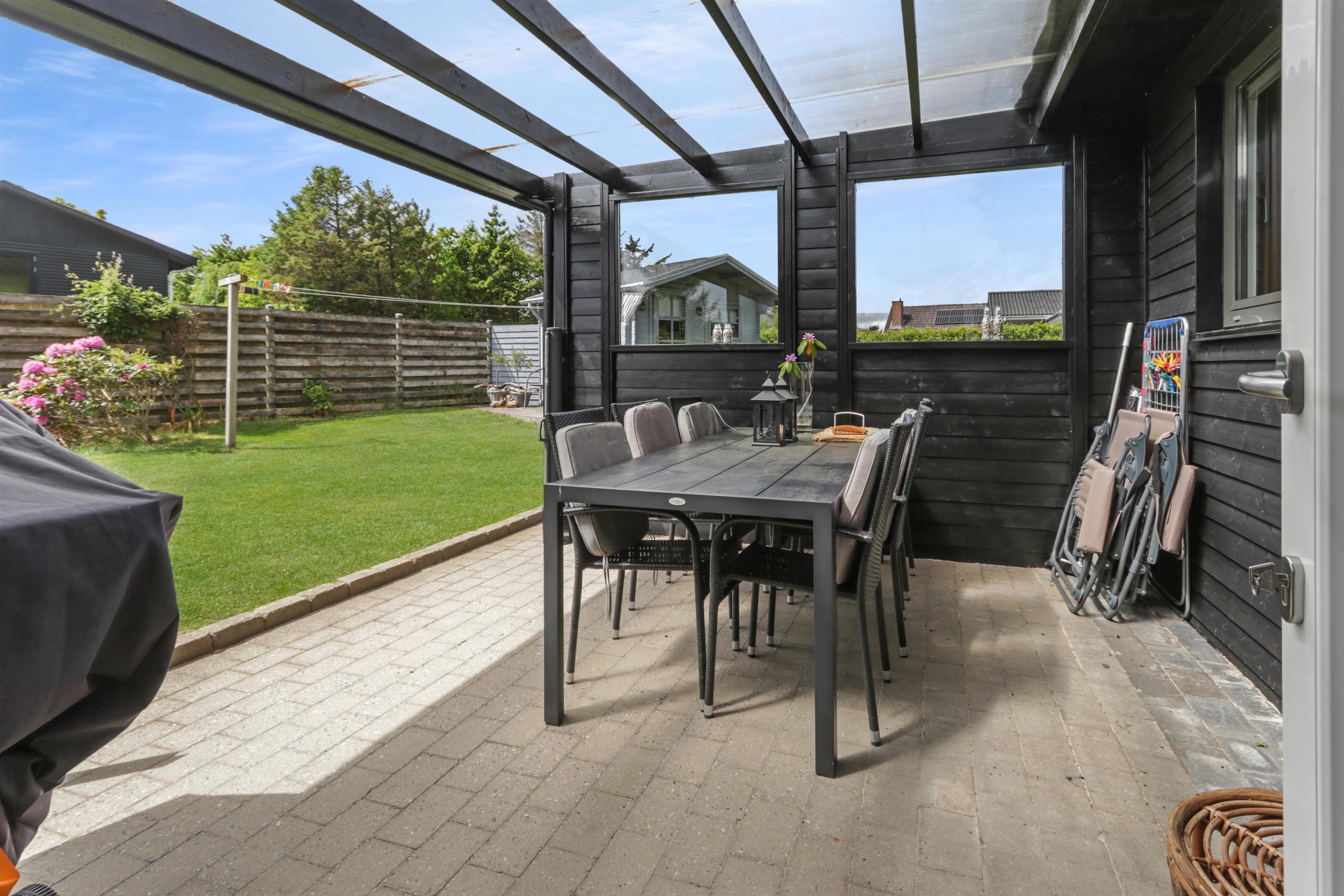 Das Haus liegt auf einem 771 m2 großen Grundstück mit Einfahrt, wo das Auto in der Nähe der Haustür geparkt werden kann, und außerdem gibt es eine große Rasenfläche um das Haus herum. Vom Wintergarten aus gelangt man auf eine überdachte Terrasse. Hier gibt es einen Grill, Gartenmöbel und Sonnenliegen, die je nach Bedarf verschoben werden können. Die Terrasse kann auch mit einem ausziehbaren Sichtschutz abgeschirmt werden, sodass man vor Wind und intensiver Sonne geschützt ist. Es besteht also die Möglichkeit, bei jedem Wetter draußen zu sitzen.