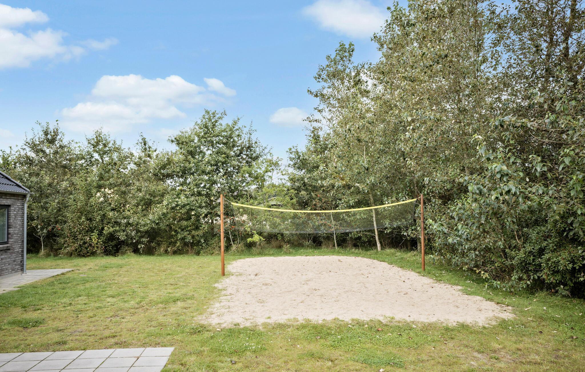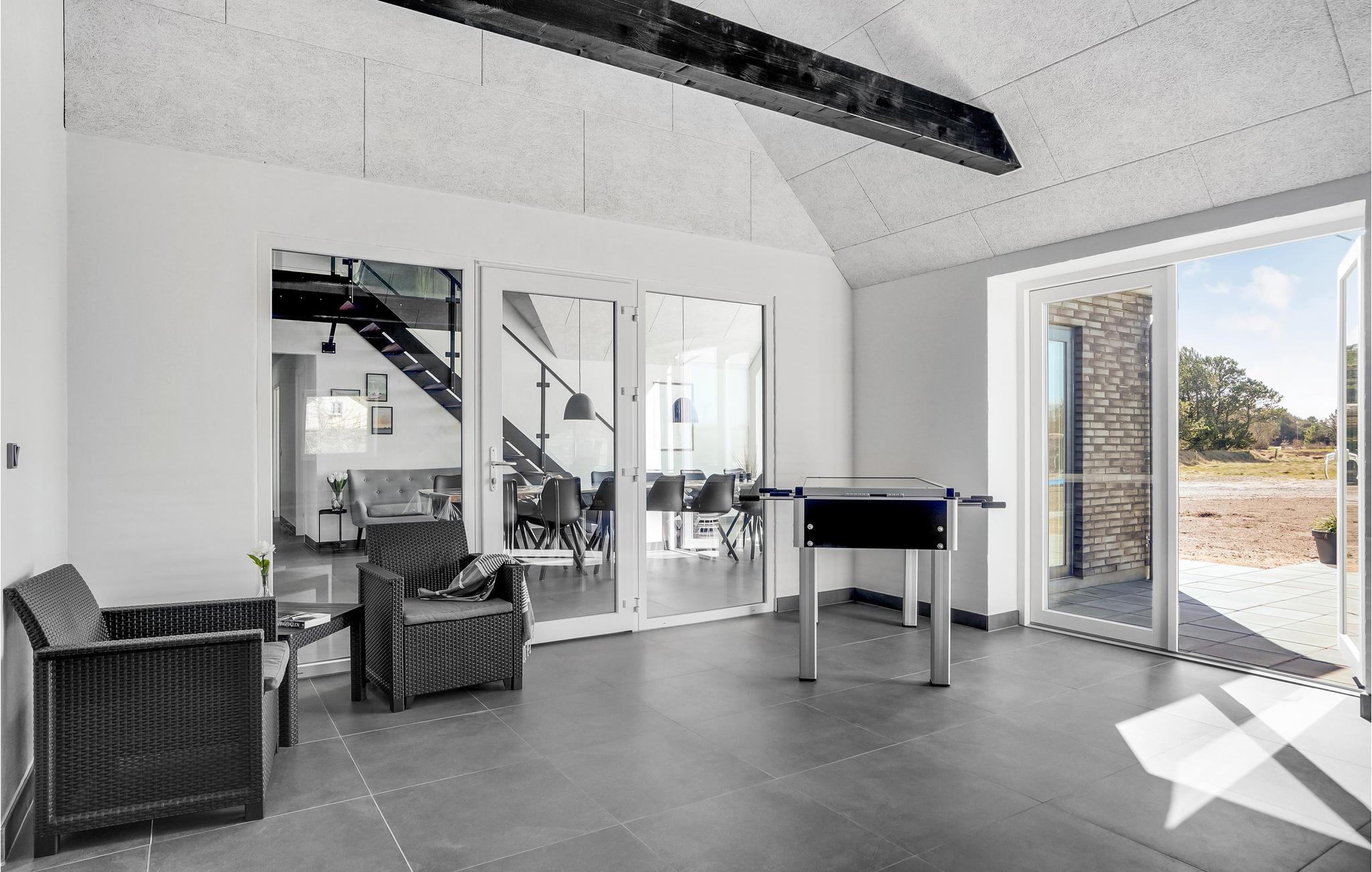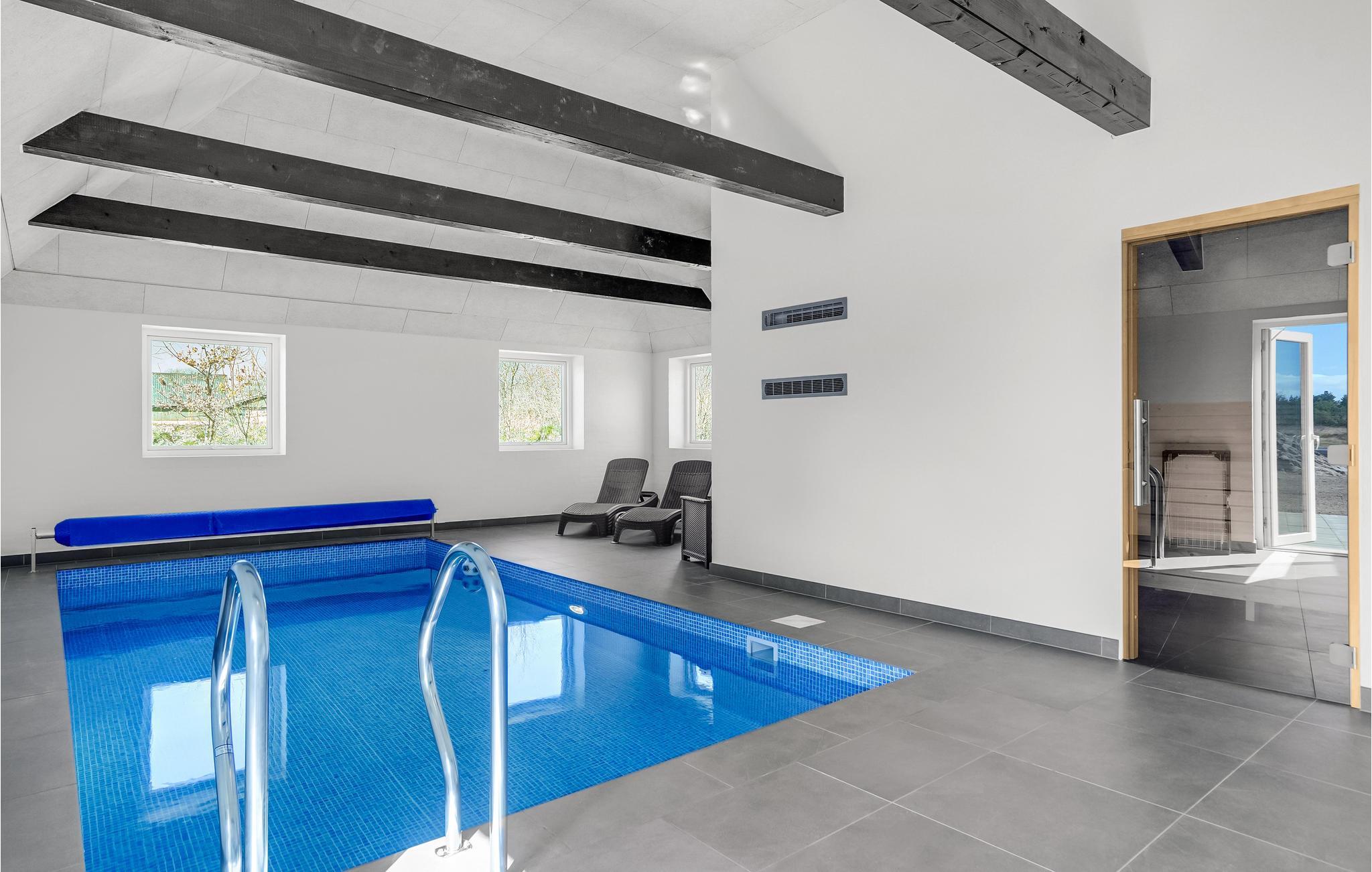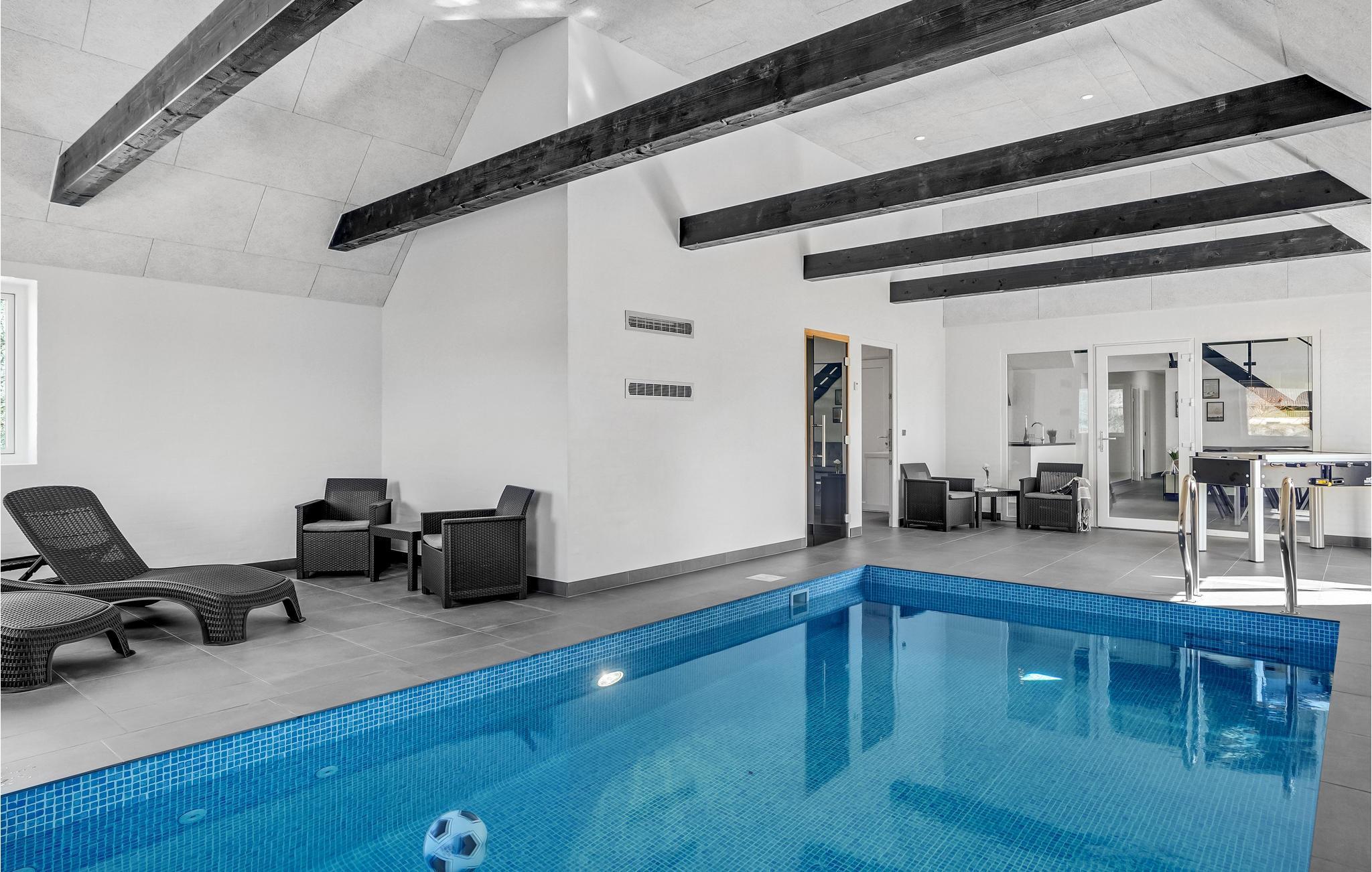 Kommen Sie mit Ihrer Familie bzw. Freunden in dieses luxuriöse, große Ferienhaus. Hier wird Ihnen zu allen Jahreszeiten jeder Komfort geboten. Im oberen Geschoss können Sie sich entspannt zurückziehen. Profitieren Sie von den mit Fernseher ausgestatteten Schlafzimmern, oder dem bequem eingerichteten Lounge-Raum. Hier kann jeder seinen perfekten Rückzugsort finden. Für mehr Aktivität gehen Sie in das Erdgeschoss. In der großräumigen Küche können Sie wunderbar leckere Inselspezialitäten zubereiten, während Sie sich mit Ihren Liebsten unterhalten und die Aussicht auf den Wald genießen. Planschen Sie nebenan im Innenpool oder fordern Sie jemanden zum Tischfußball heraus. Oder möchten Sie lieber sitzend schwitzen? Eine Sauna steht Ihnen ebenfalls zur Verfügung. Im Außenbereich können sich Kinder wunderbar auf dem Trampolin oder der Schaukel austoben, während die Erwachsenen vielleicht der Whirlpool nach draußen lockt? Wer richtiges Dänemark-Feeling erleben möchte, probiert im Shelter auf dem Grundstück im Freien zu schlafen.