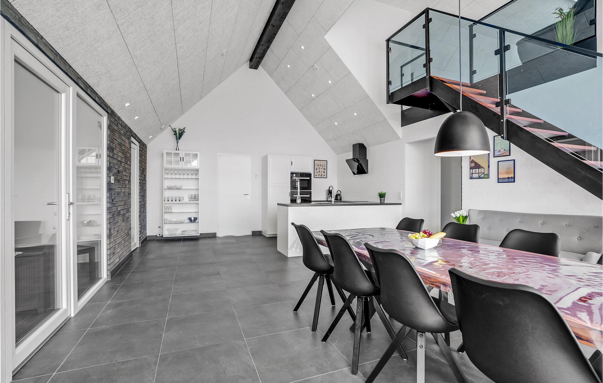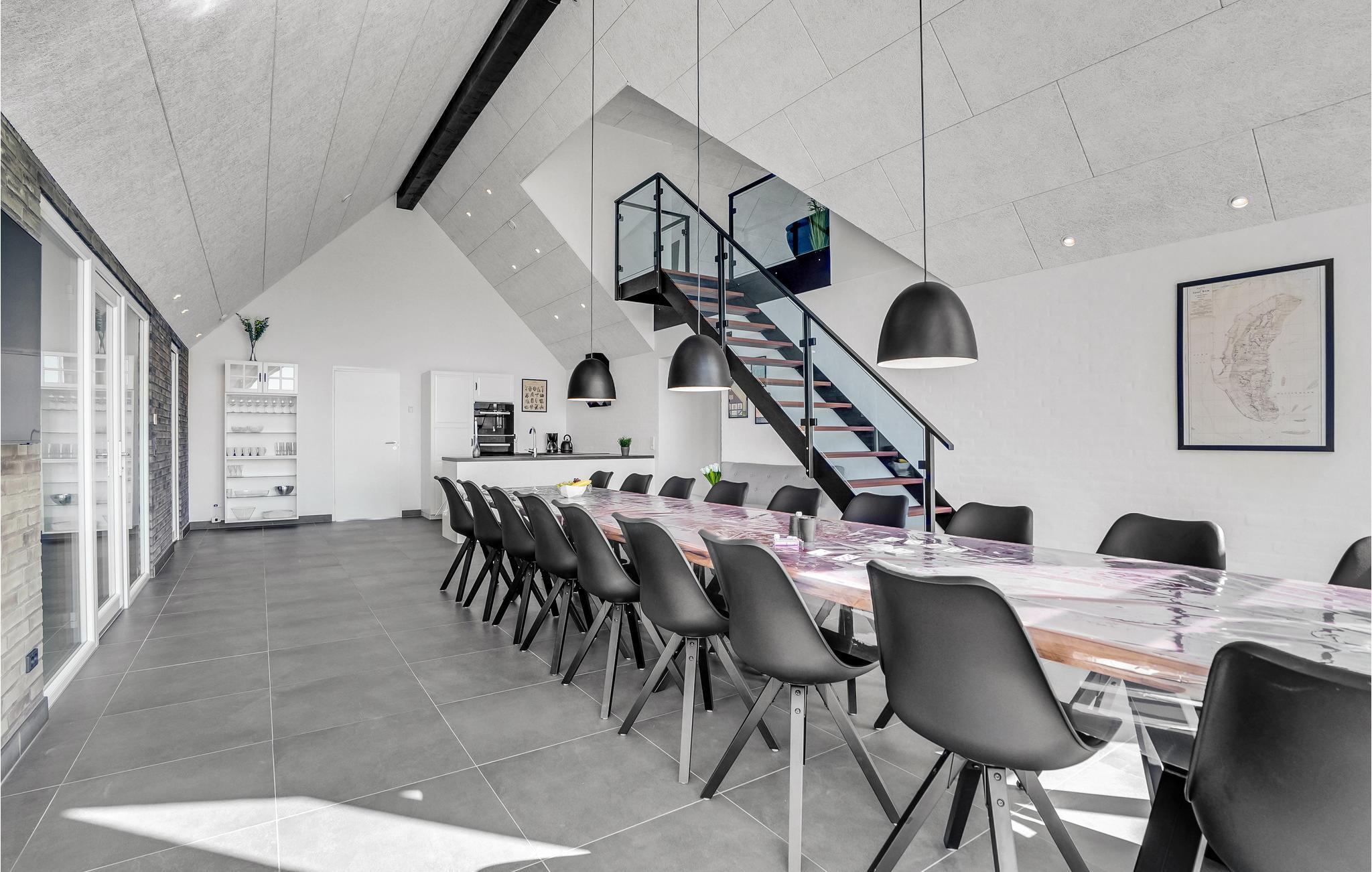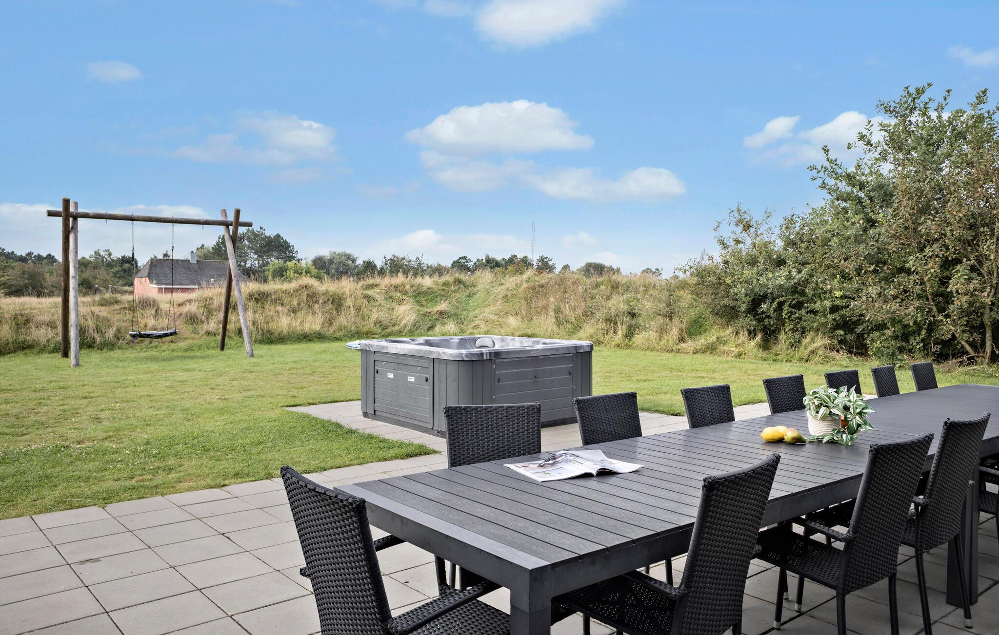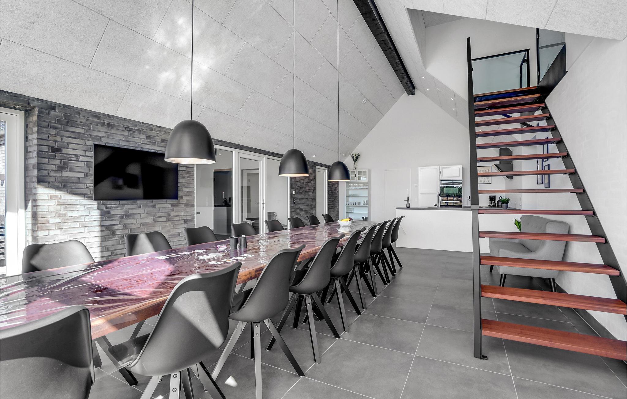 Kommen Sie mit Ihrer Familie bzw. Freunden in dieses luxuriöse, große Ferienhaus. Hier wird Ihnen zu allen Jahreszeiten jeder Komfort geboten. Im oberen Geschoss können Sie sich entspannt zurückziehen. Profitieren Sie von den mit Fernseher ausgestatteten Schlafzimmern, oder dem bequem eingerichteten Lounge-Raum. Hier kann jeder seinen perfekten Rückzugsort finden. Für mehr Aktivität gehen Sie in das Erdgeschoss. In der großräumigen Küche können Sie wunderbar leckere Inselspezialitäten zubereiten, während Sie sich mit Ihren Liebsten unterhalten und die Aussicht auf den Wald genießen. Planschen Sie nebenan im Innenpool oder fordern Sie jemanden zum Tischfußball heraus. Oder möchten Sie lieber sitzend schwitzen? Eine Sauna steht Ihnen ebenfalls zur Verfügung. Im Außenbereich können sich Kinder wunderbar auf dem Trampolin oder der Schaukel austoben, während die Erwachsenen vielleicht der Whirlpool nach draußen lockt? Wer richtiges Dänemark-Feeling erleben möchte, probiert im Shelter auf dem Grundstück im Freien zu schlafen.