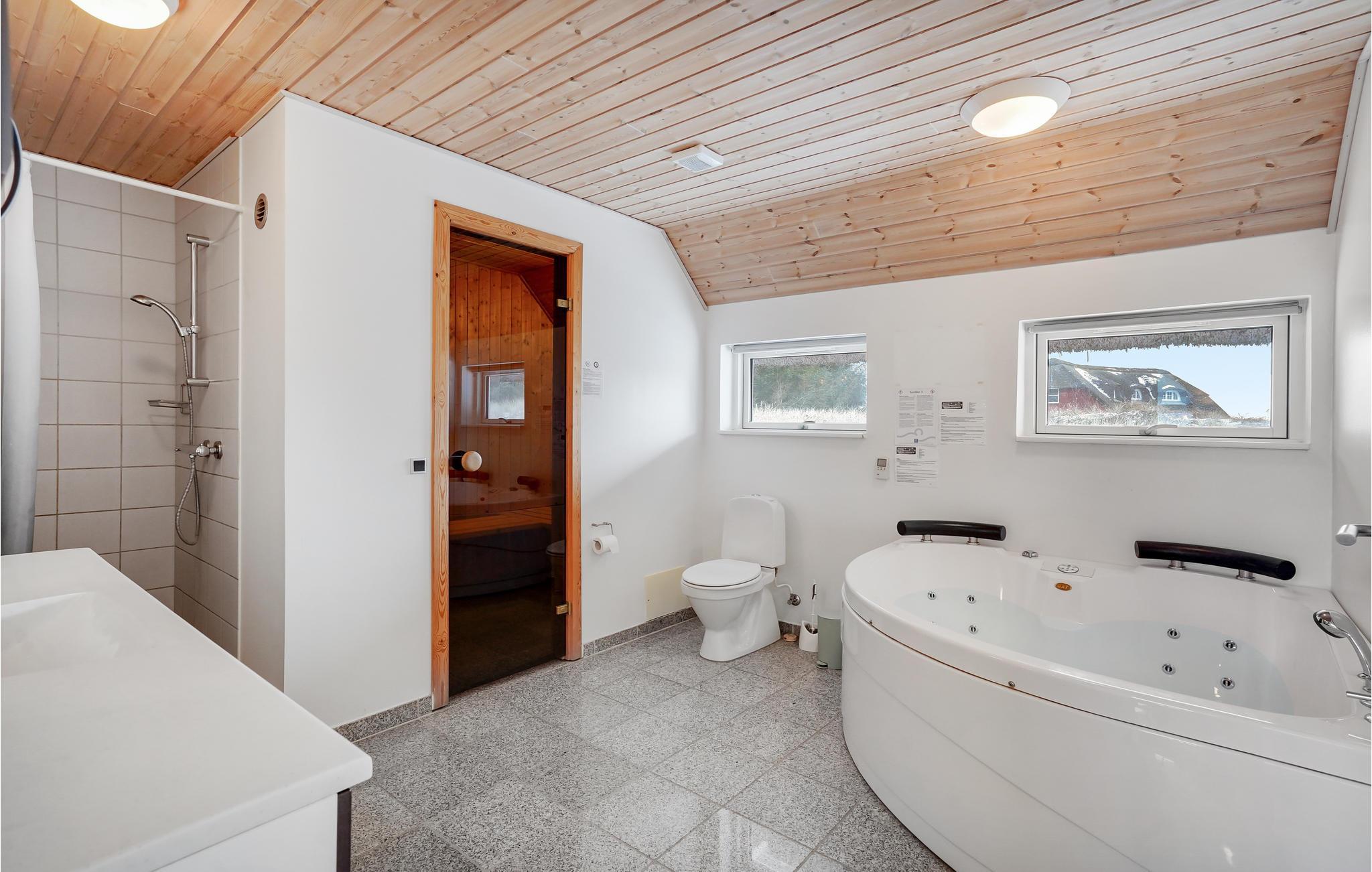 Alle Räume des gediegenen und hübschen Hauses sind mit schönen Marmor-Klinkerböden und Fußbodenheizung ausgestattet. Der große Wohnraum hat eine offene Dachkonstruktion und die nach Westen gelegene Giebelpartie sorgt für einen fantastischen Lichteinfall. Von den offenen Schlafböden, die teils als Schlafräume und teils als TV-/Spielräume eingerichtet sind, haben Sie Aussicht über die Wohnstube und gen Westen. Es steht Ihnen ebenso ein Whirlpool und eine Sauna zur Verfügung, wo Sie sich vollkommen entspannen können. Der Außenbereich lädt auch zu Aktivitäten in den Ferien ein, u.a. zum Grillen mit Ihren Freunden und Familie.