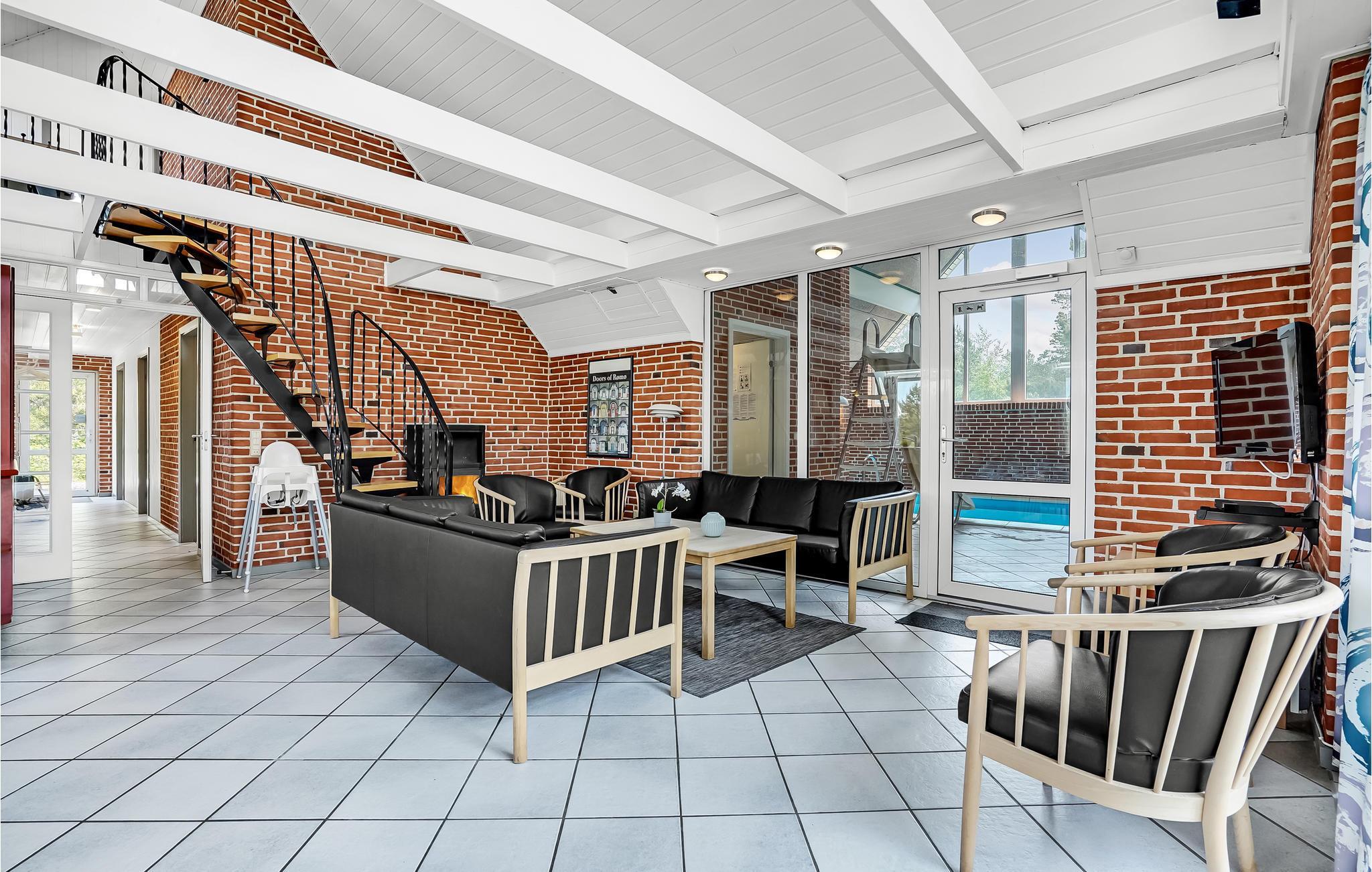 In diesem Haus wurde auf sowohl die praktische Einrichtung als auch den visuellen Eindruck Wert gelegt. Von der Wohnküche mit Kamin, die im Herzen des Hauses liegt, haben Sie Aussicht zum Poolraum mit Gegenstromanlage und Wasserrutsche. Eine Tür führt vom Wohnzimmer auf die Terrasse.