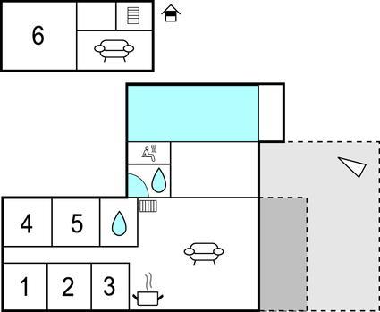Whirlpool in einem der Badezimmer, das mit dem Poolbereich verbunden ist. Eine Wendeltreppe führt in den ersten Stock mit dem größten Schlafraum des Hauses und einer gemütlichen Ecke mit Kicker. Alle anderen Zimmer sind ohne Türschwellen, auch das Badezimmer mit breiter Tür, ohne Türschwellen und behindertengerechte Dusche wie WC. Schöne Aussicht auf die Düunenlandschaft von Toftum mit der einladenden Ferienhaussiedlung. 20 m vom Haus gibt es einen gemeinsam genutzten Fußballplatz.