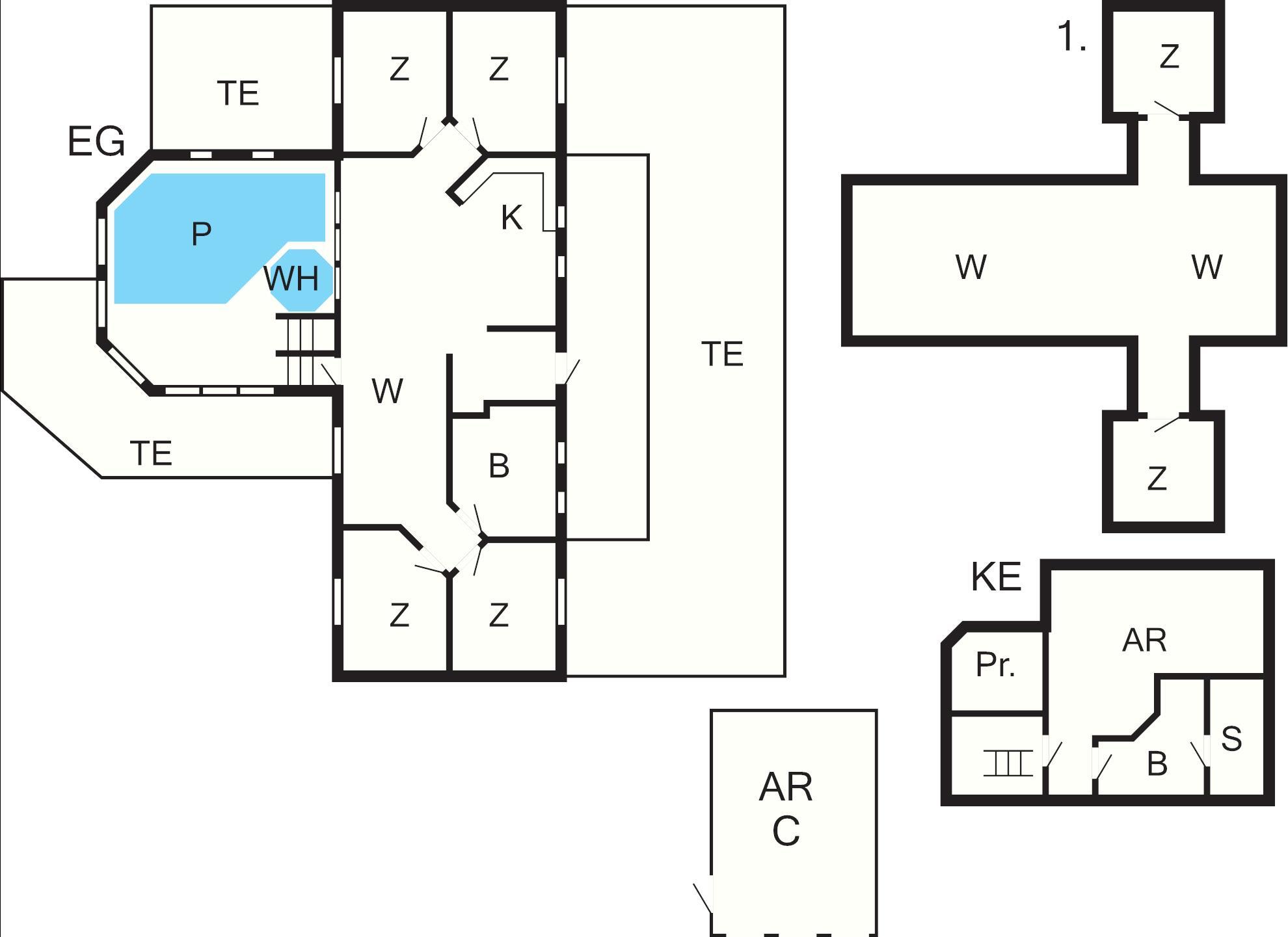 6 Schlafz.: (1DB)+(1DB)+(1DB)+(1DB)+(2B)+(1DL), Kinderbett