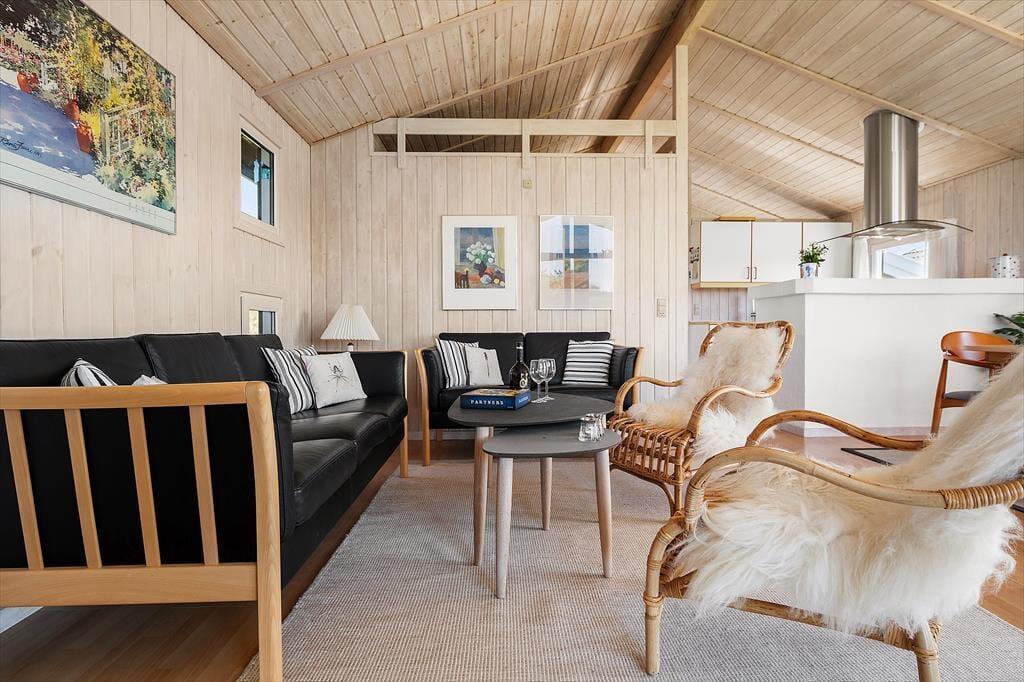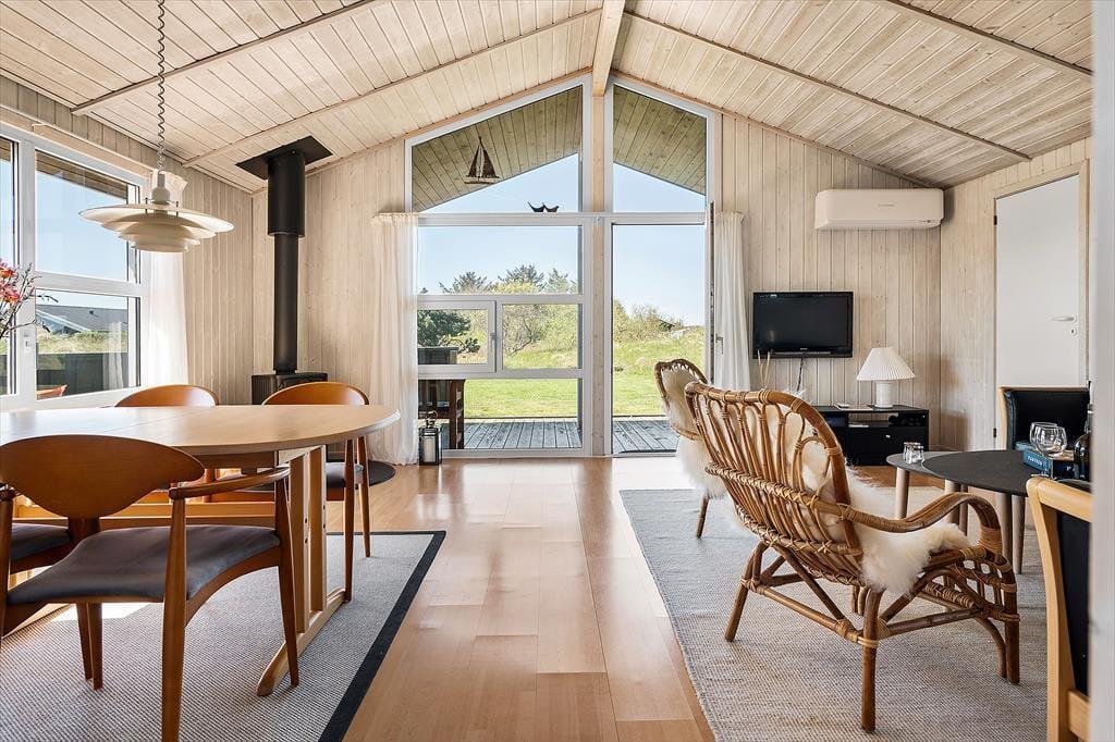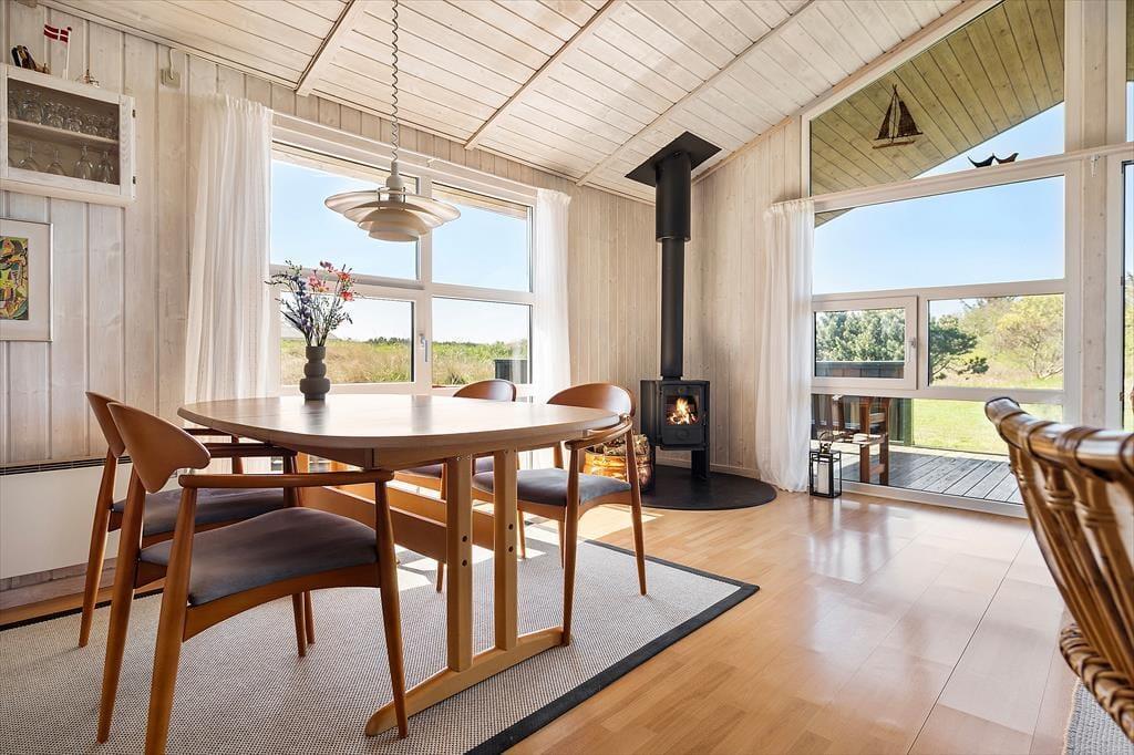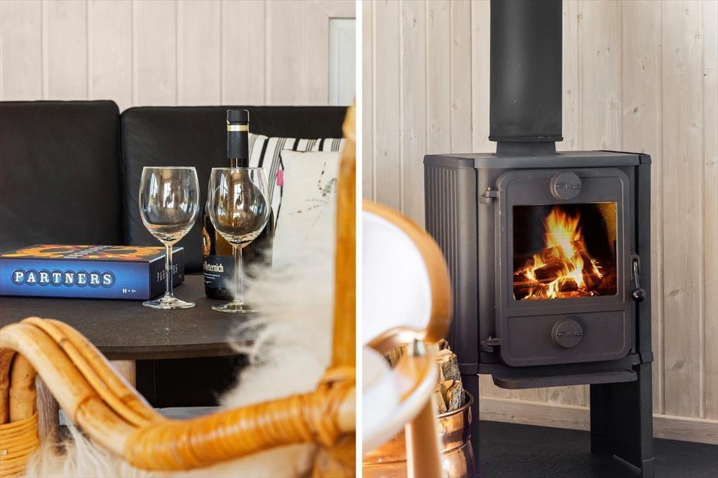 Drinnen begrüßt Sie eine gemütliche Atmosphäre, die das Ferienhaus zum perfekten Ort für einen Urlaub macht. Das Wohnzimmer ist hell eingerichtet mit komfortablen Möbeln, die es Ihnen ermöglichen, sich zu entspannen und ein gutes Buch zu lesen oder sich mit Ihren Liebsten zu unterhalten. Der Kaminofen sorgt für eine zusätzliche gemütliche Stimmung an kühleren Tagen, an denen Sie die Wärme genießen können, während die Flammen tanzen. Die offene Raumaufteilung zwischen Küche und Wohnzimmer ist ideal, damit die ganze Familie zusammen sein kann, während Sie kochen oder einfach nur entspannen. Das Ferienhaus bietet Platz für bis zu 6 Personen und die helle Einrichtung sowie die bequemen Möbel schaffen eine angenehme und entspannte Urlaubsatmosphäre.