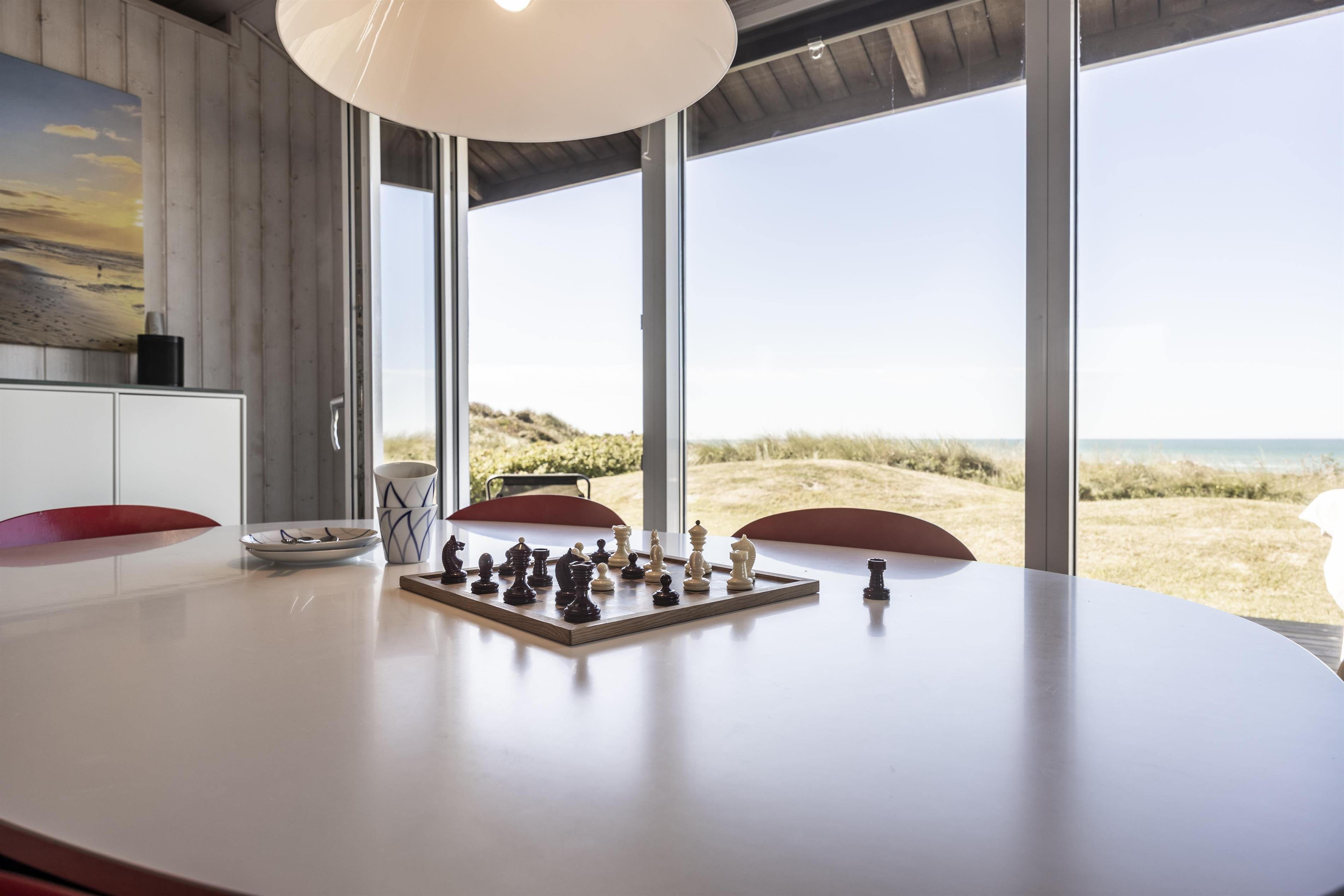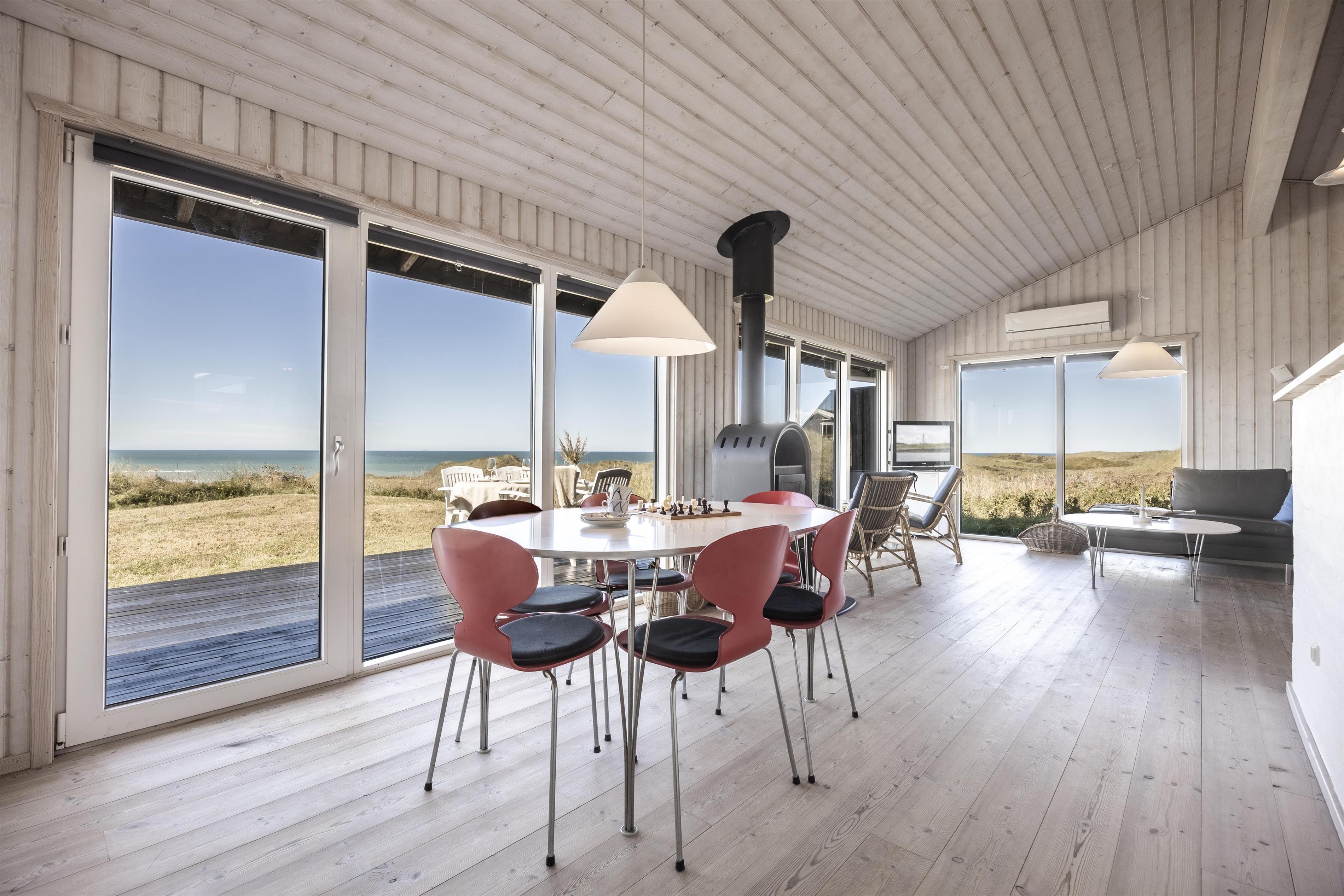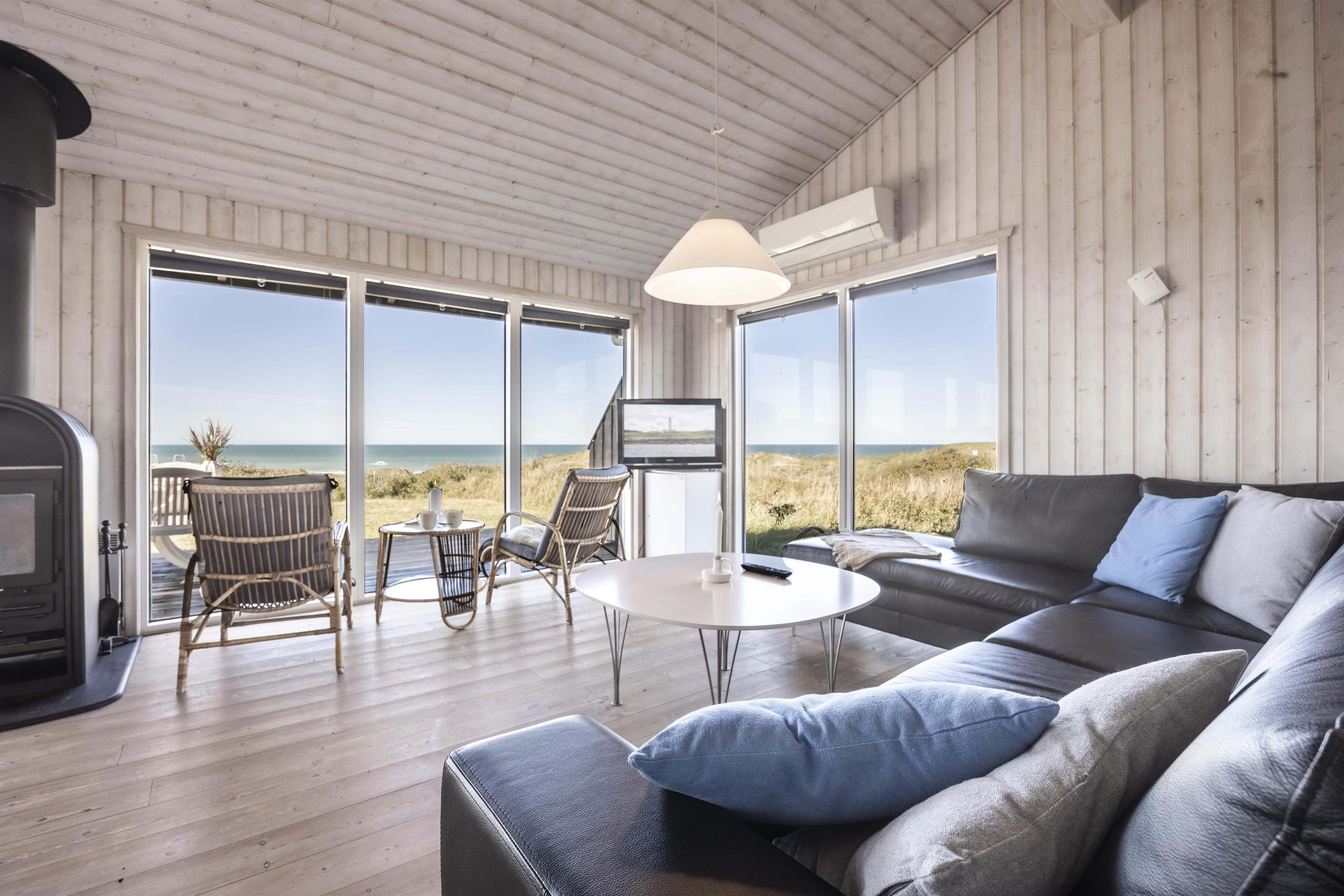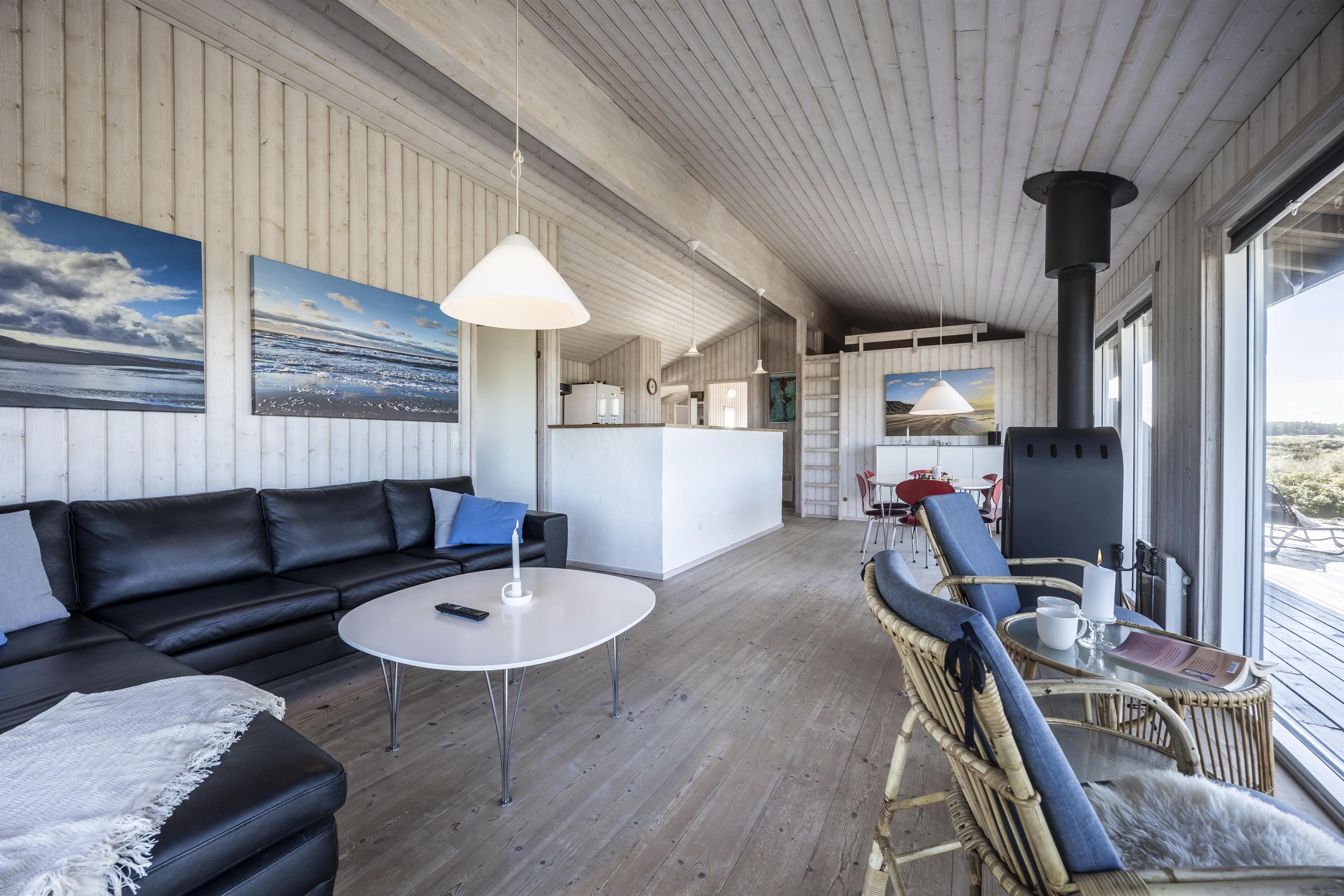 A special corner of the living room has been designed for quiet moments – perfect for a good book or simply for admiring the spectacular view. Here you can also gather for board games while enjoying the sea view, or light up the wood-burning stove for warmth and comfort on a cool day.