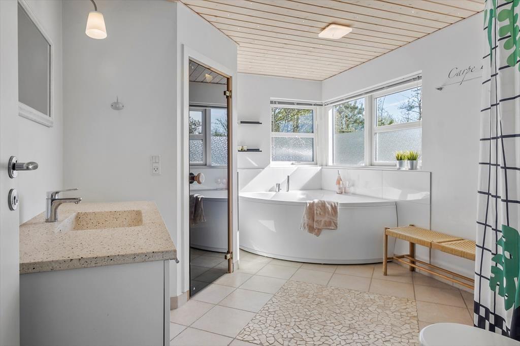 Mit einer Fläche von 1.750 m² bietet Ihnen das Ferienhausgrundstück einen schönen Rahmen zum Umhertollen und Ballspielen. Alternativ begeben Sie sich auf das riesige Gemeinschaftsareal des Tranum Ferieby, auf dem Sie Fußballgolf, Boccia, Beachvolleyball und vieles mehr spielen können. Mit seinem großen Spielplatz, dem Multifunktionsplatz und den Bolzplätzen erwartet Sie ein Eldorado für alle Altersgruppen. Die Natur ringsum ist friedvoll und schön. In den Wald- und Naturgebieten Langdal Plantage, Fosdalen und Tranum Klitplantage können Sie nach Herzenslust wandern. Falls es Sie eher an den Strand zieht, erreichen Sie binnen kurzer Zeit den Tranum Strand sowie die anderen tollen Strände der Jammerbucht.