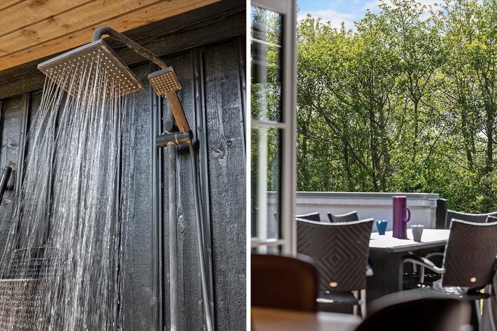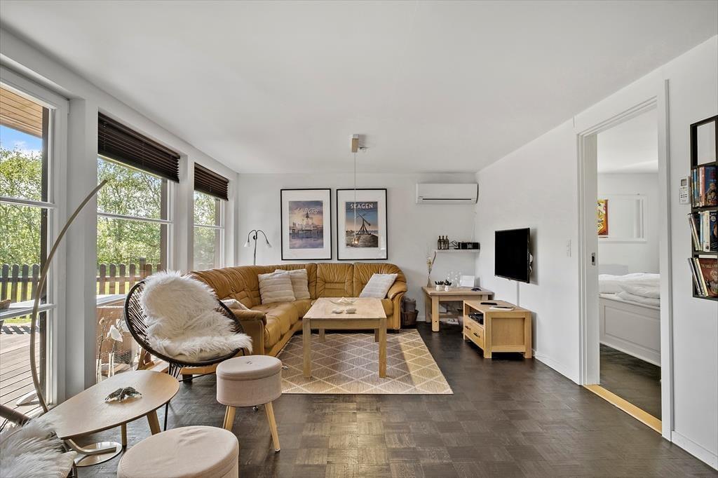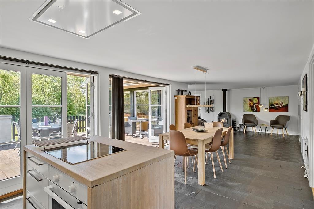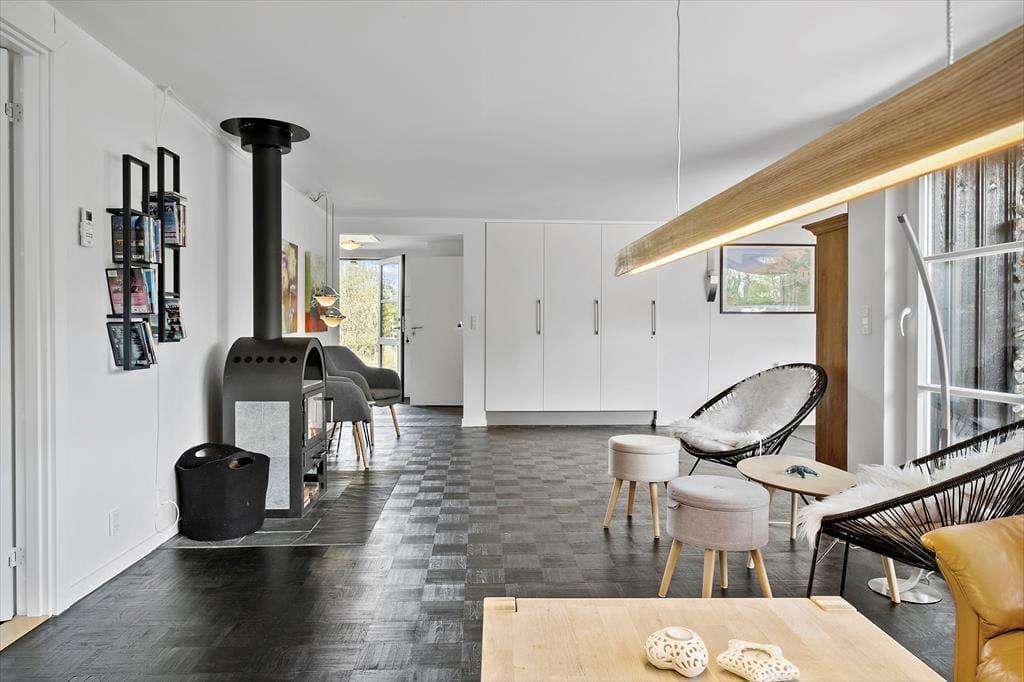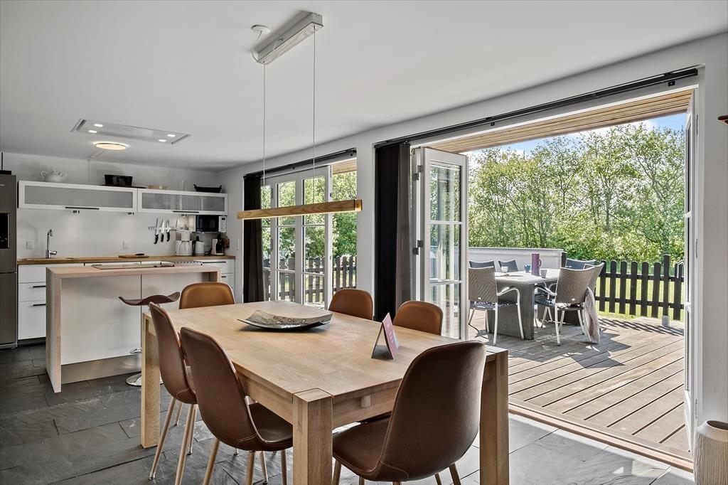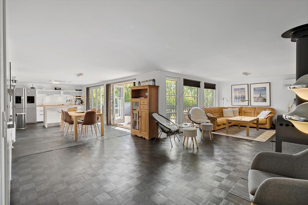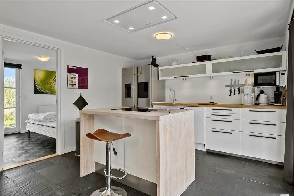 Die 124 m² des Hauses bieten viel Platz und sind ideal für Familien mit Kindern oder zwei Paare, die sich eine schöne Zeit zusammen wünschen. Der Treffpunkt des Hauses ist die offene Küche mit dem Essbereich. Hier können Sie die großen Fensterfronten zur Terrasse hin öffnen, sodass Sie den dänischen Sommer in vollen Zügen genießen können. Die Küche ist hochwertig ausgestattet, mit unter anderem einem amerikanischen Kühlschrank und von der Kochinsel aus können Sie während des Kochens einen Blick auf die Familie werfen. Die auffälligen, schwarzen Fußböden, die im ganzen Haus verteilt sind und aus Schieferplatten oder aus schwarz lackierten Holzböden bestehen, passen sehr gut zu den Möbeln und der restlichen Einrichtung. Es gibt insgesamt drei Schlafzimmer sowie zwei Badezimmer. Als zusätzlichen Luxus gibt es außerdem einen Whirlpool und eine Sauna, um nach einem langen Tag am Strand, in der Natur oder in der Außenanlage in der Umgebung, die Batterien wieder aufzuladen.