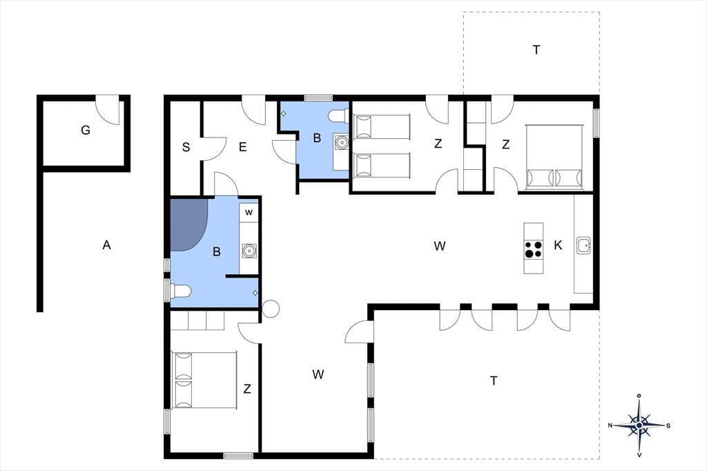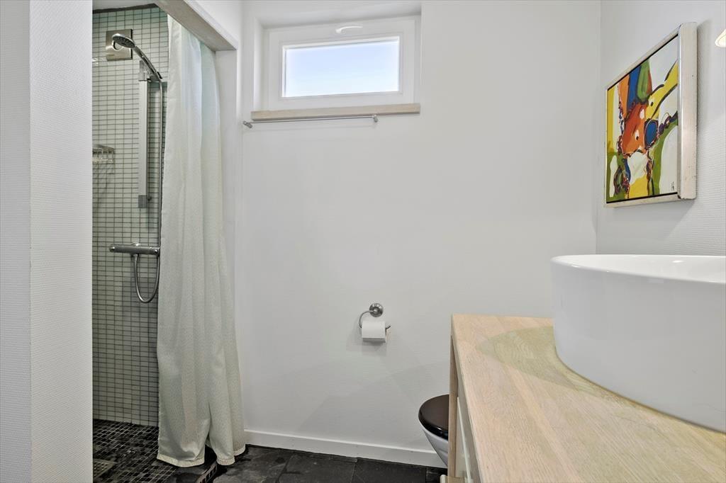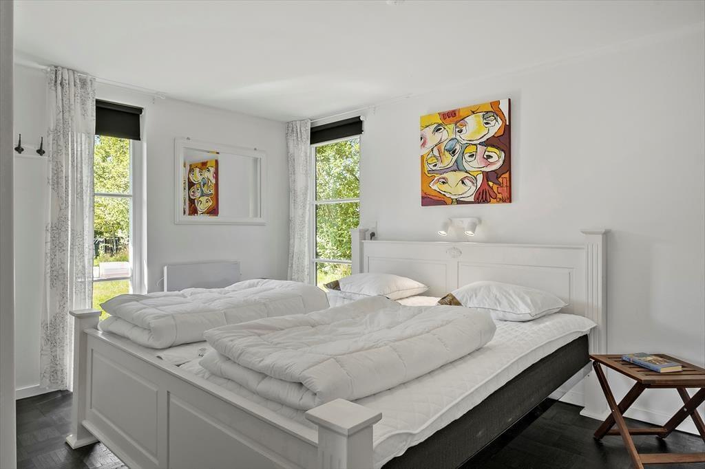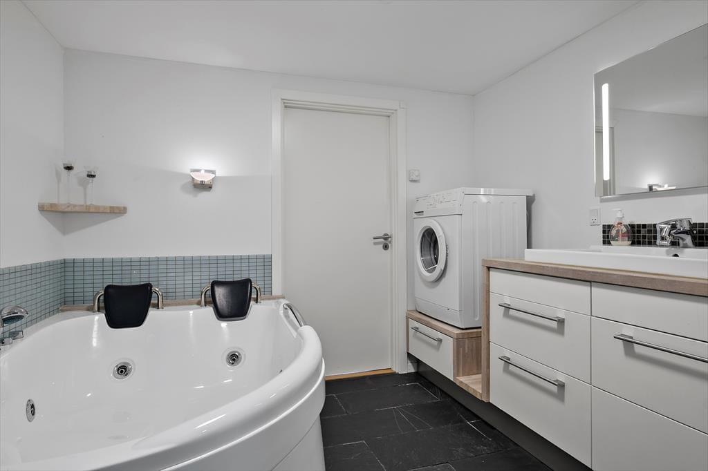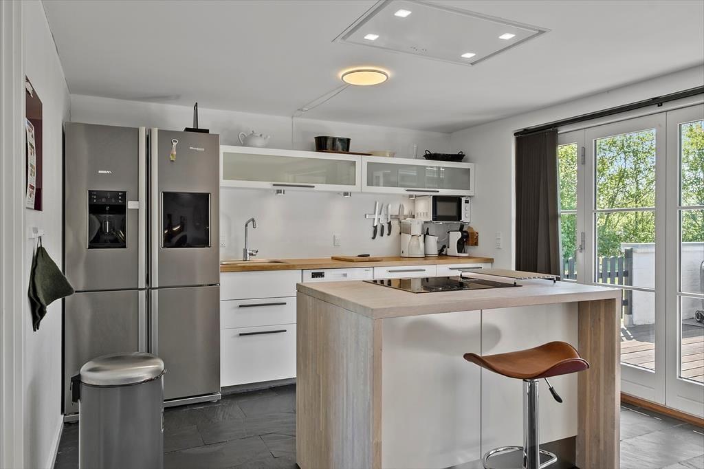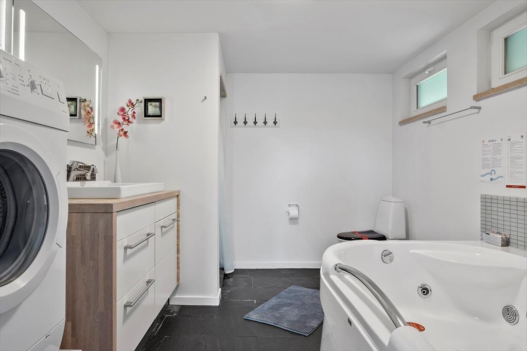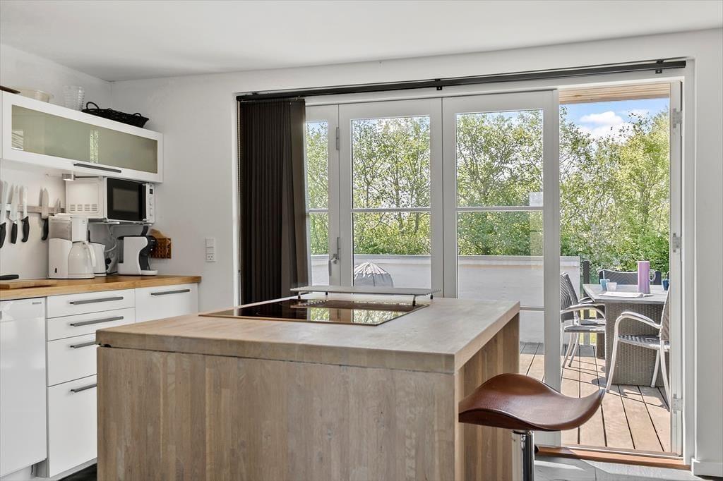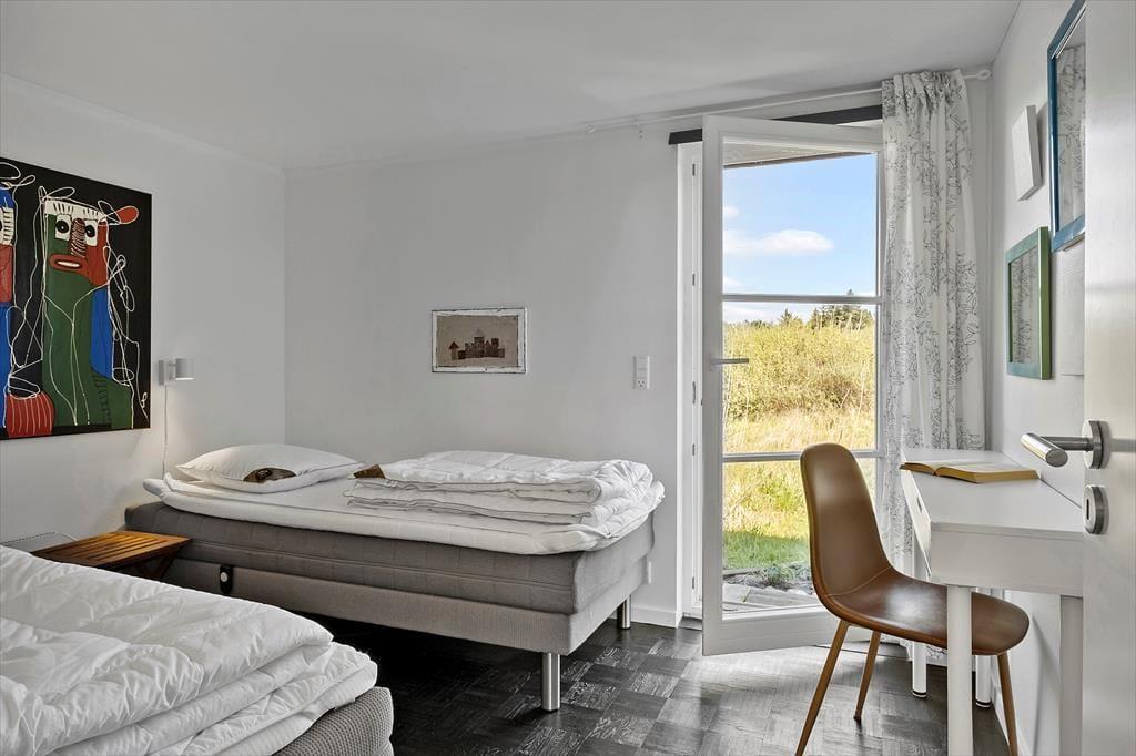 Die 124 m² des Hauses bieten viel Platz und sind ideal für Familien mit Kindern oder zwei Paare, die sich eine schöne Zeit zusammen wünschen. Der Treffpunkt des Hauses ist die offene Küche mit dem Essbereich. Hier können Sie die großen Fensterfronten zur Terrasse hin öffnen, sodass Sie den dänischen Sommer in vollen Zügen genießen können. Die Küche ist hochwertig ausgestattet, mit unter anderem einem amerikanischen Kühlschrank und von der Kochinsel aus können Sie während des Kochens einen Blick auf die Familie werfen. Die auffälligen, schwarzen Fußböden, die im ganzen Haus verteilt sind und aus Schieferplatten oder aus schwarz lackierten Holzböden bestehen, passen sehr gut zu den Möbeln und der restlichen Einrichtung. Es gibt insgesamt drei Schlafzimmer sowie zwei Badezimmer. Als zusätzlichen Luxus gibt es außerdem einen Whirlpool und eine Sauna, um nach einem langen Tag am Strand, in der Natur oder in der Außenanlage in der Umgebung, die Batterien wieder aufzuladen.