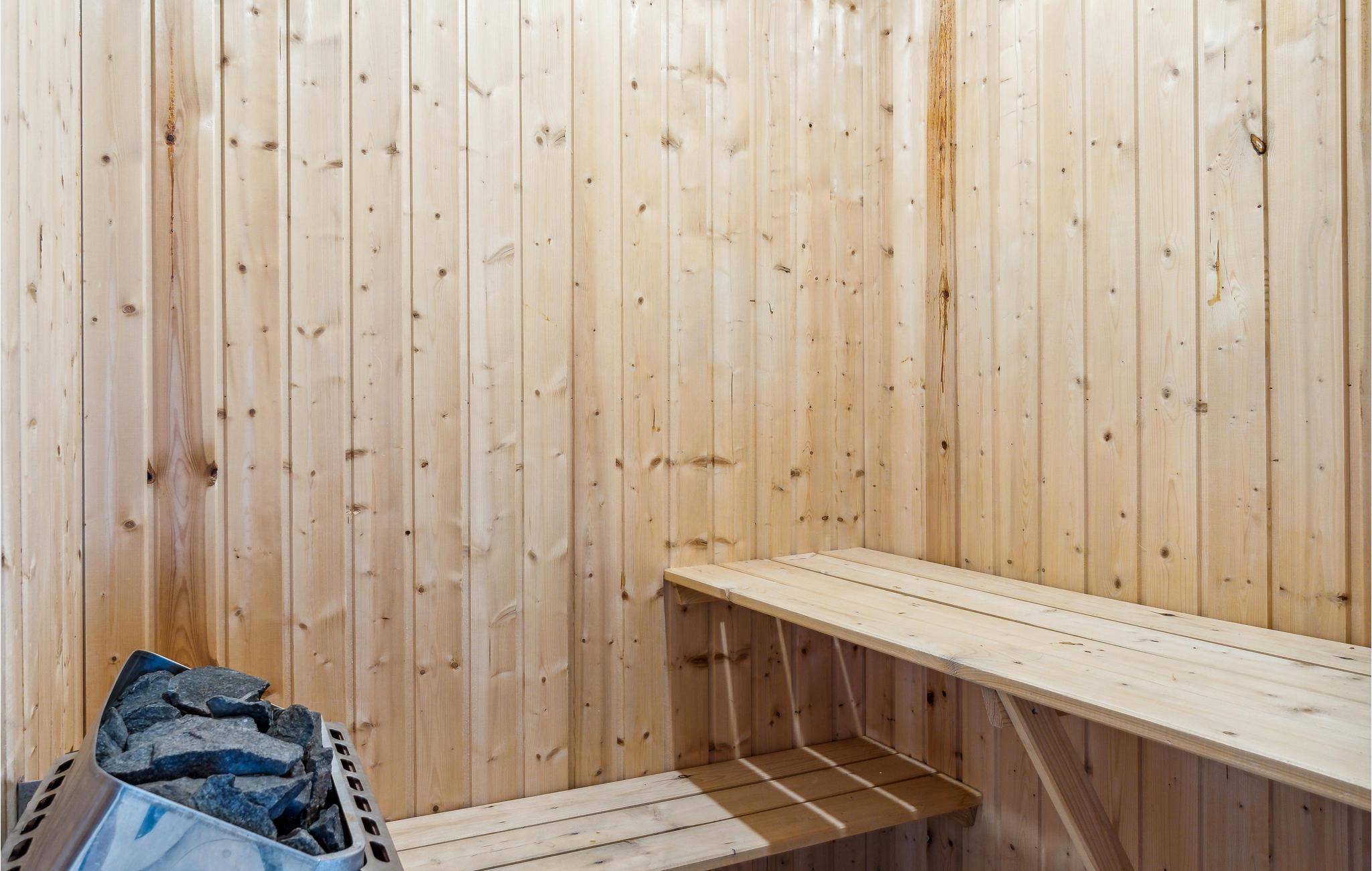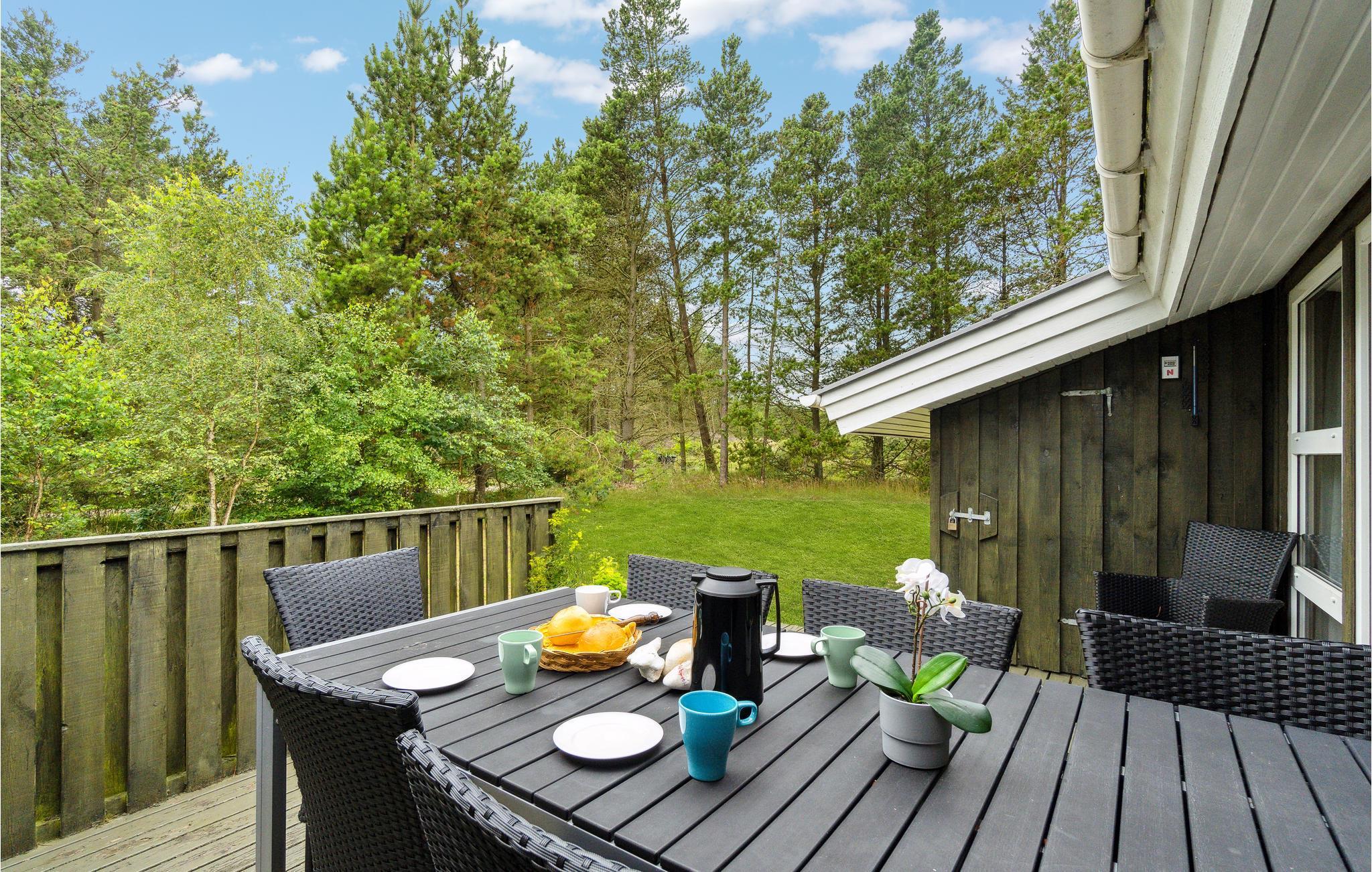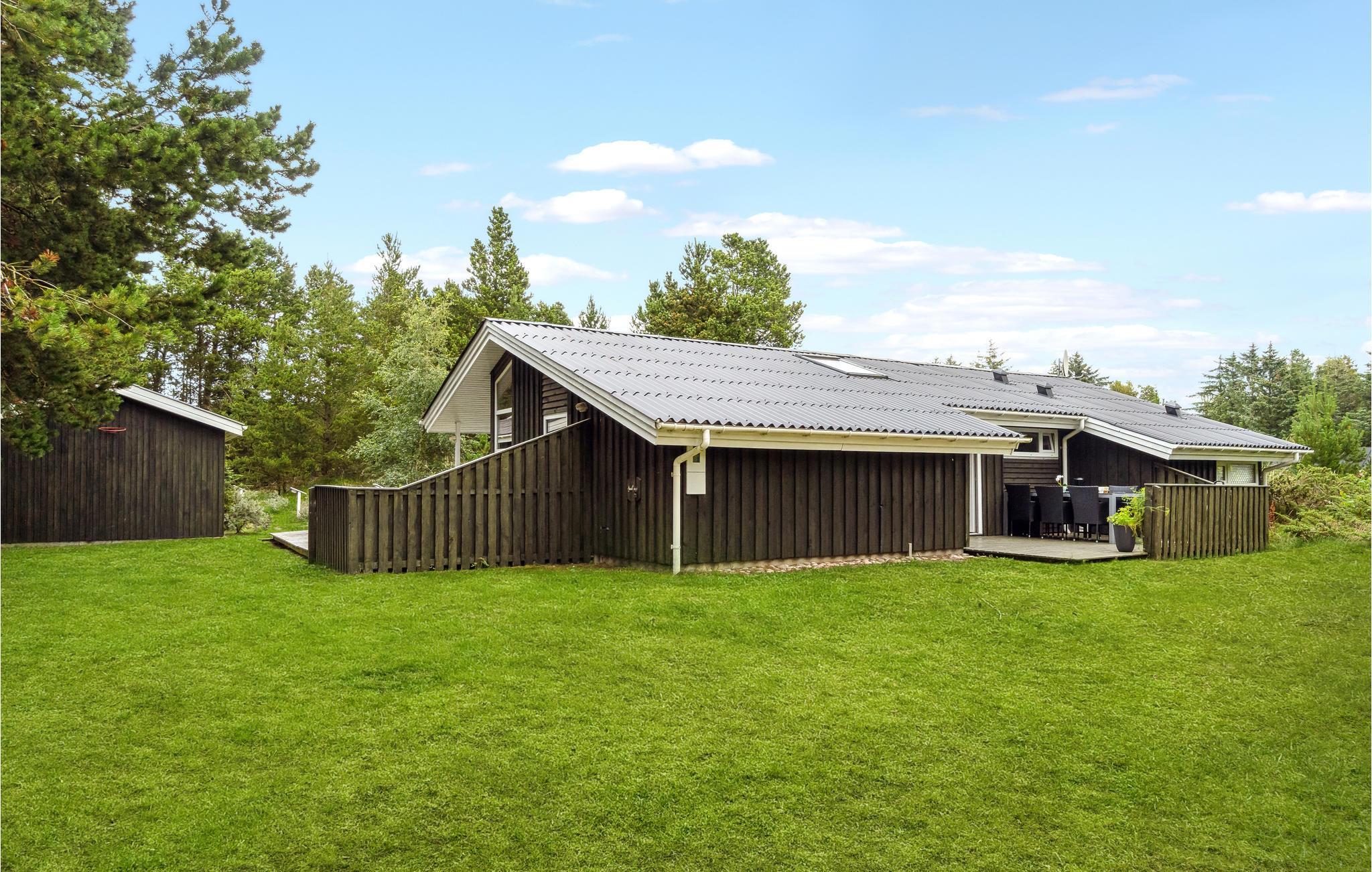Auf einem hügeligen Naturgrundstück mit Heidekraut und vielen windgeschützten Stellen liegt dieses gepflegte Ferienhaus. Mitten im Haus - am Wohnraum - befindet sich die helle Küche mit komfortabler Ausstattung. Der Wohnraum mit Holzboden ist geräumig und gemütlich eingerichtet mit Sitzgarnitur an der großen Fensterfront. Der Kaminofen schafft eine gemütliche Atmosphäre, wenn er an kühleren Abenden befeuert wird. Vom Wohnraum haben Sie Zugang zur offenen Süd- und zur offenen Nordterrasse, beide aus Holz. Von der Südterrasse können Sie den Kindern beim Spielen zusehen, während Sie selbst ein Buch lesen.