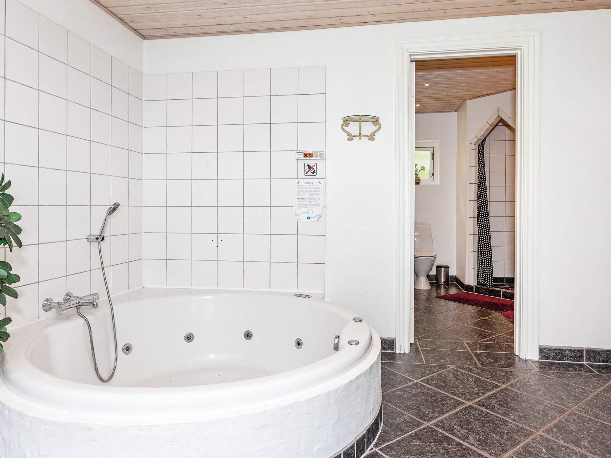Großes und gut gelegenes Ferienhaus mit Whirlpool, Sauna und Aktivitätsraum. Sowohl von Haus als auch vom Grundstück aus sieht man den 250 m entfernten Limfjord. Küchen-Wohnraum mit Fußbodenheizung, Holzofen und komfortablen Möbeln. Der Fernseher empfängt auch internationale Programme und es gibt zwei Stereoanlagen mit CD-Spieler. Die Küche verfügt u.a. über Ceranfeldherd, Gefrierschrank und Spülmaschine. Es ist hier möglich, auf einen langen Tisch für 26 Personen aufzudecken, falls Sie eine Familienfeier planen. Für Ihr persönliches Wellnessprogramm stehen der 4-Personen Whirlpool und eine Sauna bereit. Vorher können Sie sich im Aktivitätsraum bei Airhockey, Dart, Poolbillard oder am Kicker verausgaben. Im Erdgeschoss gibt es drei Schlafzimmer und ein Bad. Im 1. Stock befinden sich zwei weitere Schlafzimmer und ein Wohnzimmer mit extra TV. Von dem einen der Schlafzimmer geht es hinaus auf den Balkon, von dem Sie einen herrlichen Blick auf den Limfjord haben. In diesem Zimmer ist auch ein Hems mit zwei weiteren Schlafplätzen. Eins der Zimmer ist als Kinderzimmer eingerichtet, mit Kojenbett, das unten 1,20 m breit ist und oben ein Einzelbett hat. Für Kinder stehen zwei Babybetten, zwei Hochstühle, Spielzeug und ein Buggy bereit. Im Garten gibt es ein Trampolin (Nutzung auf eigene Gefahr). Die Terrasse ist mit einer elektrischen Markise versehen - ideal, wenn die Sonne zu stark ist. Das Restaurant Trend Kro sowie der Kaufladen im nahen Campingplatz, der in den Sommermonaten geöffnet ist, sind zu Fuß erreichbar.