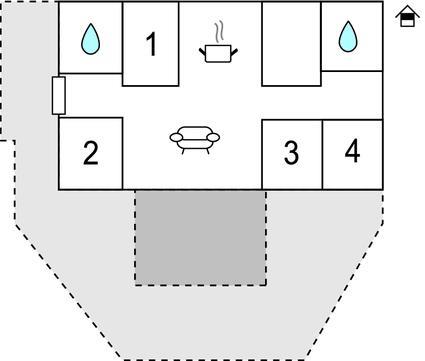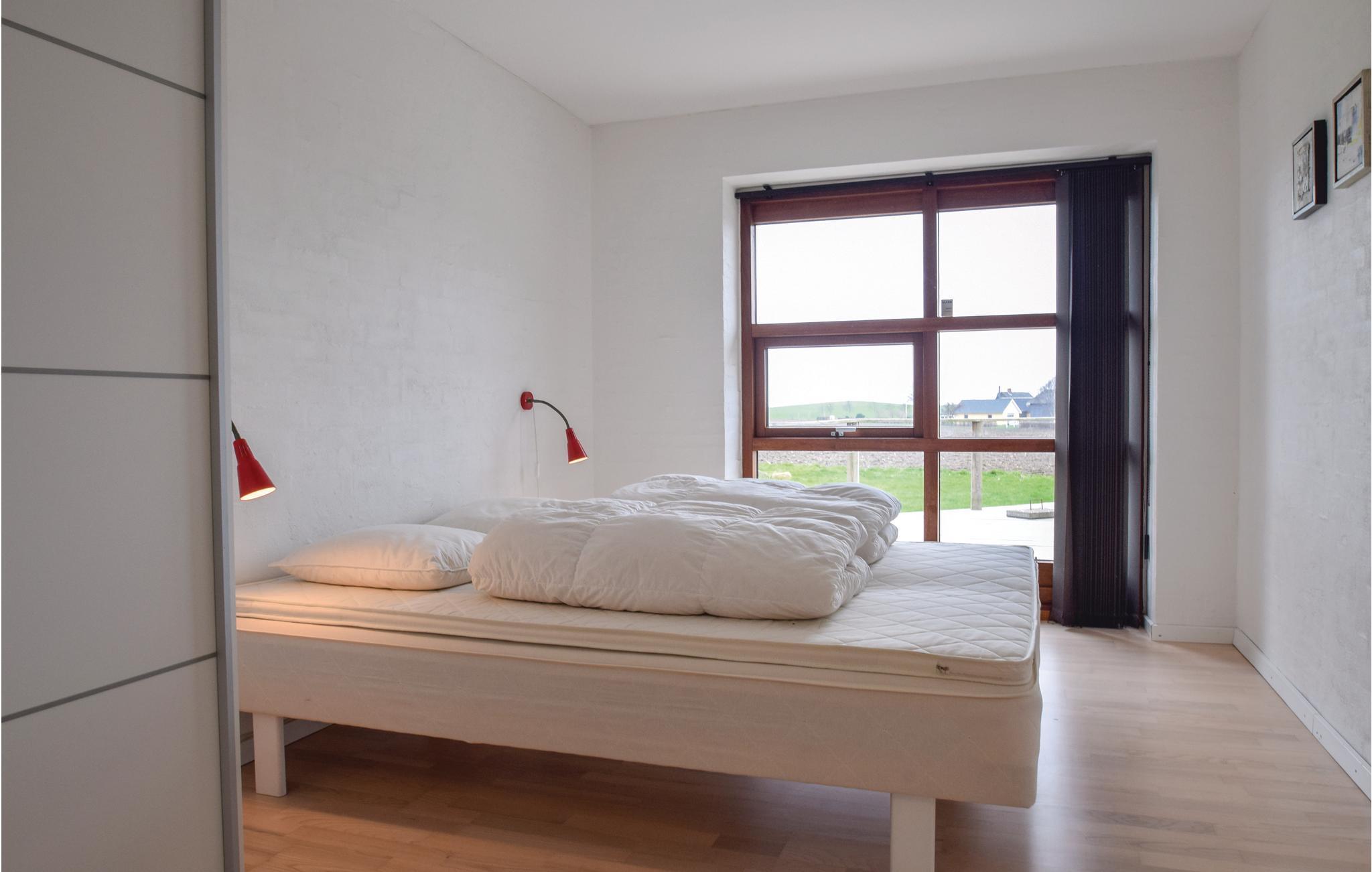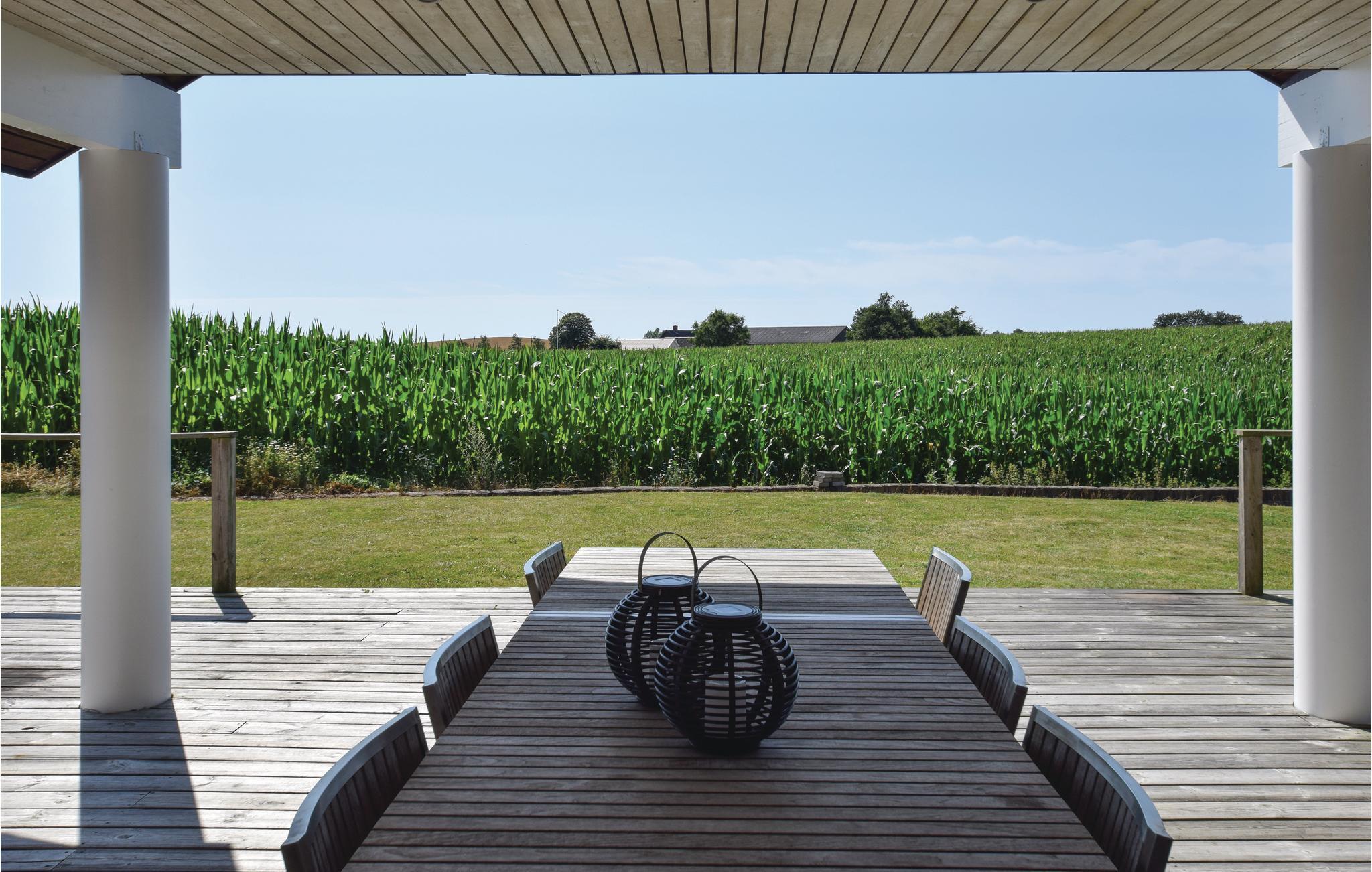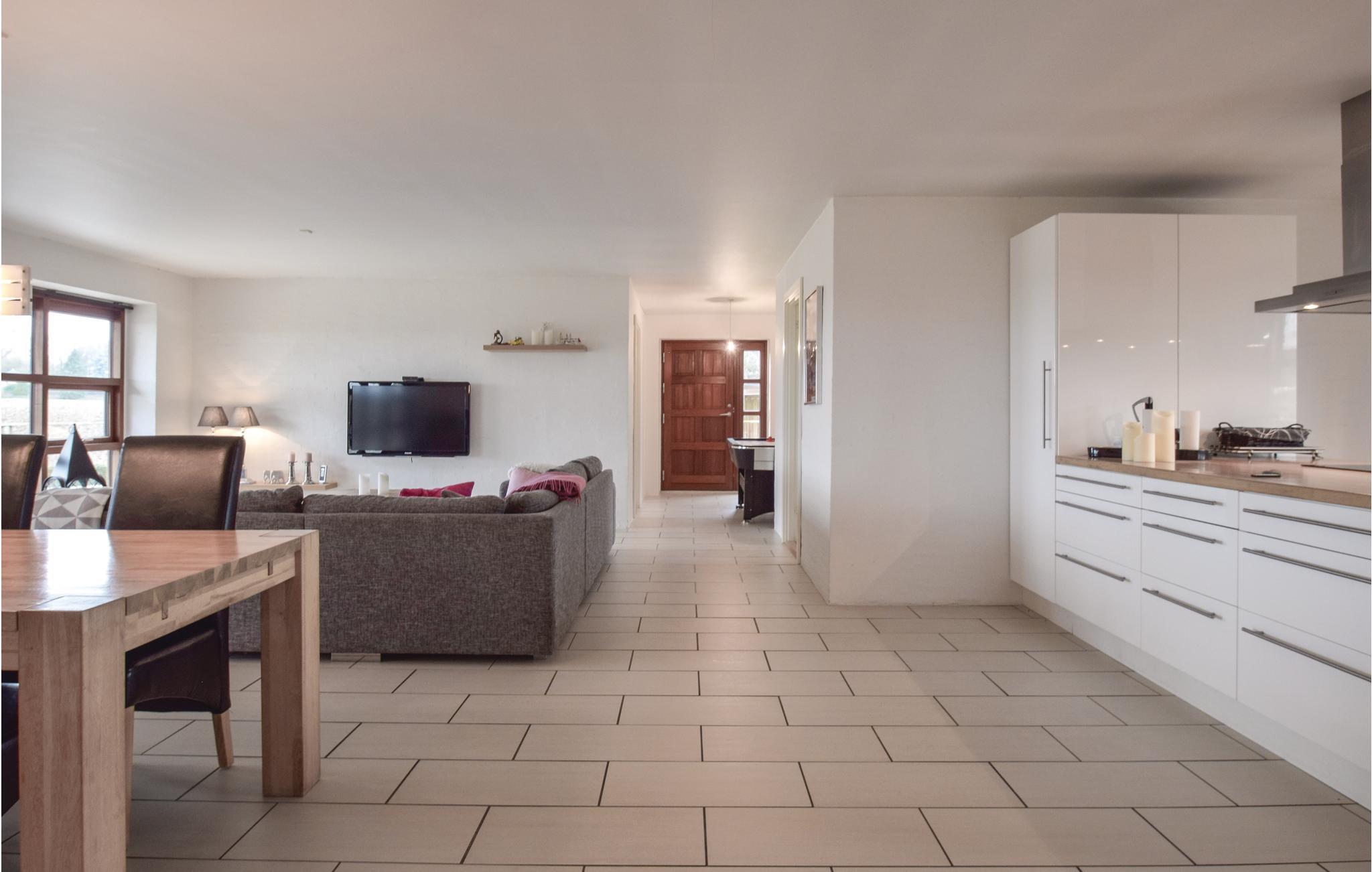 Das Haus hat eine große hölzerne Terrasse und steht mit dem Blick auf die Felder. Das Haus erscheint mit weißen Wänden und hellem Holz- und Klinkerboden hell und freundlich in seiner Einrichtung. Mit seiner Lage bietet das Haus einen guten Ausgangspunkt für Ausflüge in die umliegende Natur. Es sind auch nur 5,5 km zum sehr schönen Ristinge Strand.