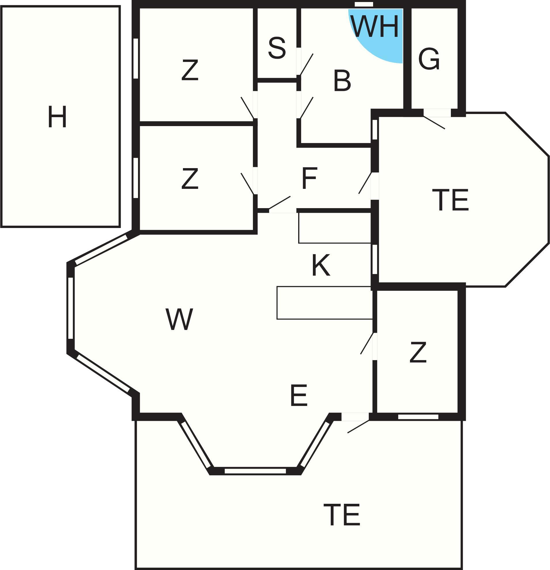 Off. Küche: E-Herd, Kühlschr. m. Gefrierfach, Mikrow., Abzugsh., Kaffeem., Spülm., Waschm, Trockner