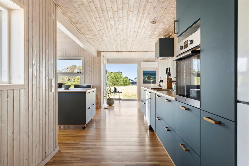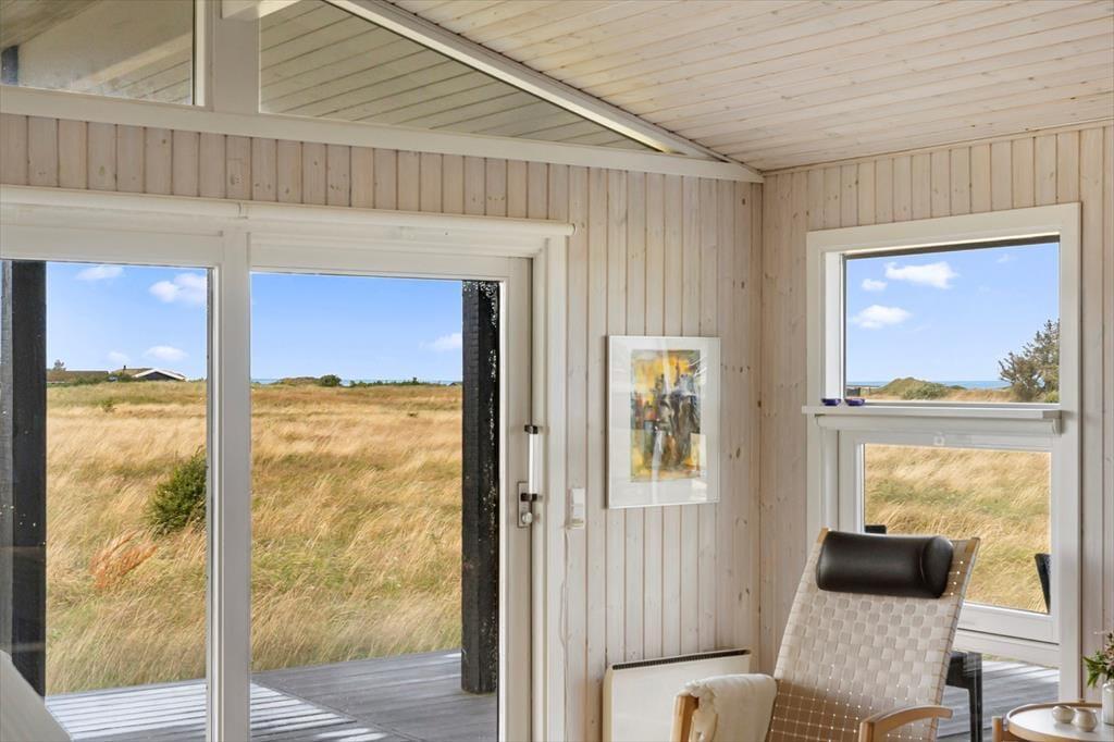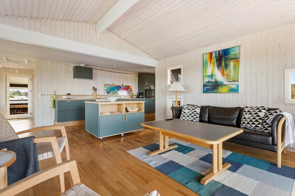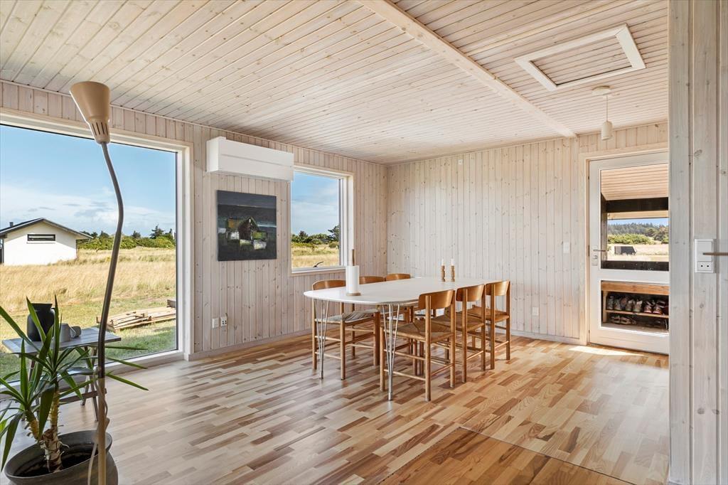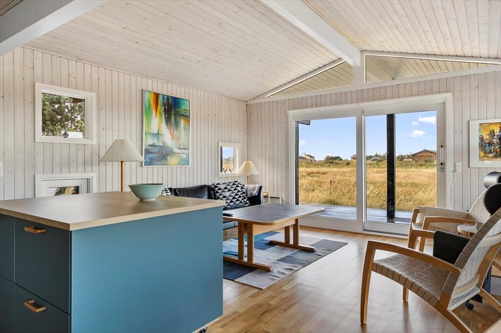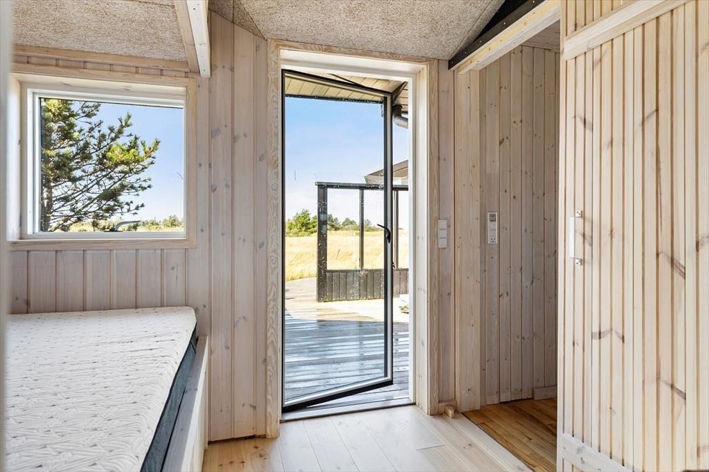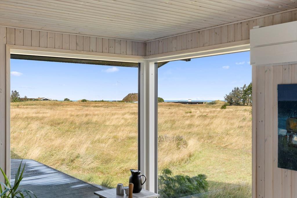 Umgeben von der nordjütischen Natur liegt das Ferienhaus auf einem schönen und ruhigen Naturgrundstück, das den Blick über die hügelige Landschaft bis hin zum Meer freigibt. Die großzügige Terrassenlandschaft erstreckt sich in mehrere Himmelsrichtungen und macht es leicht, der Sonne von früh bis spät zu folgen. Die Ostterrasse ist ideal für das Frühstück im Freien, während die überdachte Westterrasse zu Grillabenden und geselligem Beisammensein einlädt – auch wenn der Abendtau fällt und die Sonne am Horizont untergeht. Auf der Südterrasse sorgt eine Glaswand für Windschutz, sodass du auch bei Westwind die Wärme in der Sonnenliege genießen kannst. Vom Wohnzimmer, der Küche und dem Verbindungsraum aus hast du direkten Zugang zu den Terrassen – perfekt, um an warmen Sommertagen drinnen und draußen fließend ineinander übergehen zu lassen. Ein Ort, an dem du den Wechsel der Jahreszeiten hautnah erlebst – und die Natur den Takt vorgibt.