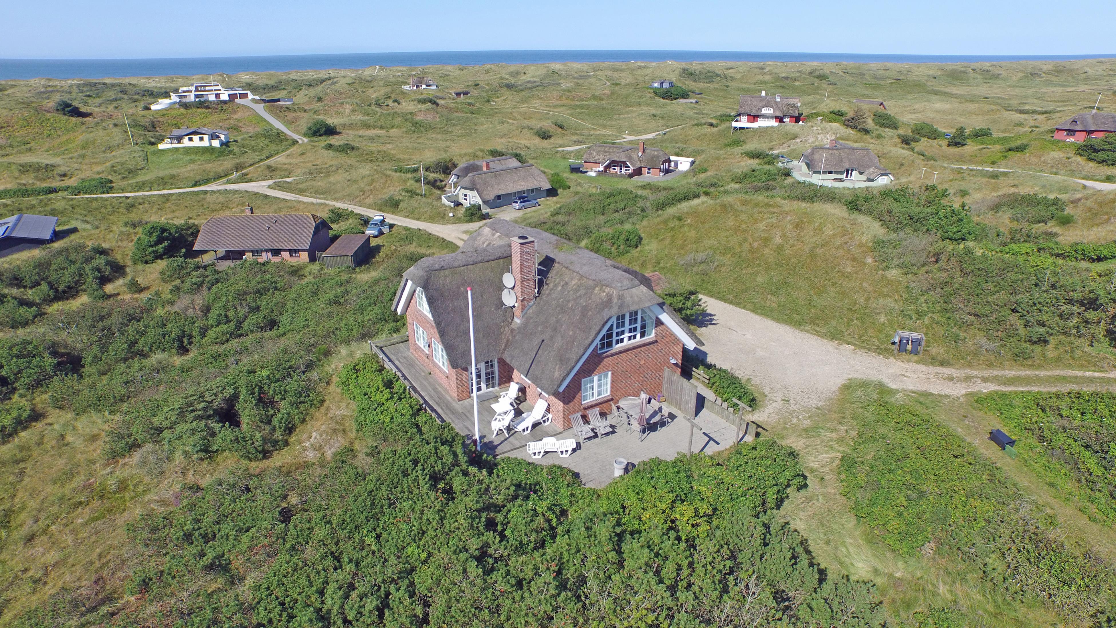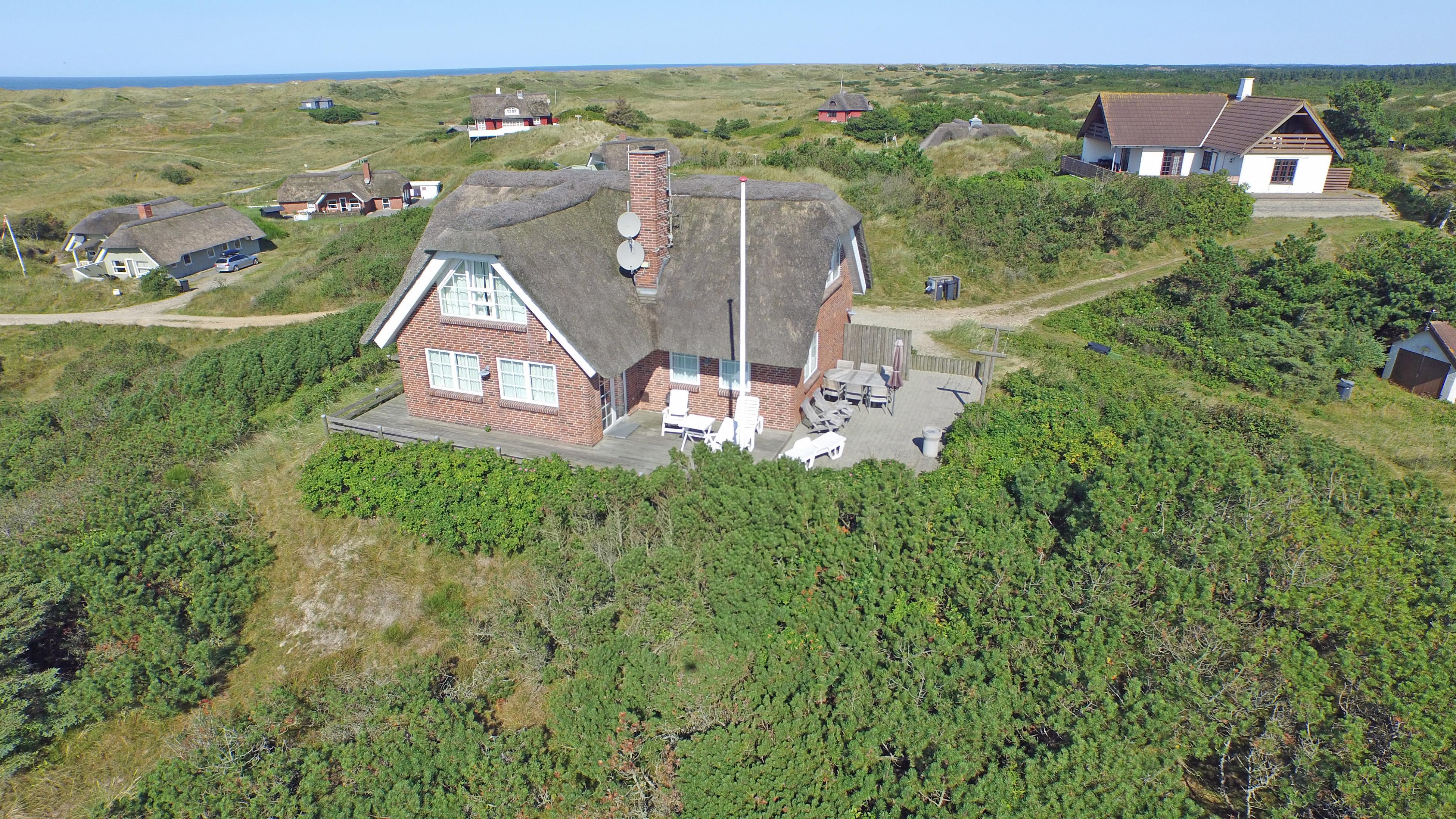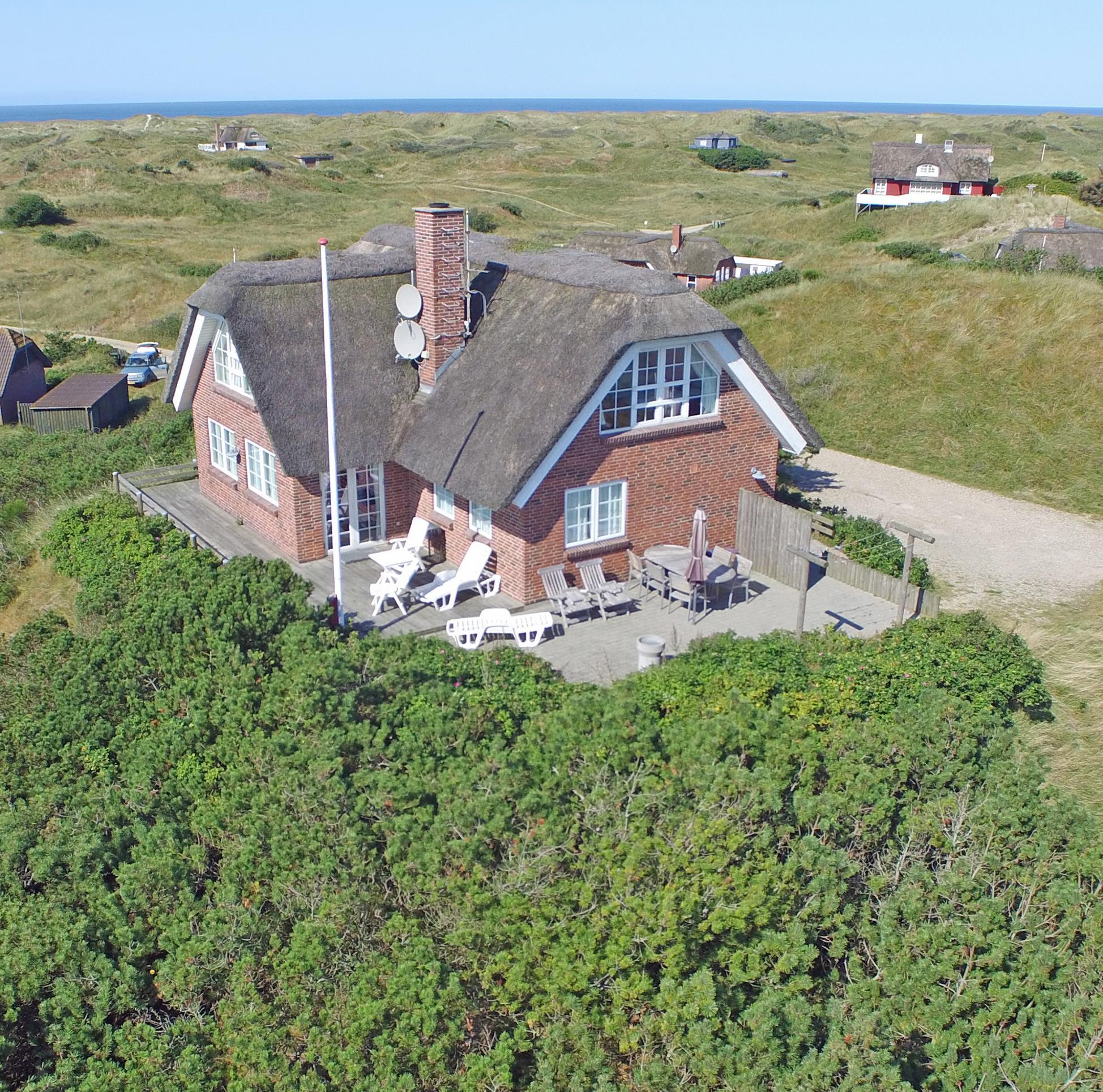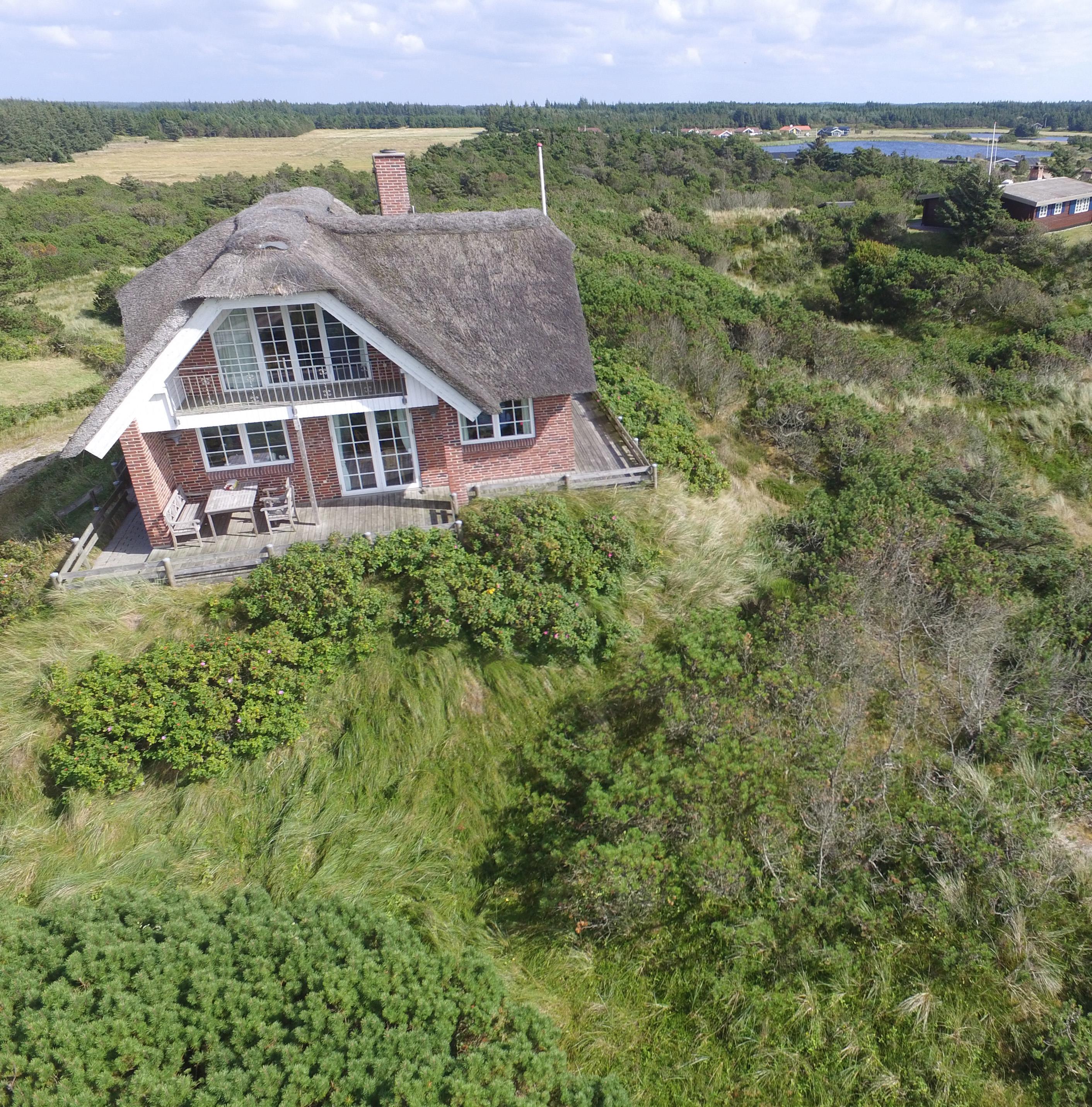 Lovely thatched cottage for 6 people, located on a high dune with a sea view, approx. 200 meters from the beach. On the ground floor: living room with wood-burning stove, television and Danish channels above the living room (summer house package), and open kitchen with dishwasher. Bathroom with shower/wc, spa and sauna. Entrance with washing machine and dryer. 3 bedrooms: DB + DB + DB. Bathroom with shower/wc. Small living room. Only 1 small dog is allowed! The dog must not be on the sofa, bed or other furniture. Smoking is not allowed.