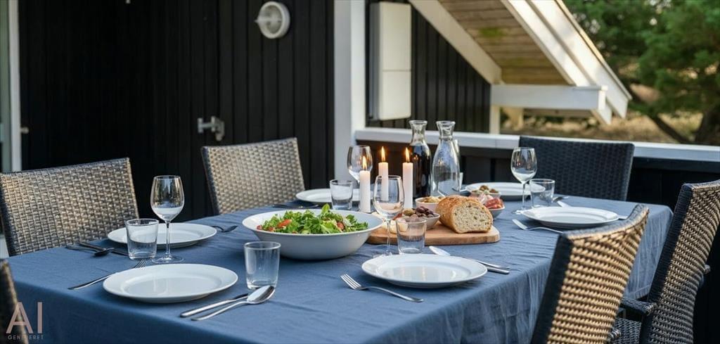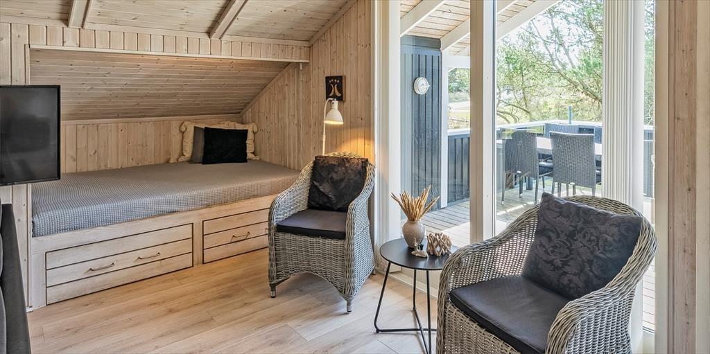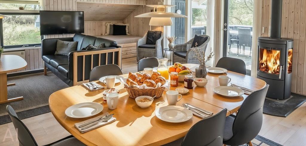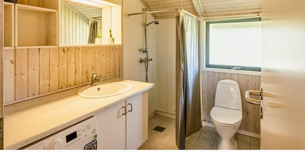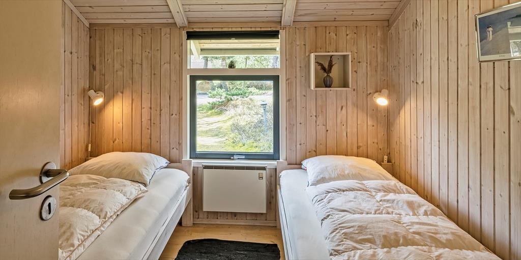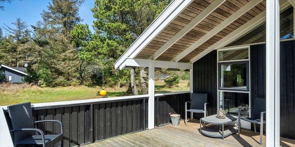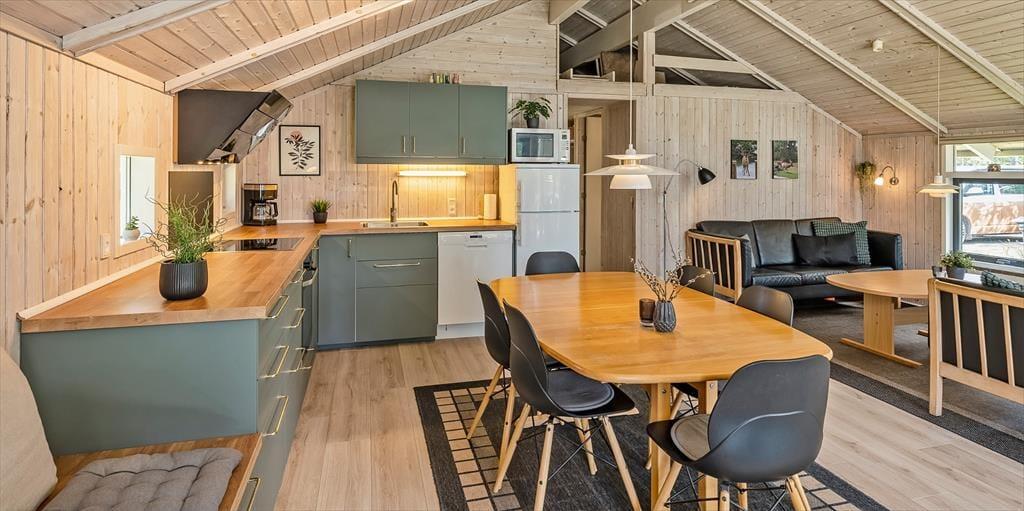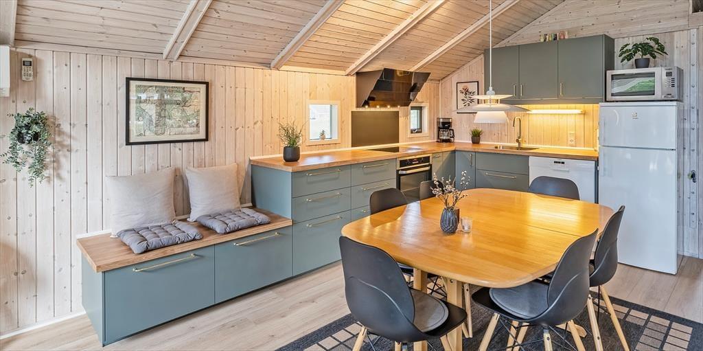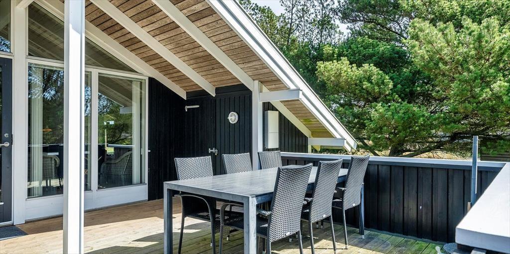 Dieses Familien freundliche Ferienhaus bietet Platz für 6 Personen und und 1,5 Km vom Strand entfernt. Auf dem grossen offenen Grundstück haben Ihre Kinder einen eigenen Spielplatz mit Schaukelstativ, Sandkasten und Bolzplatz. Das komplette Ferienhaus ist mit Holzfußboden ausgestattet. Im Wohn- und Essbereich befindet sich der Kaminofen und eine kleine kuschelige Ecke / Alkoven genannt, wo man sein Buch lesen kann und trotzdem dem Geschehen im Hause mit folgen kann. Deutsche Fernsehprogramme können über eine Parabolantenne empfangen werden. Die neue Küche ist mit einem Herd mit Cerankochfeld, einem Backofen, einer Geschirrspülmaschine und einer Kühl/ Gefrierkombination ausgestattet. Es sind 2 Schlafzimmer mit jeweils einem Doppelbett und 2 Schlafzimmer mit jeweils 2 Einzelbetten vorhanden. Ein separater Abstellraum bietet viel Platz für die Dinge, die nicht täglich im Gebrauch sind. Ein Gäste WC mit Dusche und Handwaschbecken vorhanden. Das große Badezimmer verfügt über eine Dusche, ein WC, ein Handwaschbecken und die Waschmaschine ist hier auch untergebracht. Die Terrasse ist hübsch angelegt und ein kleiner Teil ist überdacht.
