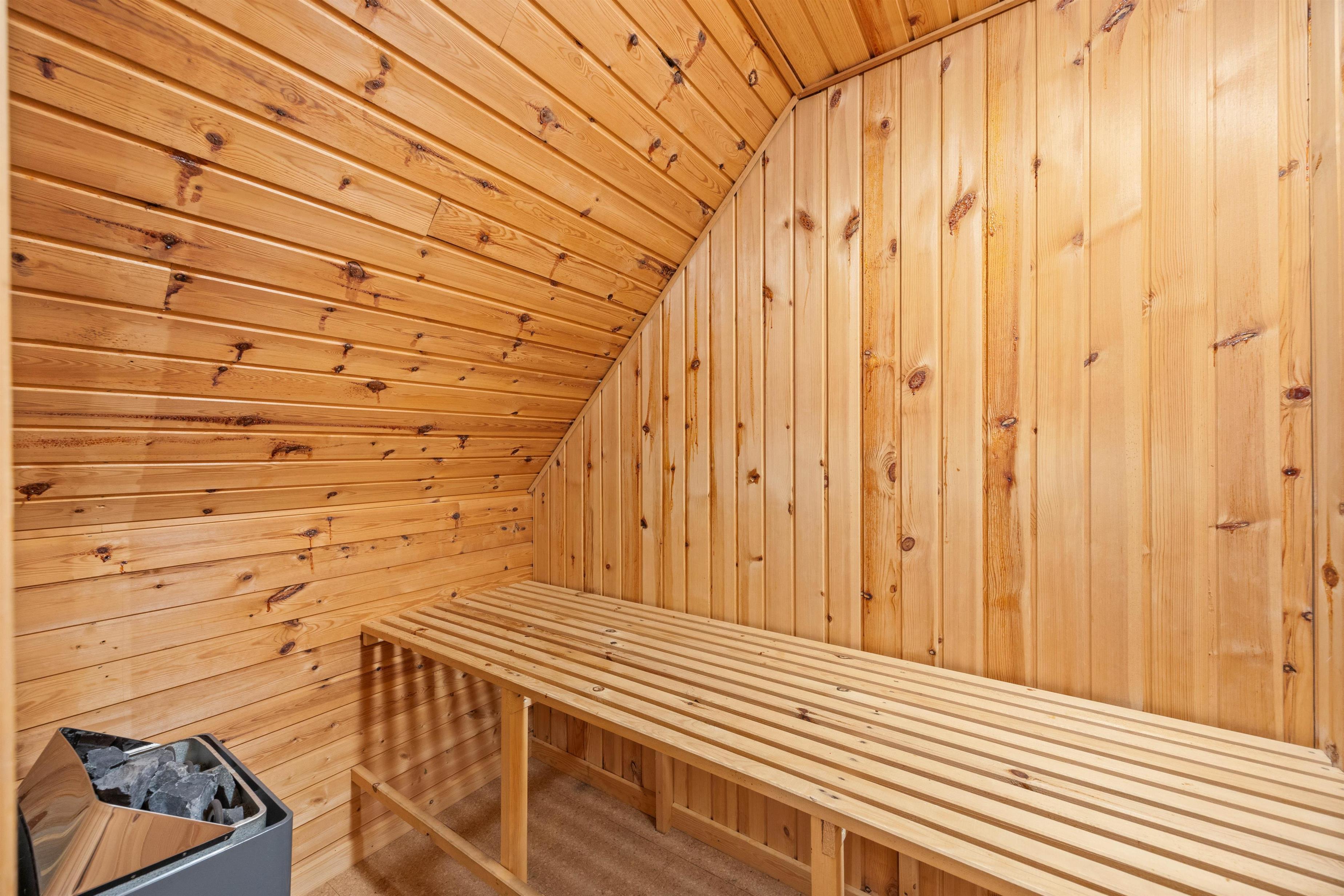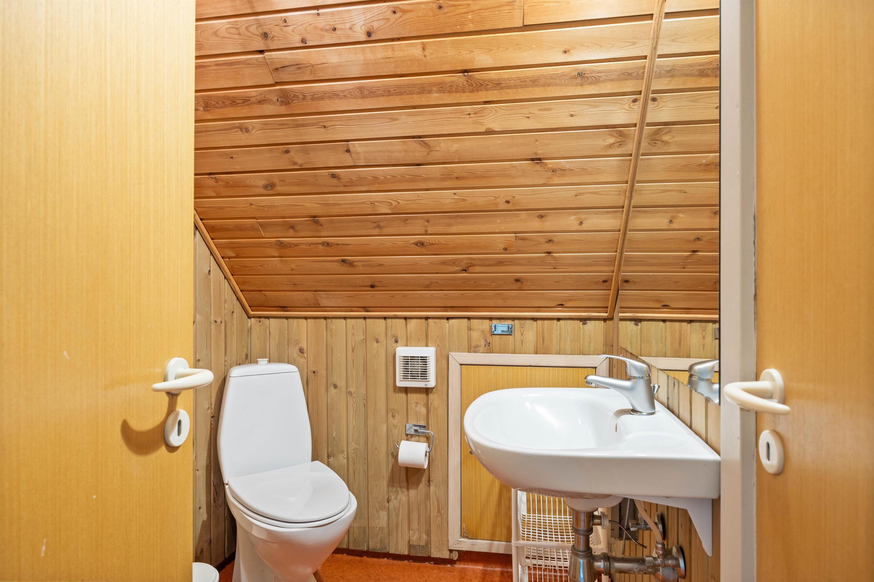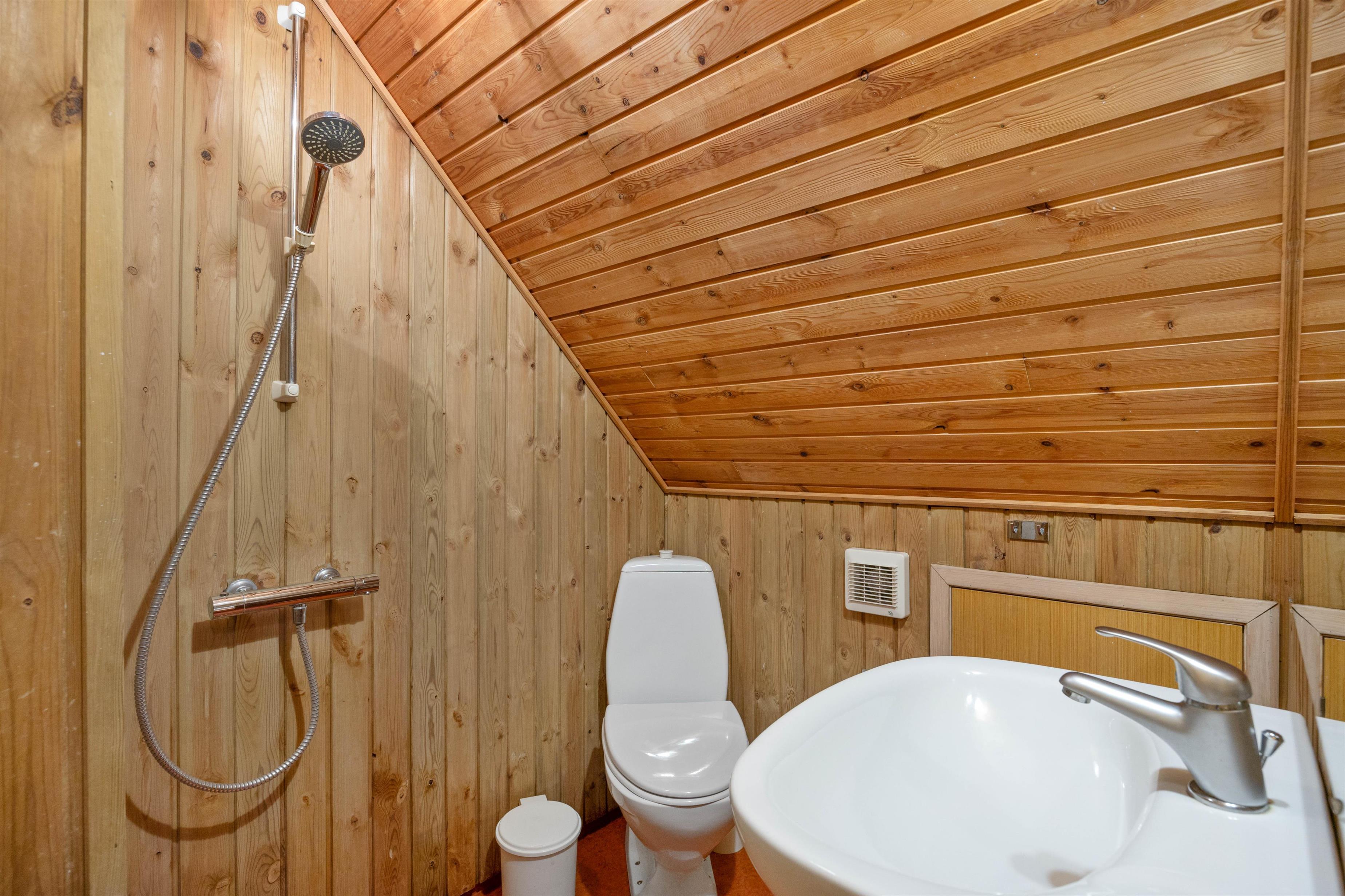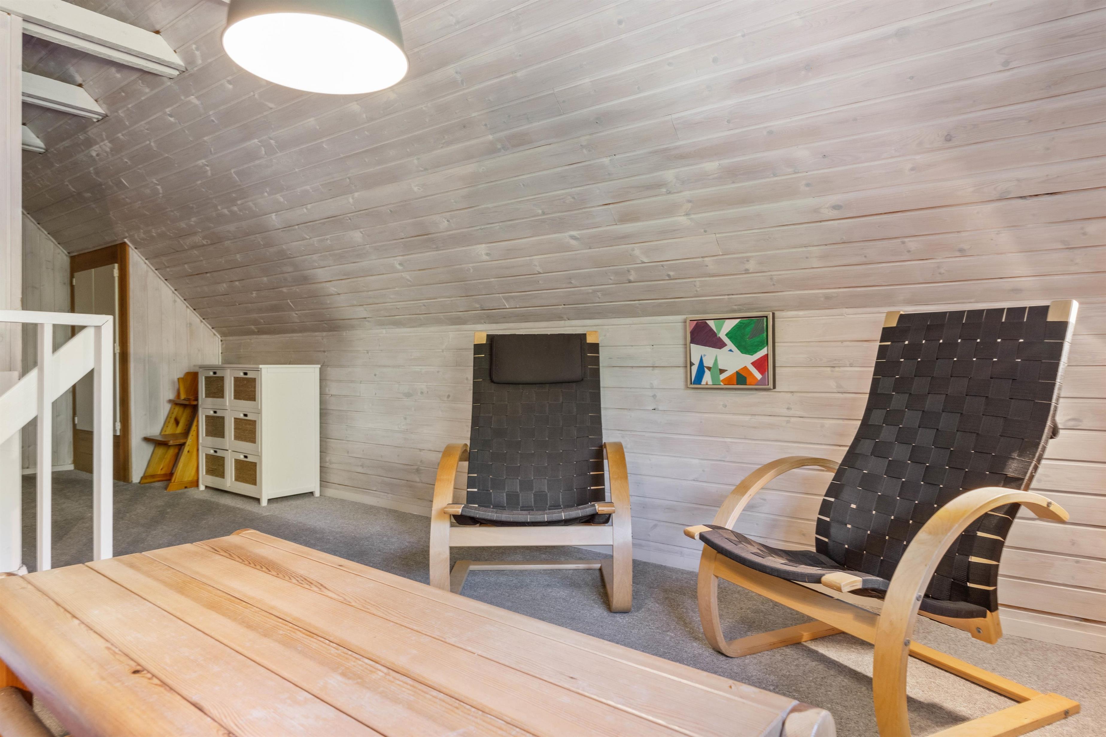 The ground floor features a living room, dining area and well-equipped kitchen. Here you can enjoy quality time together, whether cooking or spending a fun evening playing games at the dining table. No need to worry about washing up - the dishwasher takes care of that. An energy-efficient air-to-air heat pump maintains a comfortable climate, while the wood-burning stove provides extra comfort when temperatures drop.