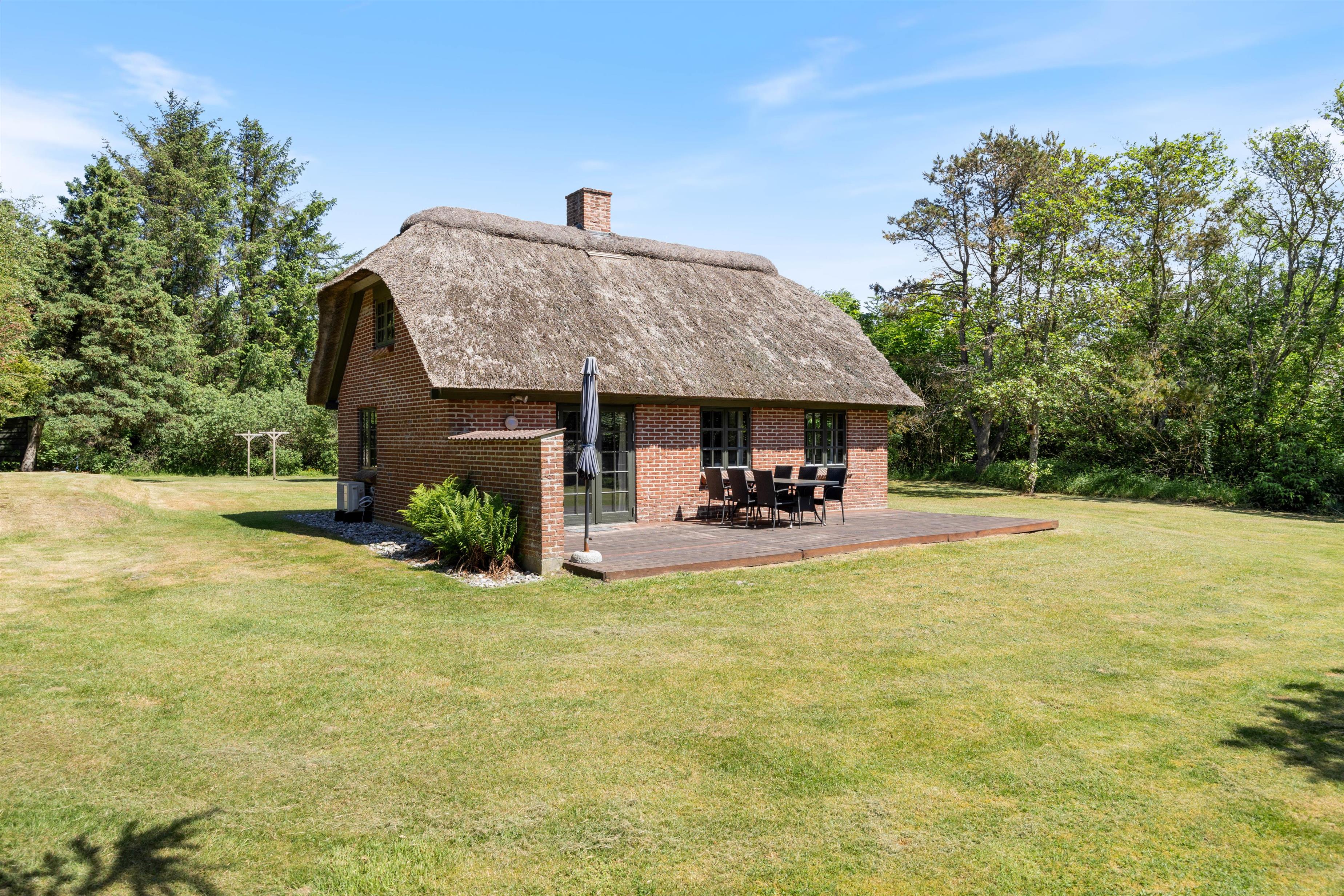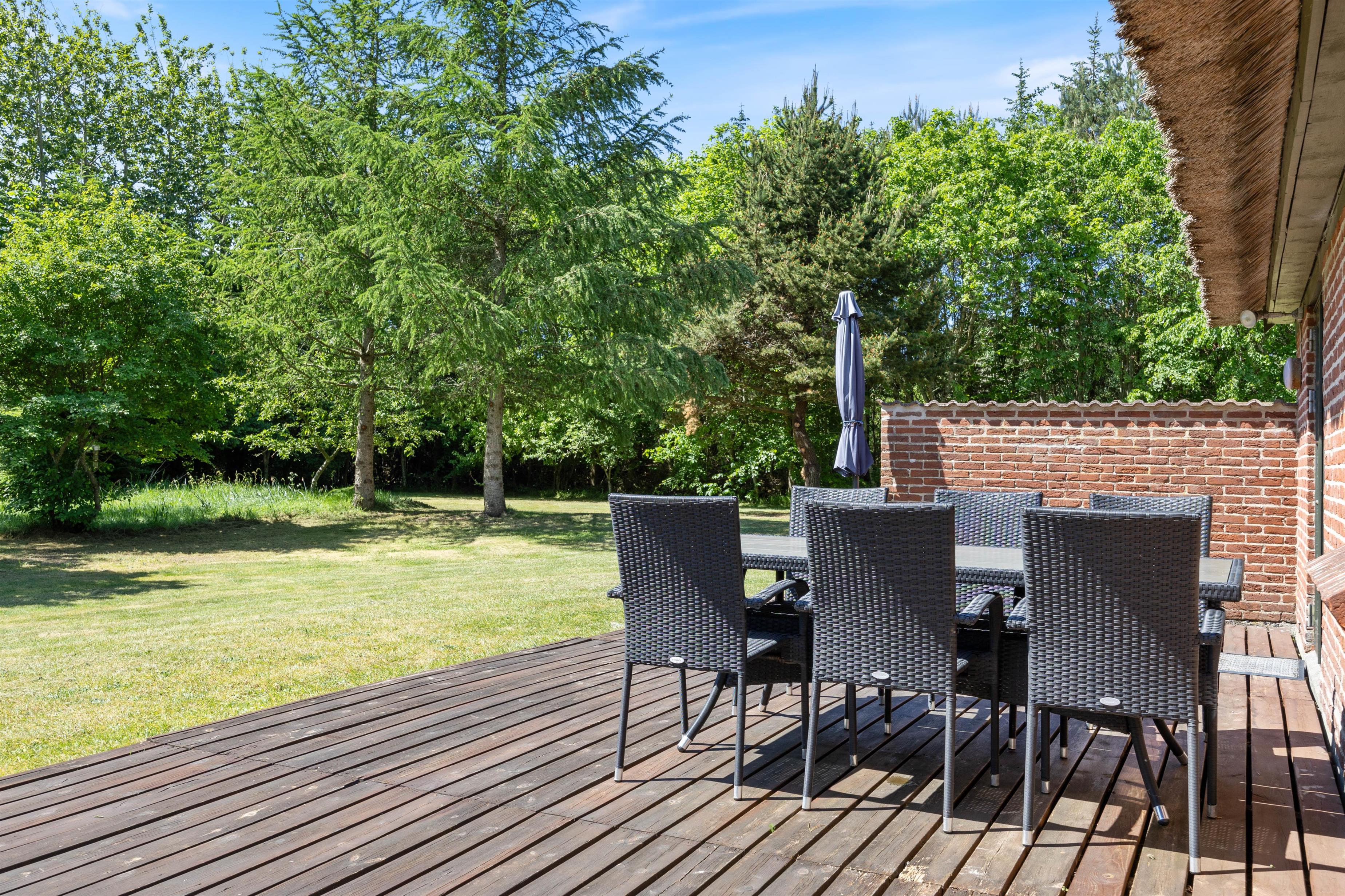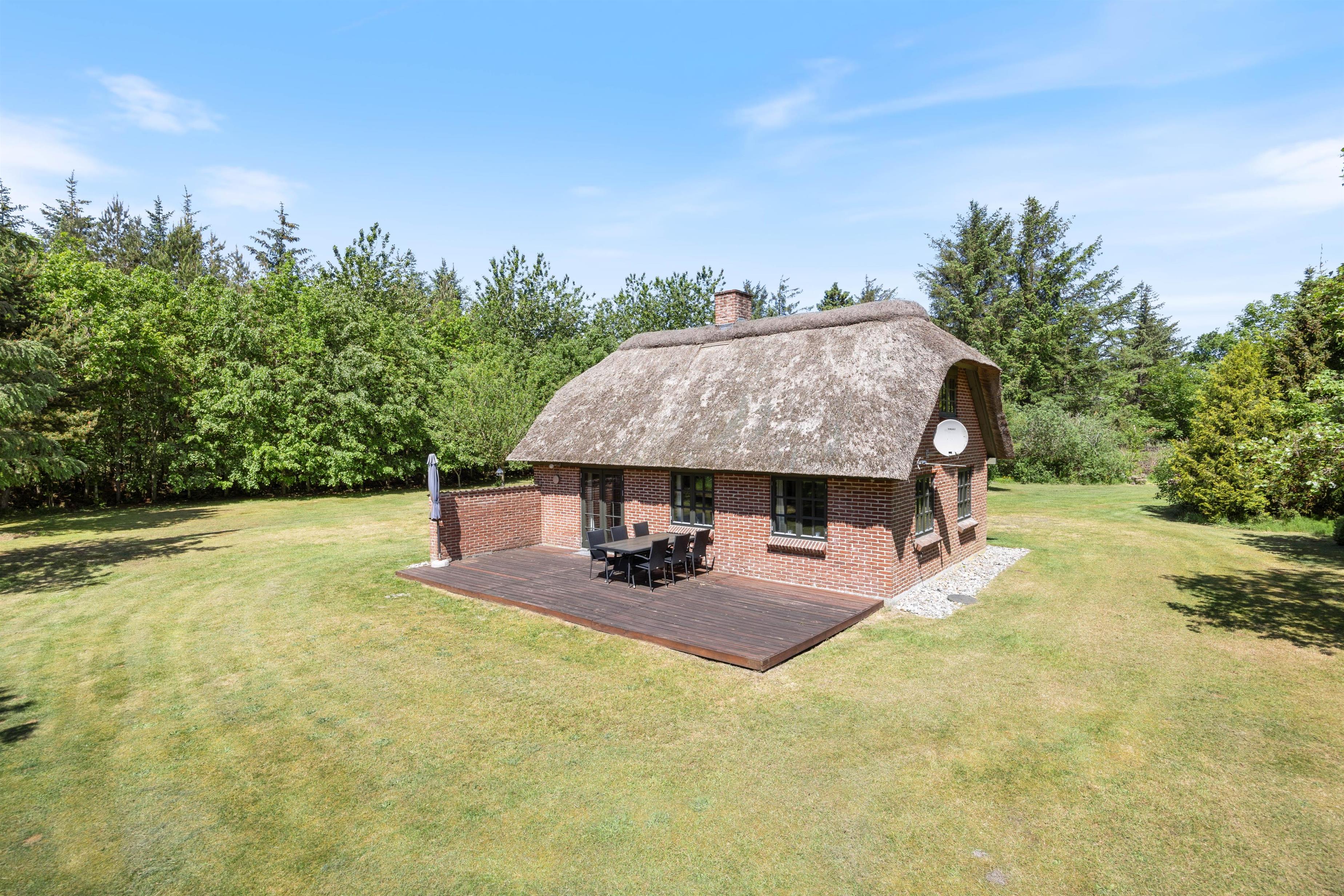 From the living room, you have access to a south-facing wooden terrace overlooking greenery. The plot is surrounded by large trees, providing excellent protection from wind and ensuring privacy. The holiday home is situated in a scenic holiday region with abundant wildlife, which you can sometimes observe from the grounds. Here you can truly unwind, perhaps enjoying an evening barbecue with refreshments.