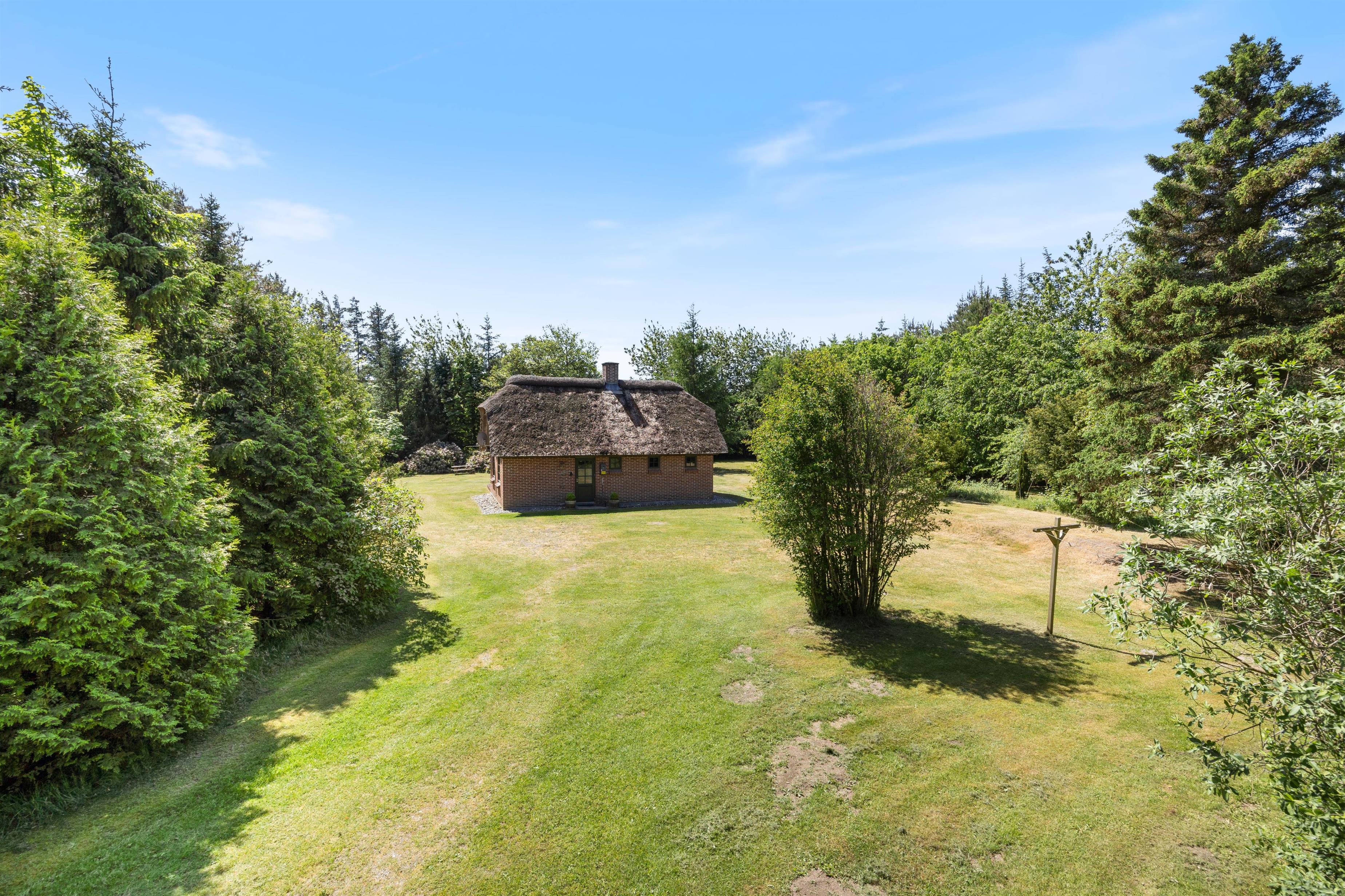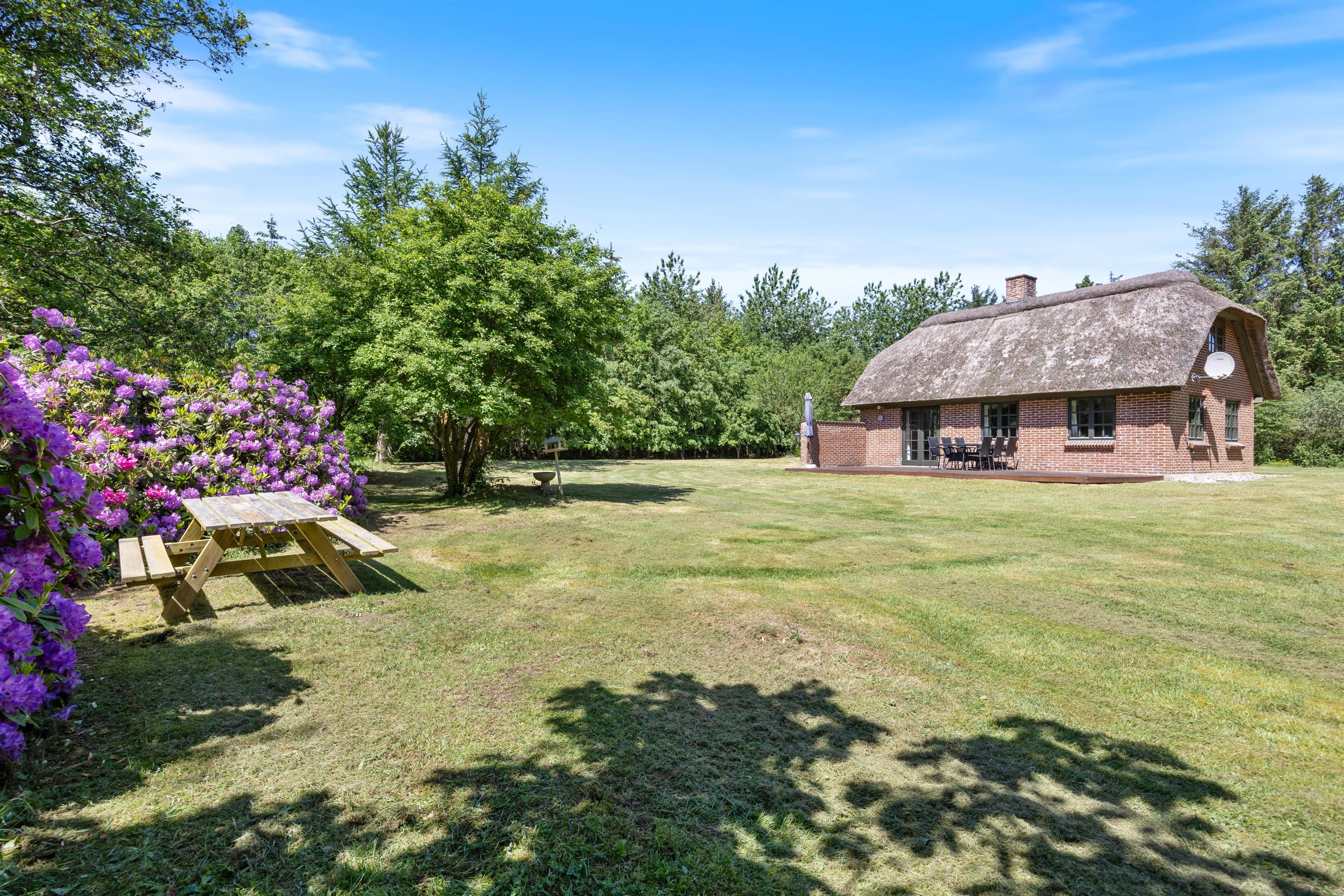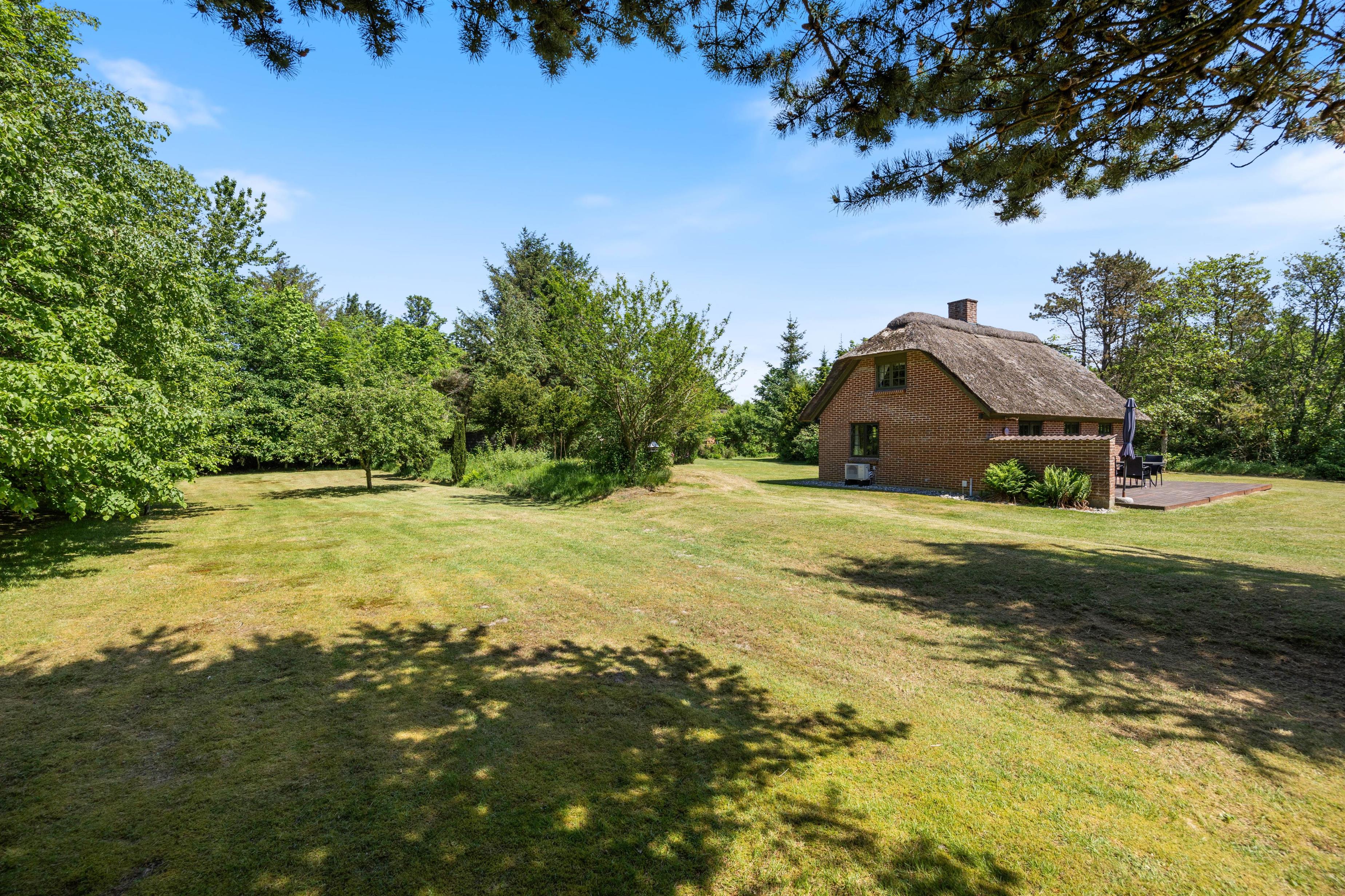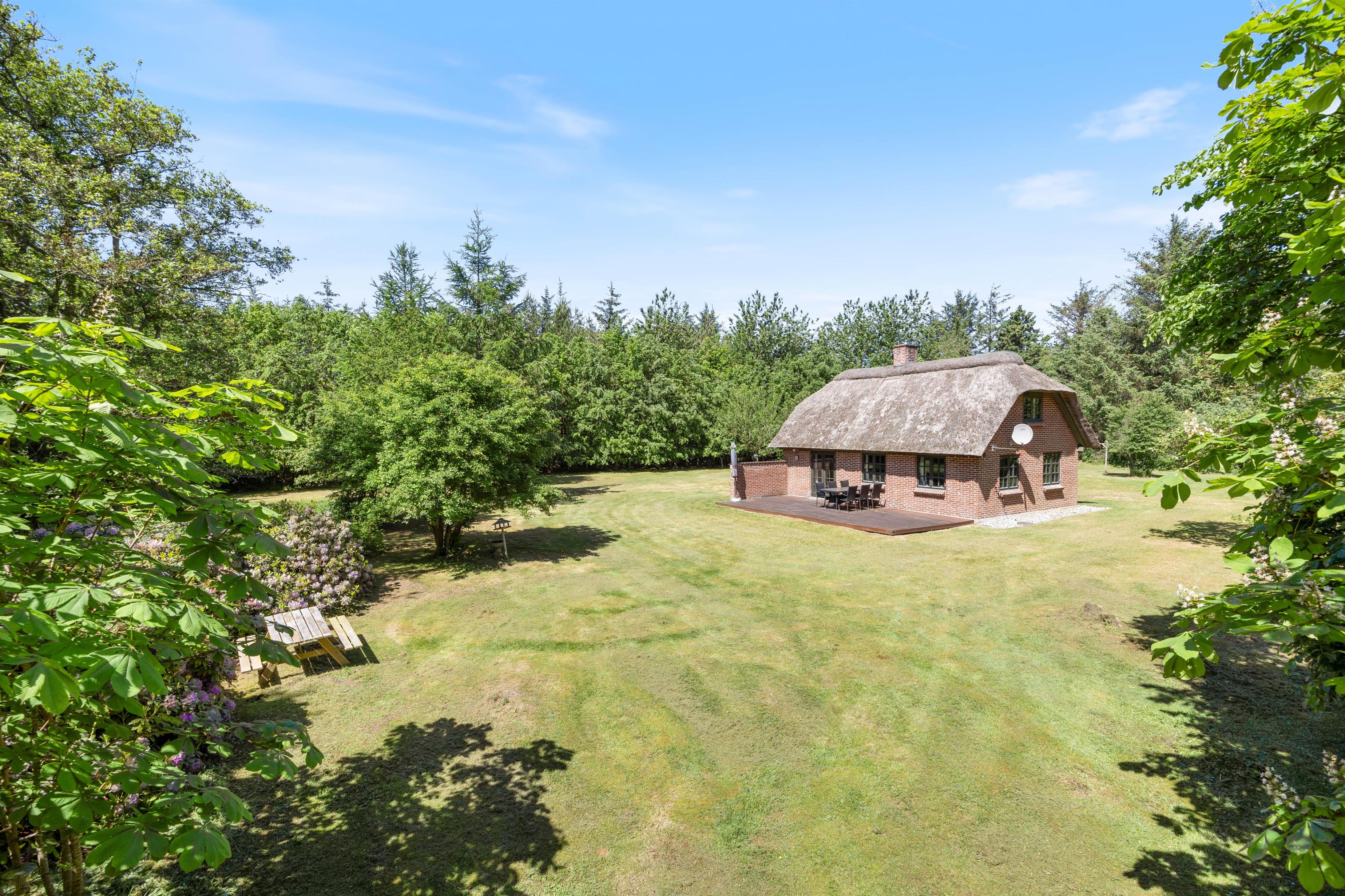 From the living room, you have access to a south-facing wooden terrace overlooking greenery. The plot is surrounded by large trees, providing excellent protection from wind and ensuring privacy. The holiday home is situated in a scenic holiday region with abundant wildlife, which you can sometimes observe from the grounds. Here you can truly unwind, perhaps enjoying an evening barbecue with refreshments.