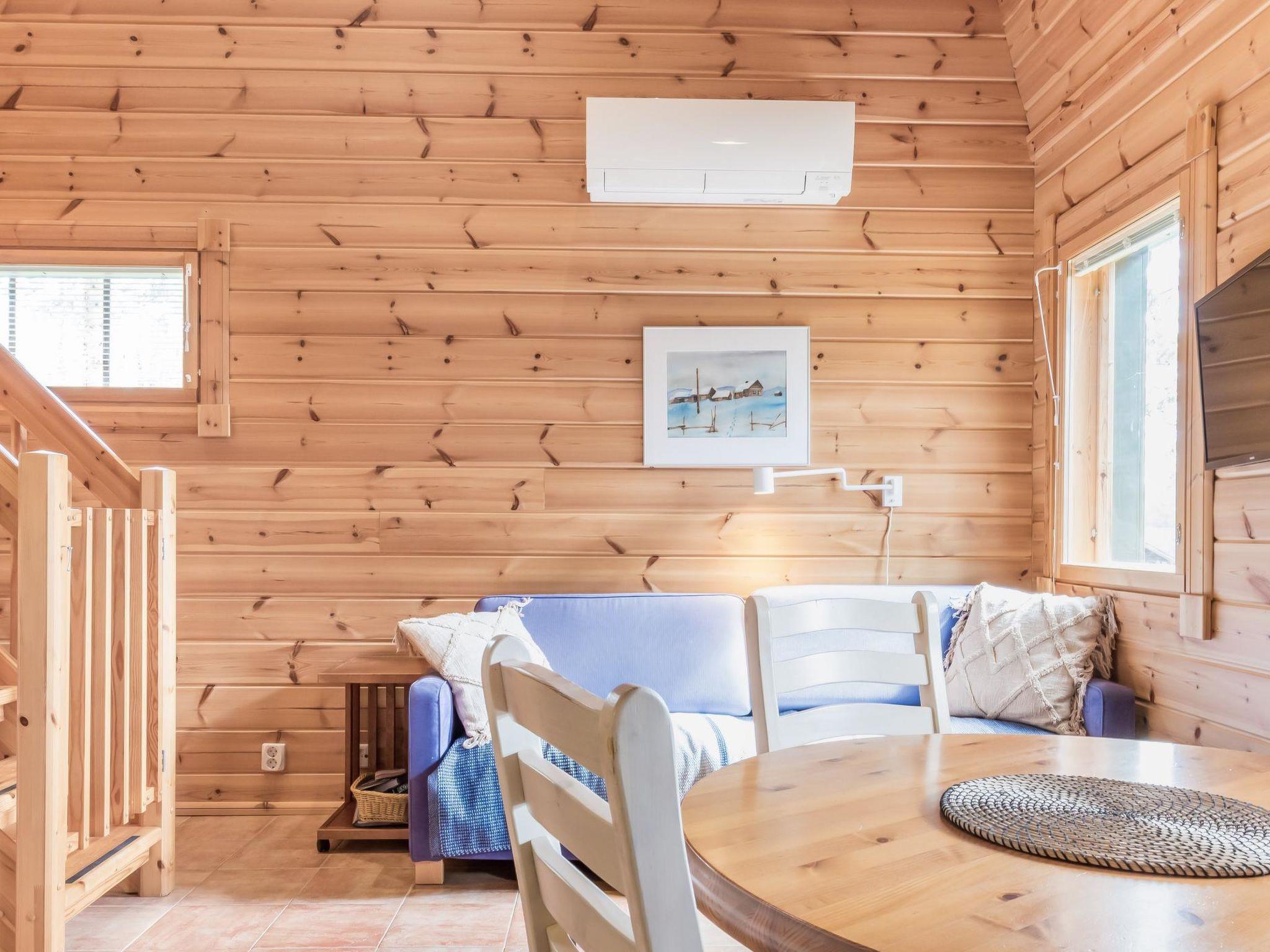 Upstairs one bedroom with a double bed, lobby with two separate beds and two easy-chairs as extra beds. Air sourced heat pump.