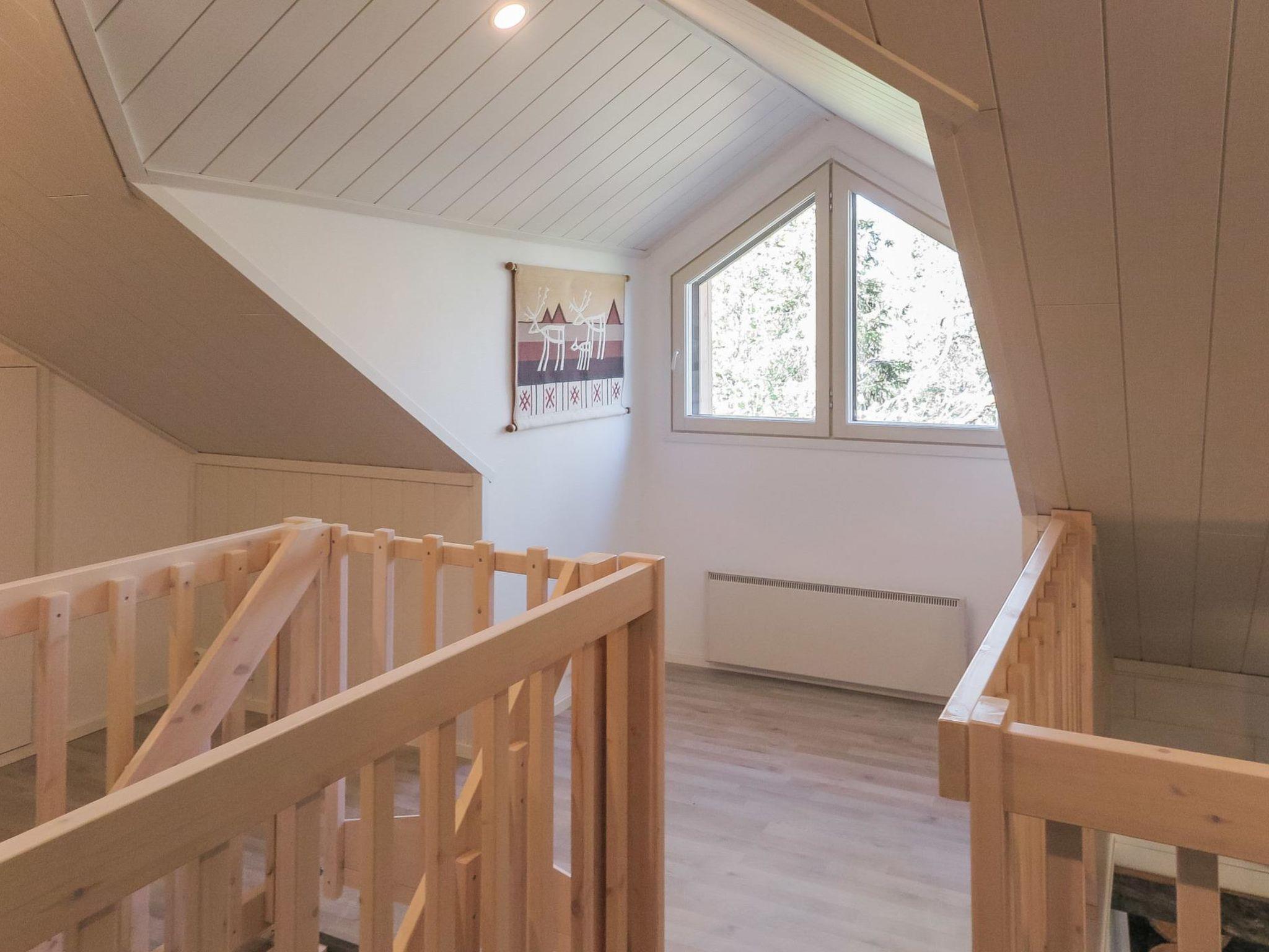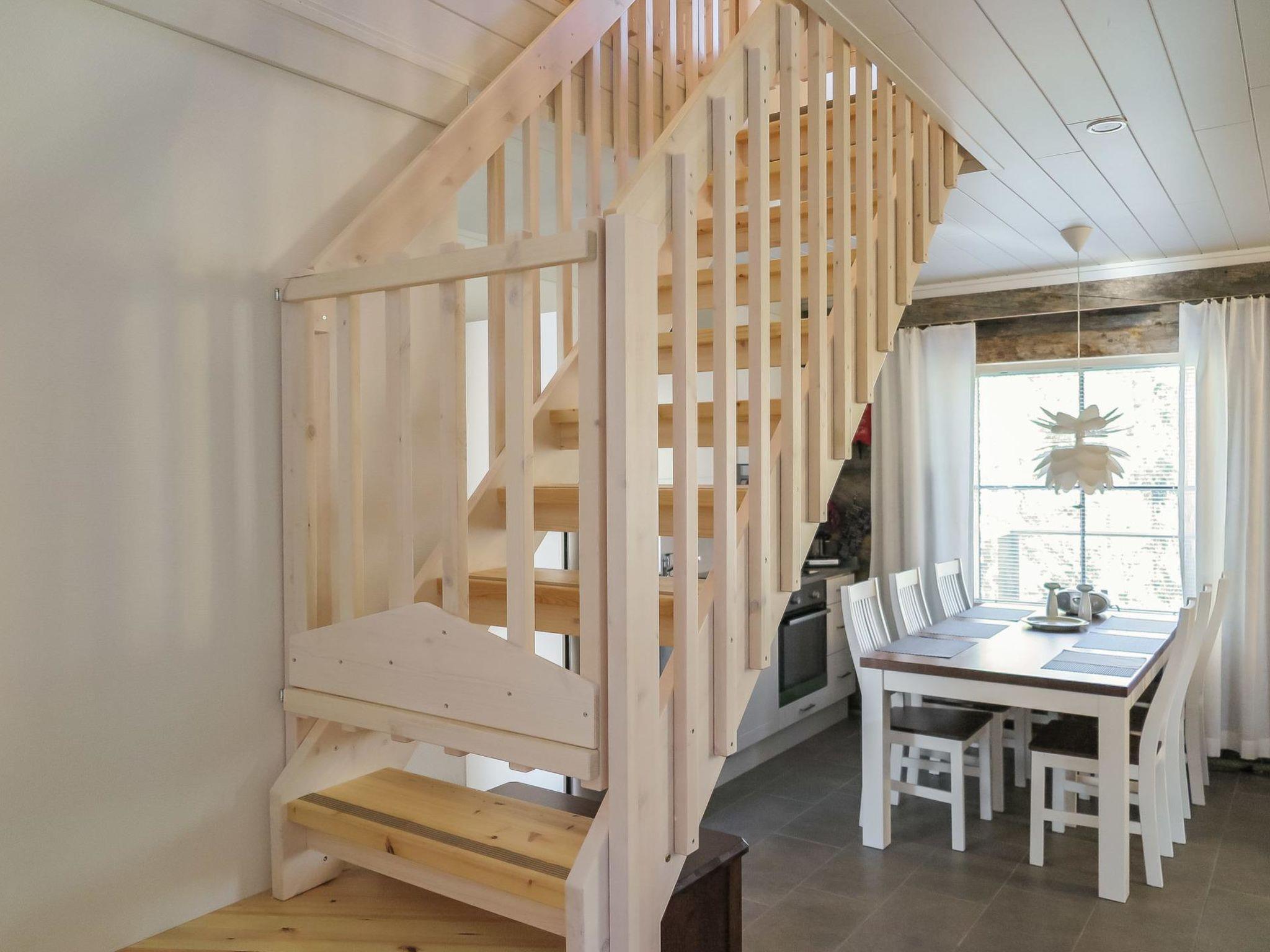 40 km north of Kolari, Lake Äkäslompolojärvi 2.5 km, swimming shore 2.5 km. Silverlog row house apartment built 2017. Area 78 m² of which 19 m² on the loft Living room/kitchen, 2 bedrooms, both with 2 separate beds, in sleeping loft 2 separate beds, sauna (electric stove), 2 separete wc (another on sleeping loft). No pets allowed in apartment. Ski maintenance room in shared use in the basement.