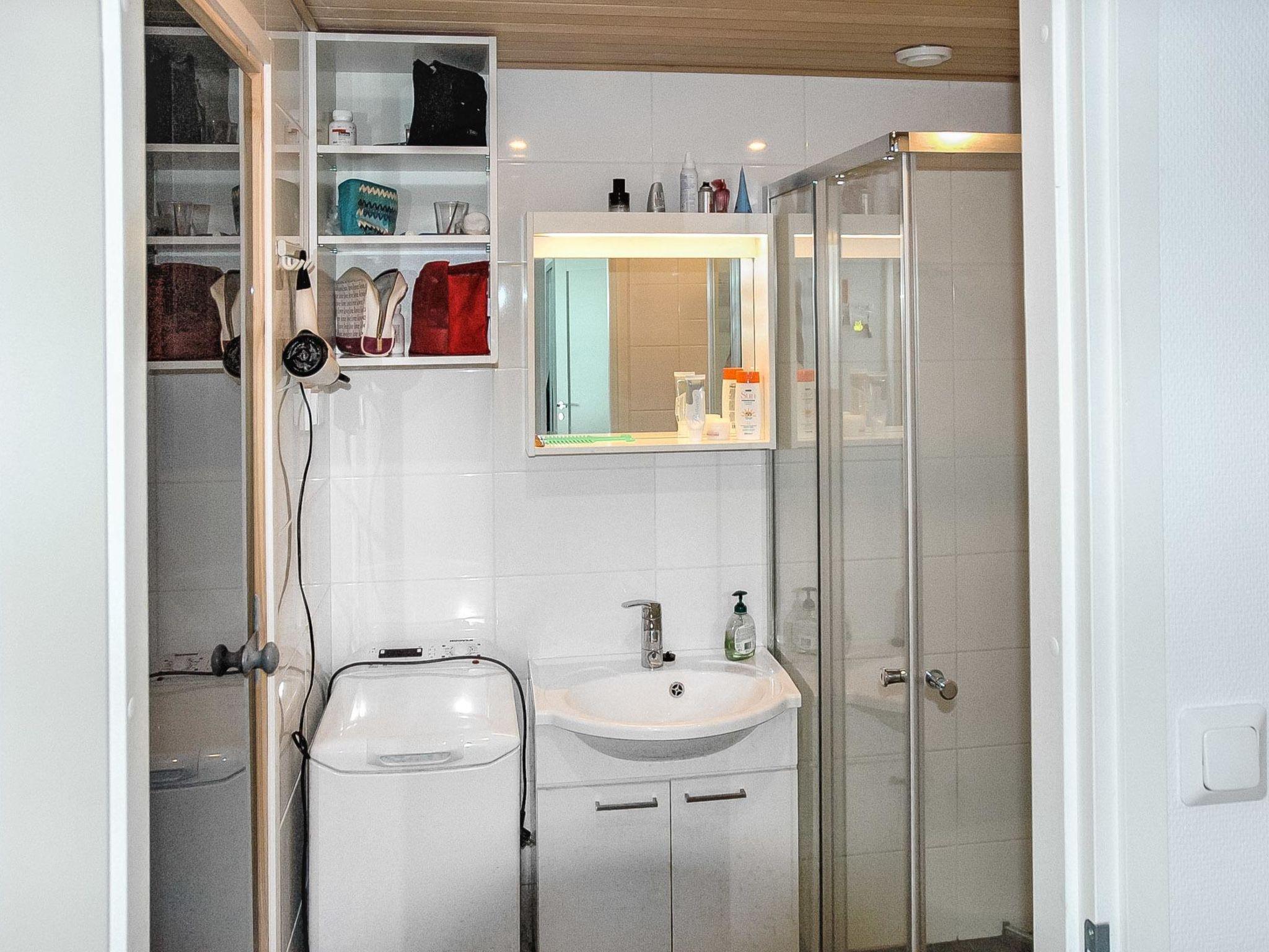 Living room/kitchen, one bedroom with two single beds, 3 single beds in the loft, sauna (electric sauna stove), washroom, 2 x WC (one in the loft and the another in the washroom). The housing company's shared ski maintenance and storage facilities are located in the basement. Entrance from the outside.