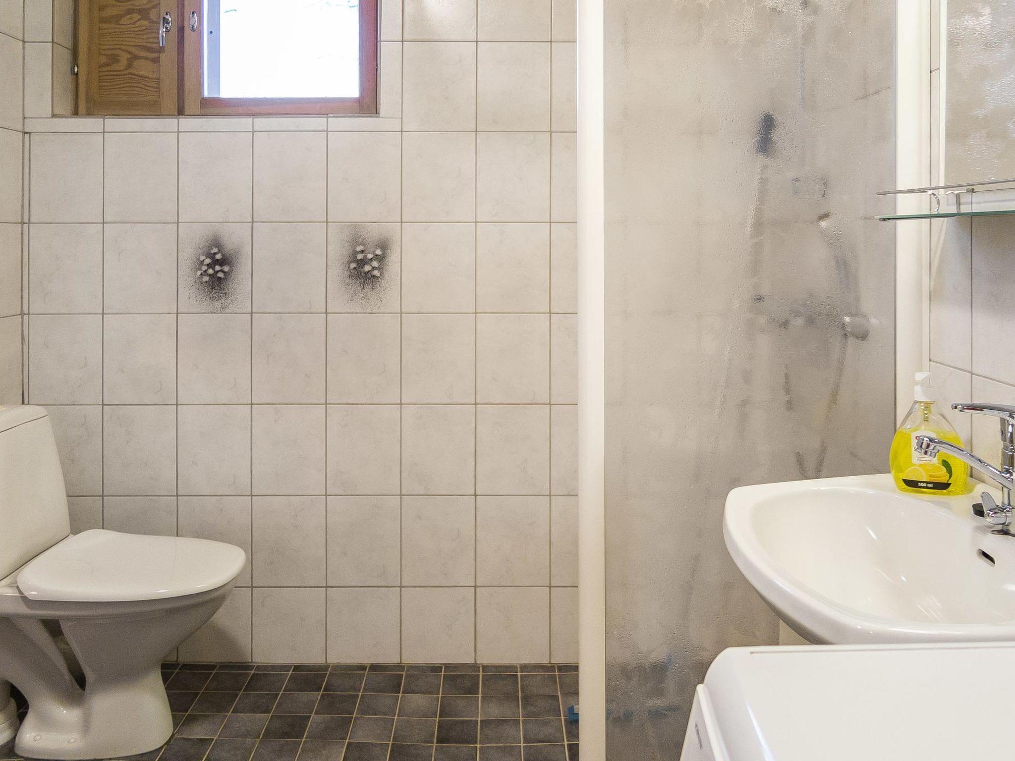 A semi-detached apartment in Äkäslompolo. Downstairs there is a kitchen-living room, a bedroom with two single beds, an electric sauna, a bathroom with a toilet and a separate toilet. Upstairs there are two bedrooms, each with two beds.