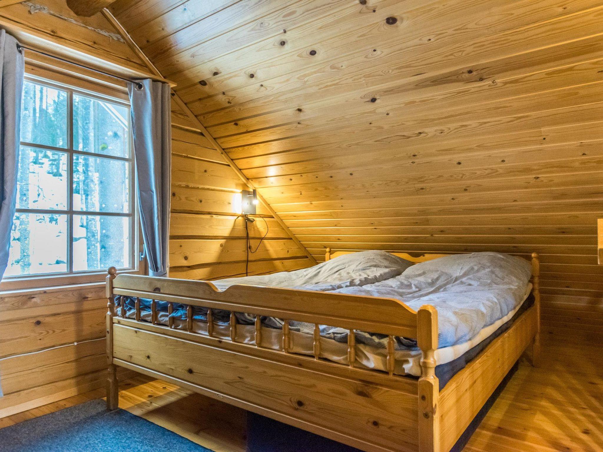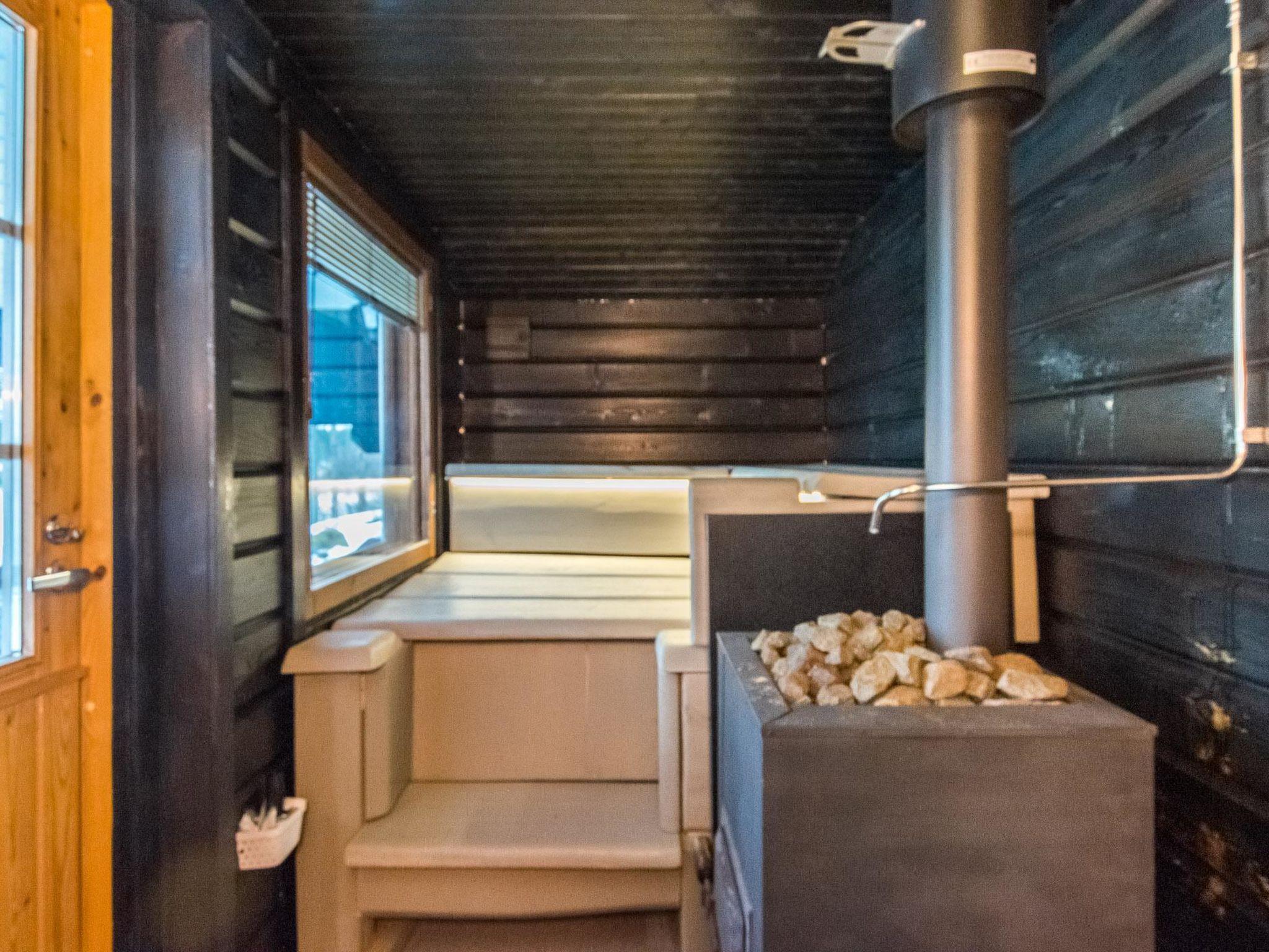 The separate 32 m² wood-heated sauna by the lake includes a dressing room with a fridge/freezer compartment. The washroom has a shower and hand basin. The sauna features a wood-heated stove, with dark walls and light benches creating a peaceful atmosphere. Windows provide a lovely view of the lake and yard. The lakeside sauna includes two sleeping areas – one with a double bed, the other with a 120 x 200 cm bed, and an air source heat pump. Bedside lights here also have USB-A ports.