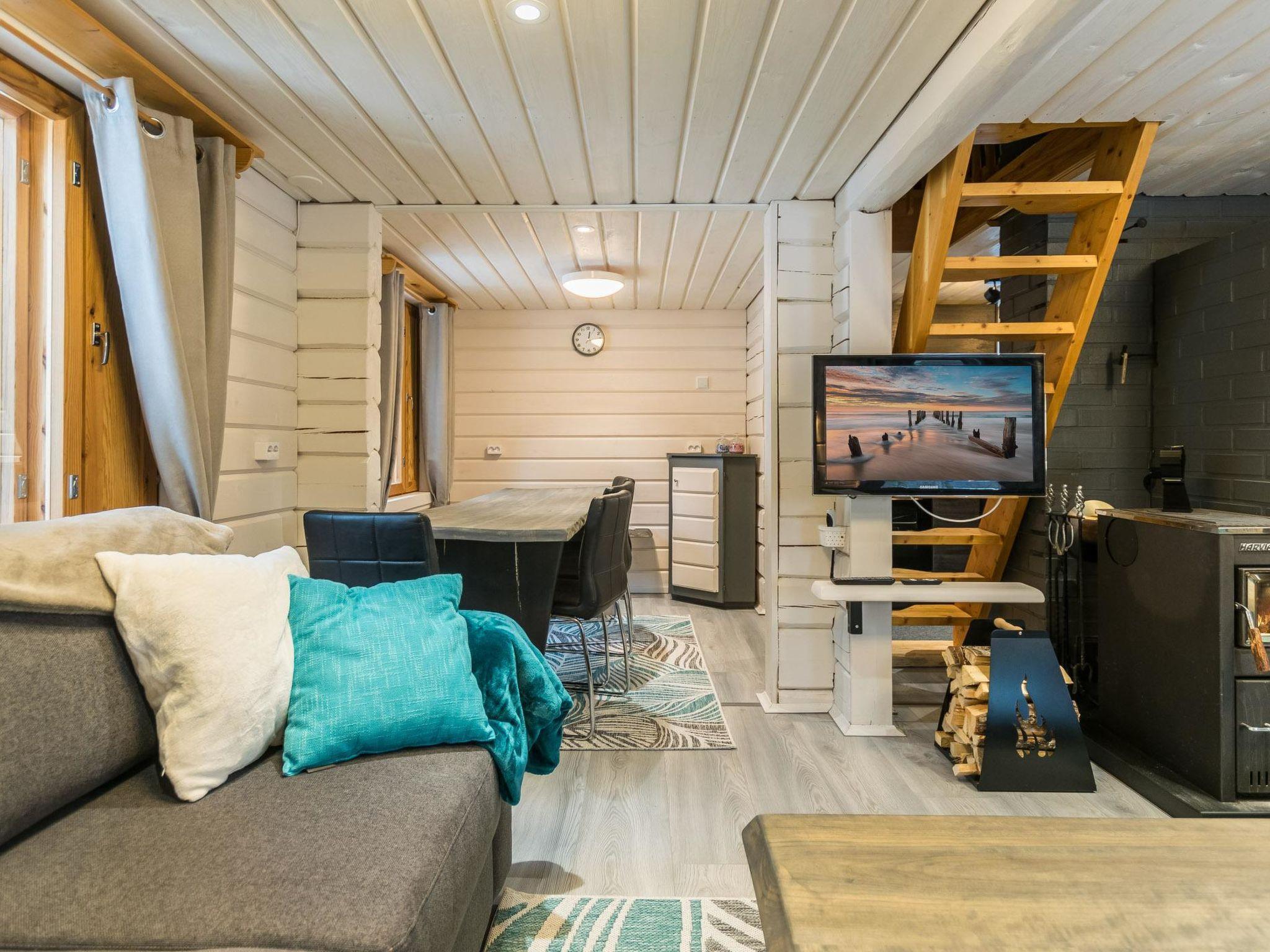 The cabin includes two sofas, a heat-storing fireplace, a wood stove, Google TV, and an air source heat pump. A long dining group seats eight. The stylishly furnished kitchenette is well-equipped for preparing and serving meals. The washroom has a shower cubicle and a WC.